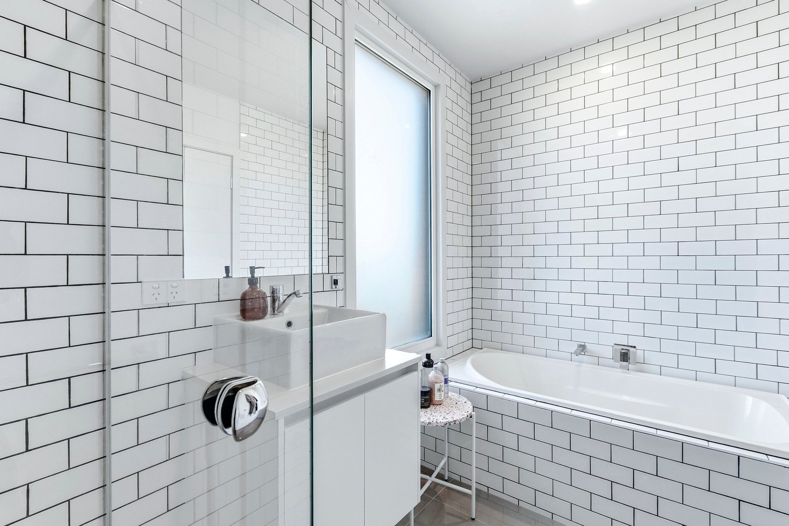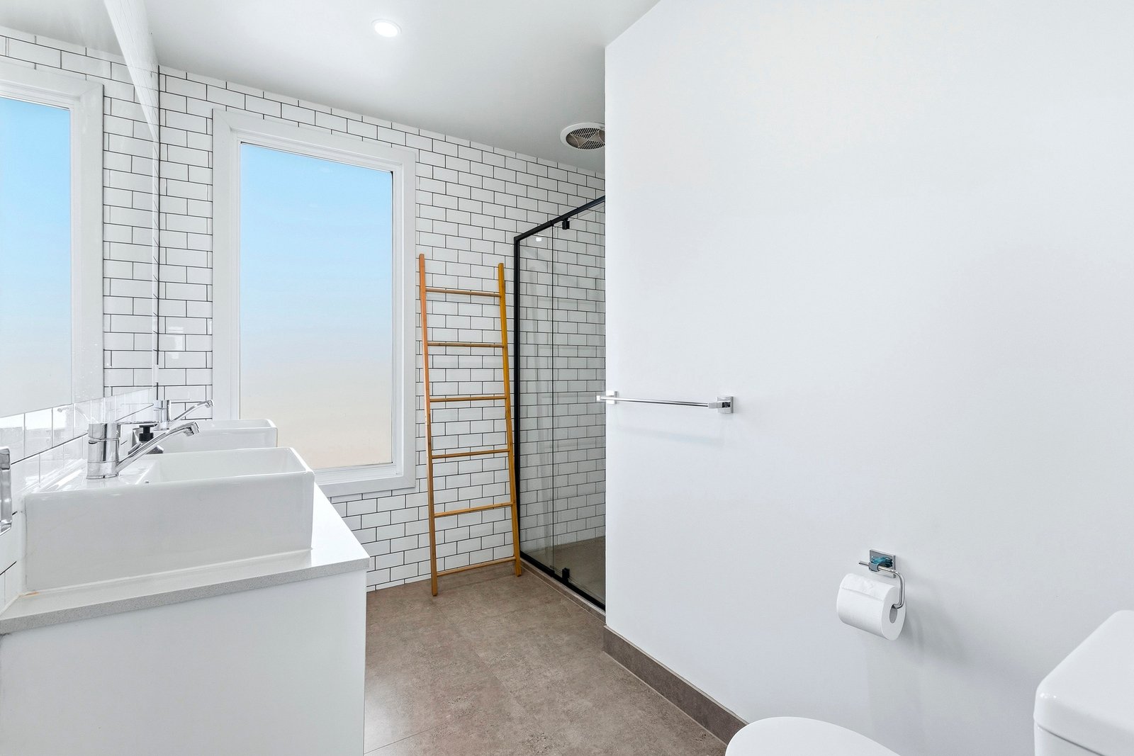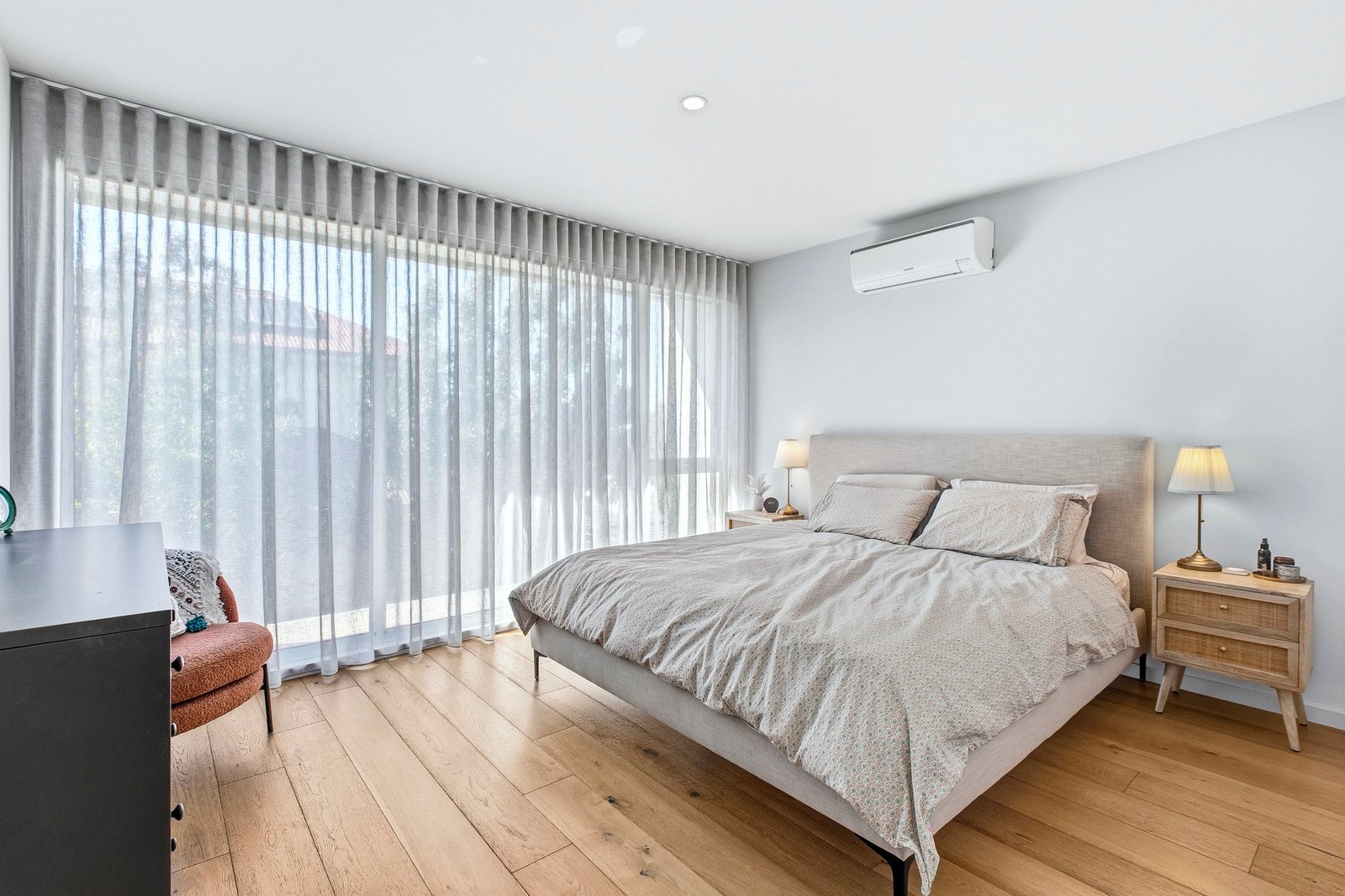 Upstairs, the accommodation is well considered. The main bedroom feels like a true retreat with its walk-in robe and private ensuite, while the second bedroom with built-in robes is serviced by a central bathroom complete with bath. Both bathrooms carry a timeless aesthetic with floor-to-ceiling tiling and a fresh, neutral palette.