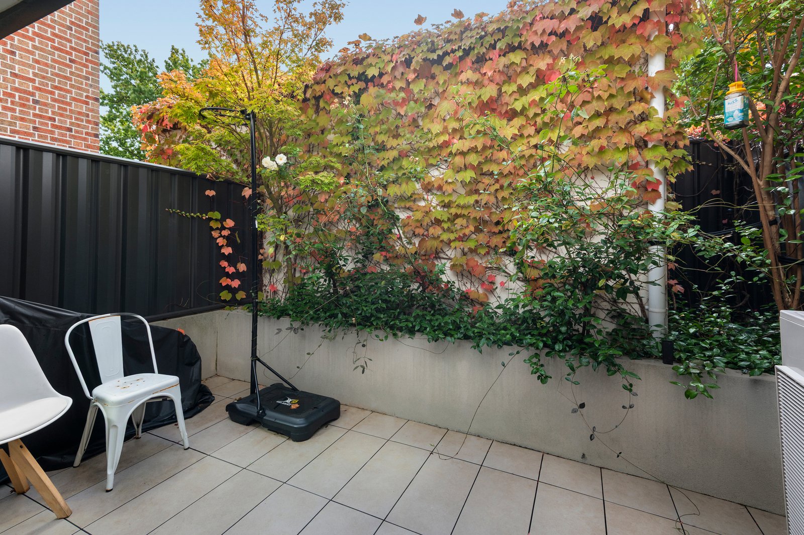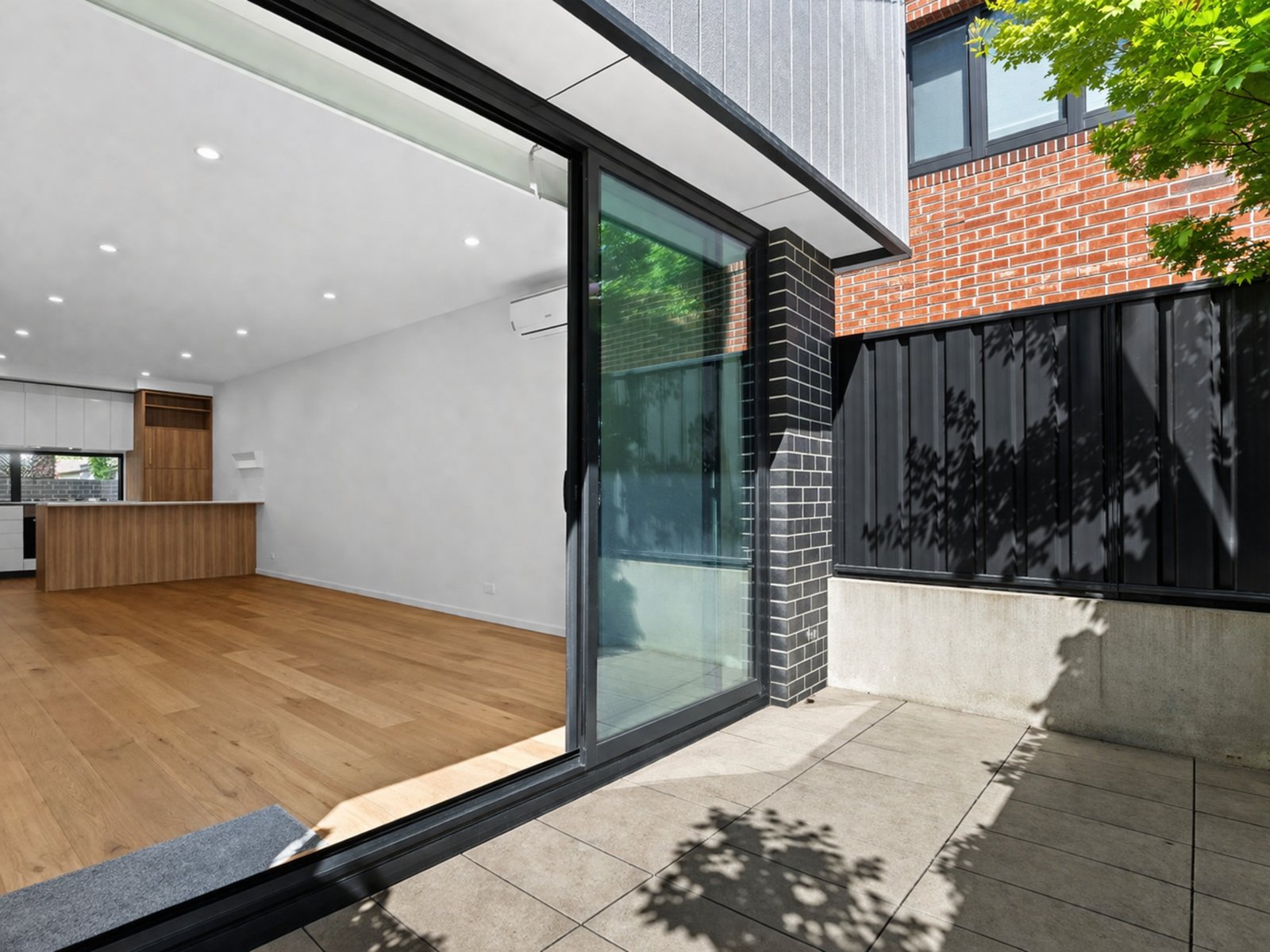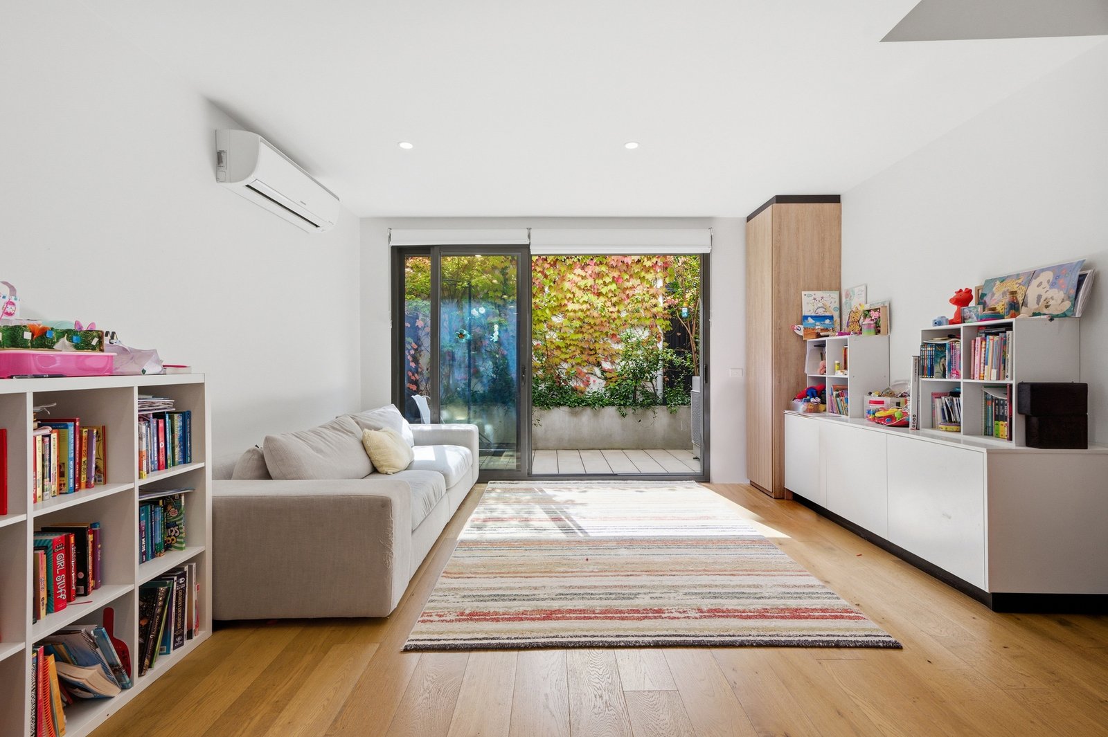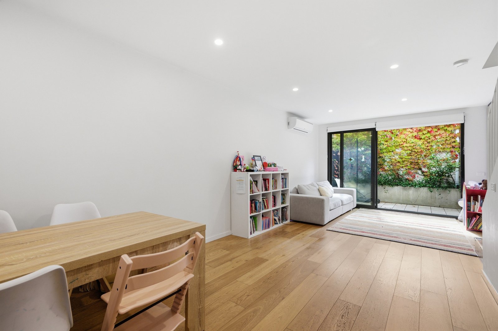 On the ground floor, open-plan living and dining seamlessly connect with a contemporary kitchen appointed with stone benchtops, stainless steel appliances including dishwasher, and ample storage. A guest powder room adds further practicality, while the north-facing private courtyard provides a leafy, sun-filled outdoor setting ideal for entertaining or relaxing.