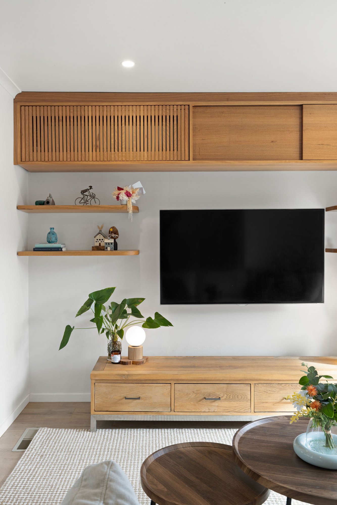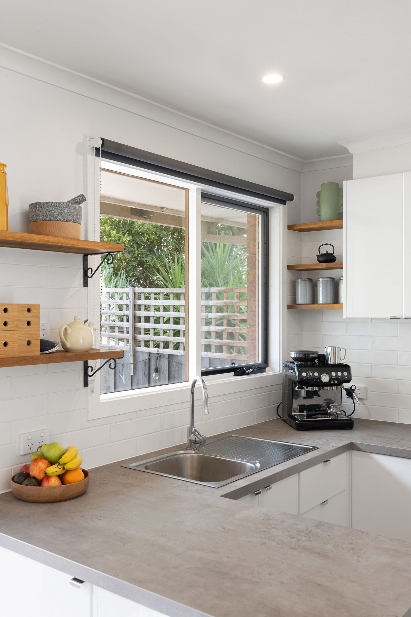 Stepping outside, a generous wraparound courtyard provides exceptional space, further enhanced by a timber deck perfect for entertaining or relaxed enjoyment. Inside, the living area is fitted with floating shelves, adding both character and practical storage, while a separate shed offers additional flexibility.