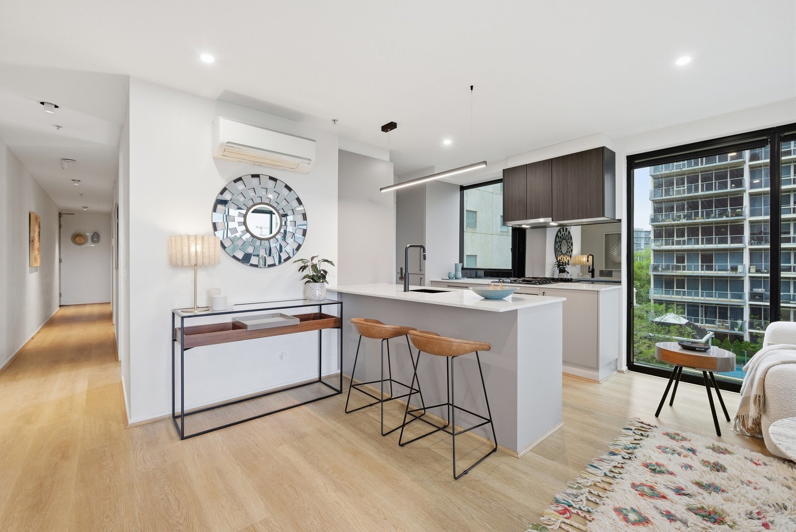 Designed for effortless modern living, this apartment is ideal for professionals, first home buyers or investors seeking space, light and lifestyle. The well-appointed kitchen features stone benchtops, a sizeable island and quality appliances, while reverse cycle heating and cooling ensures year-round comfort. Full-height, double-glazed windows help maintain a peaceful interior setting, and a covered balcony extends the living zone, perfect for entertaining or relaxing with elevated views. Residents also enjoy access to exceptional resort-style amenities including a gas-heated rooftop pool, fully equipped gym and expansive terrace capturing sweeping views of the lake, bay and CBD, along with secure keyless entry, on-site management and ample visitor parking.