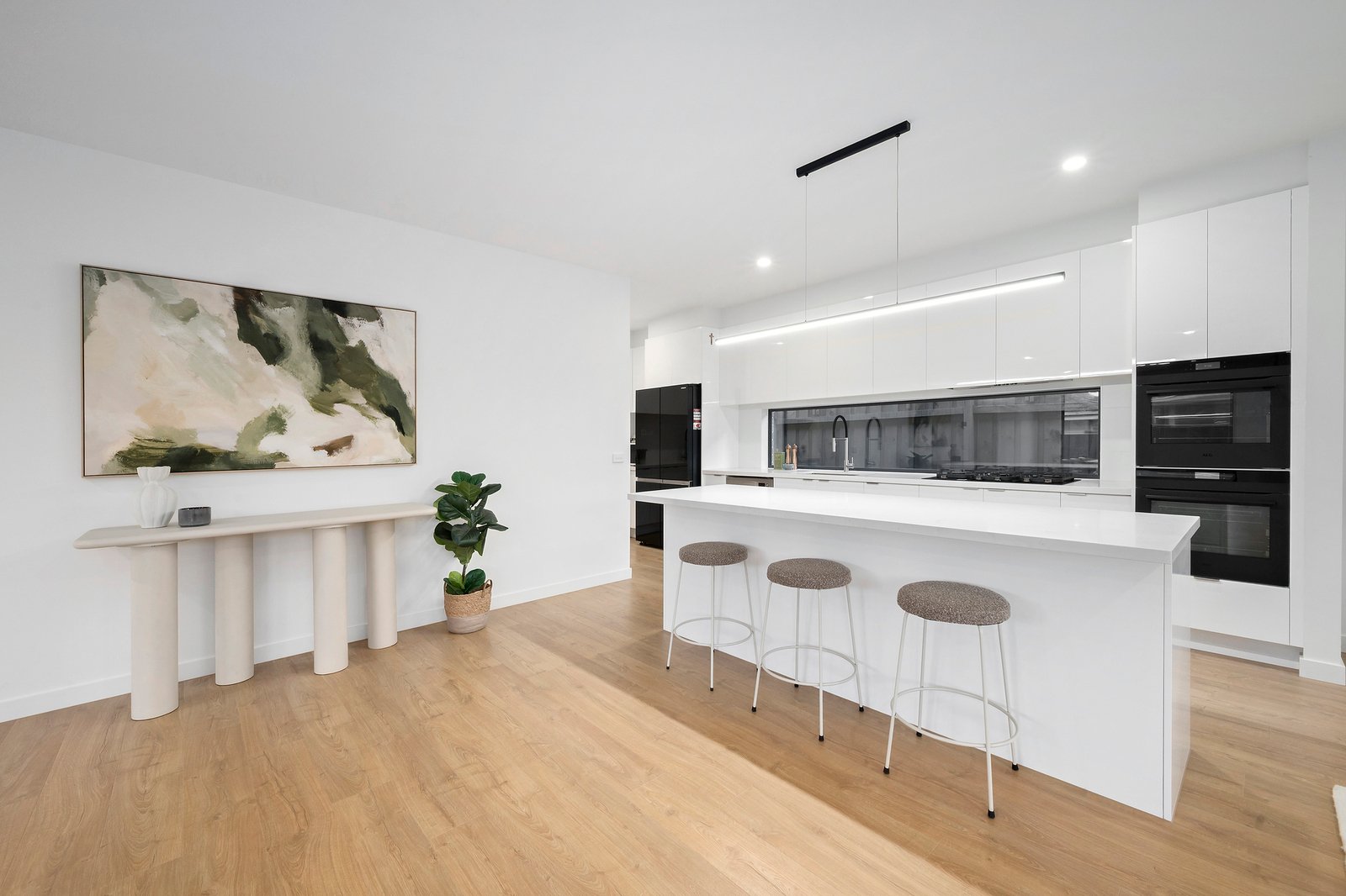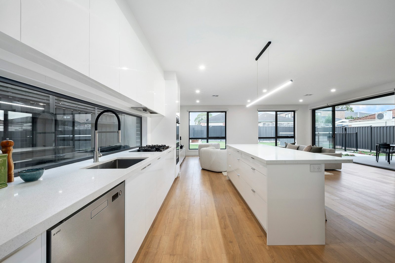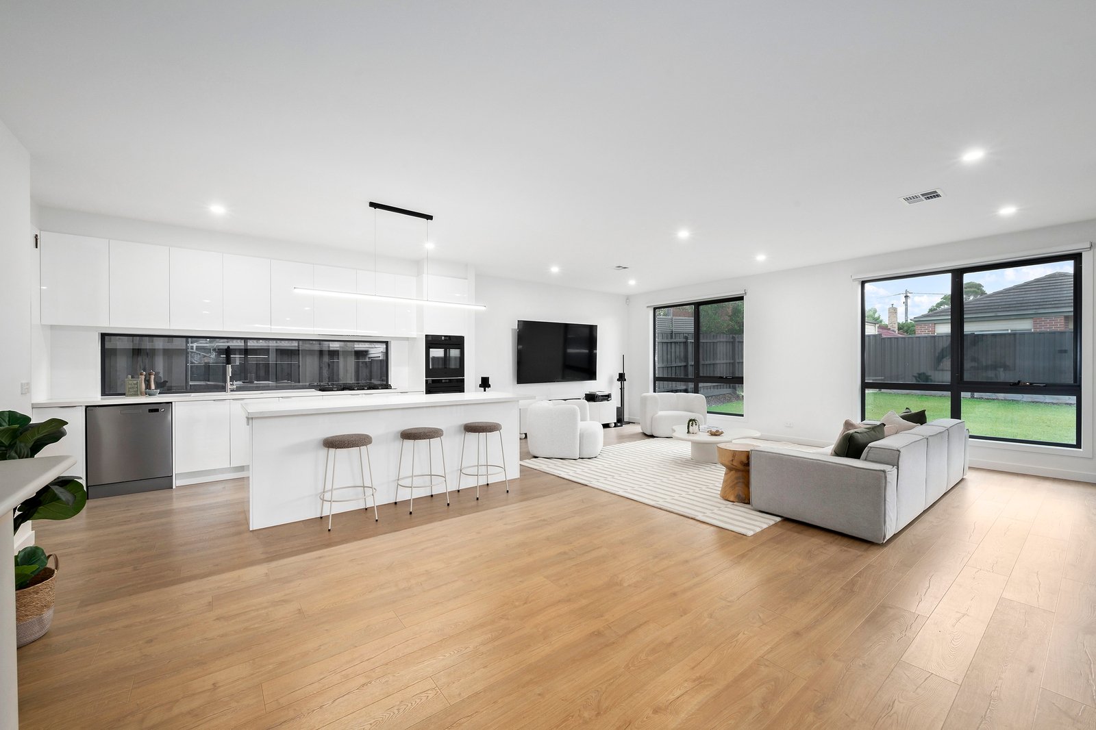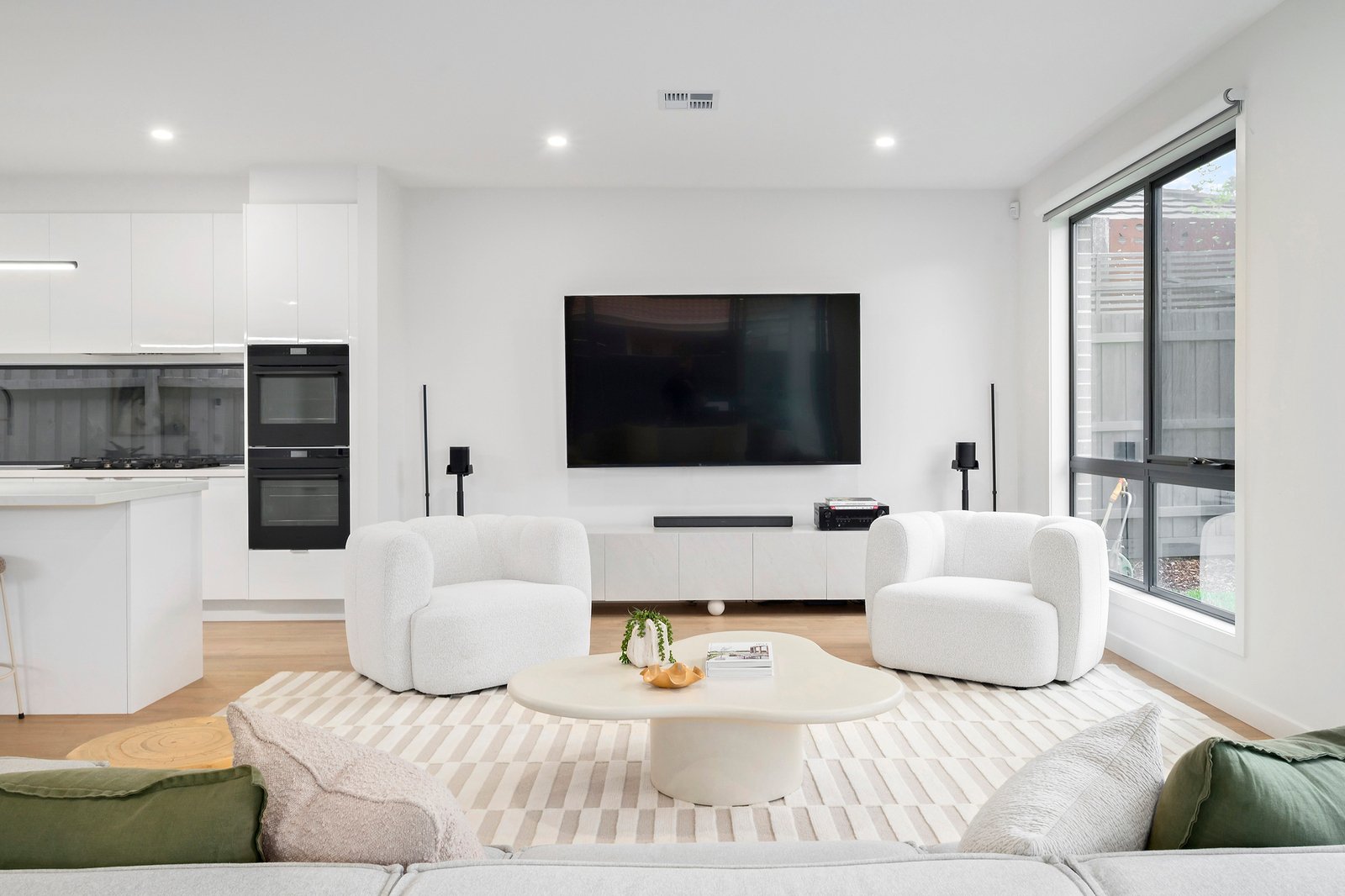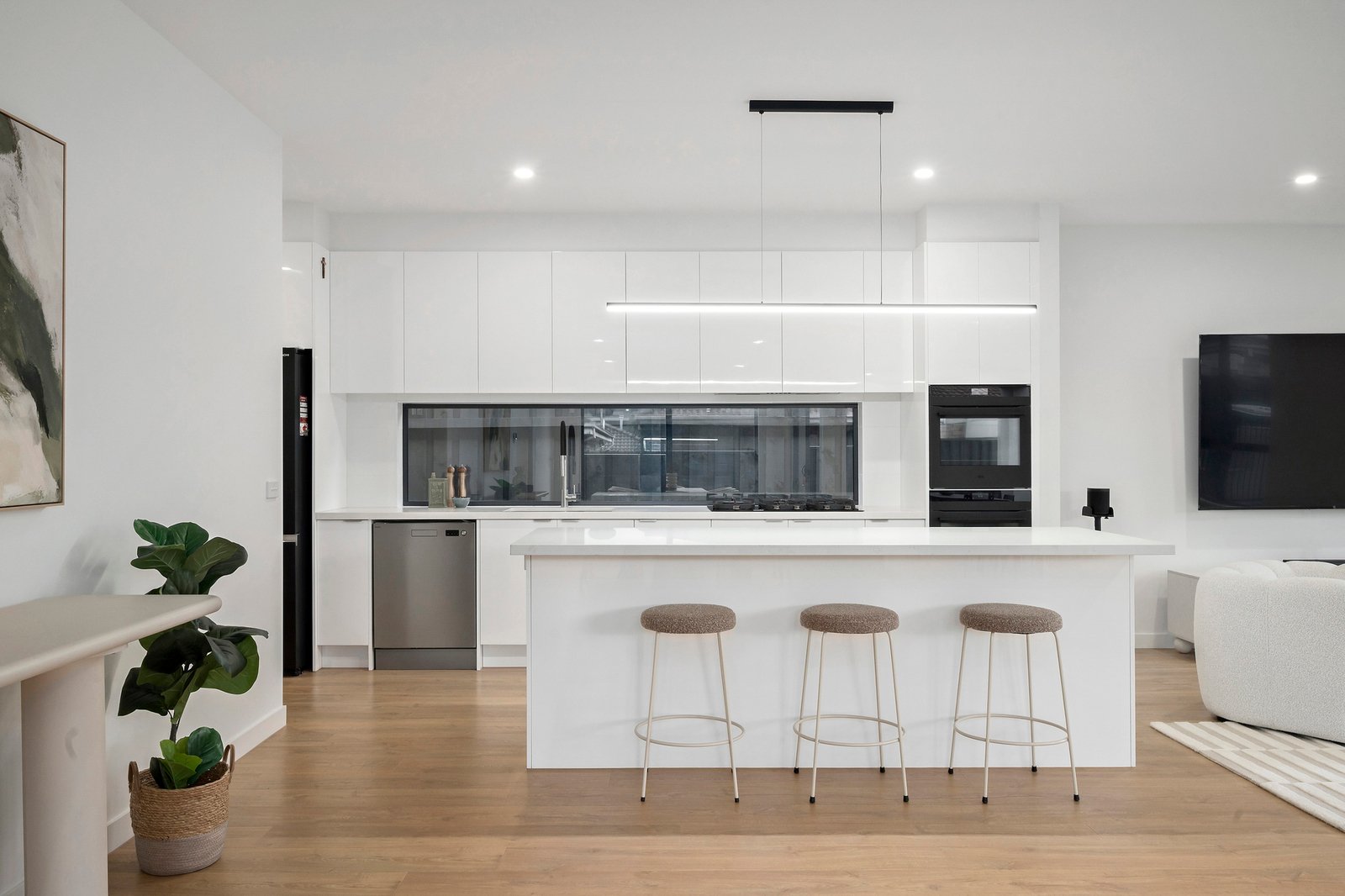 There is enough room for a huge couch, alongside a bright chef’s kitchen featuring crisp white 2pac soft close joinery and stone benchtops.
