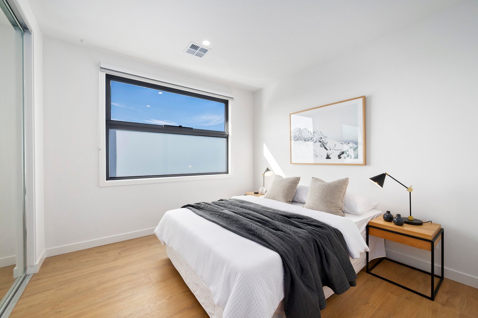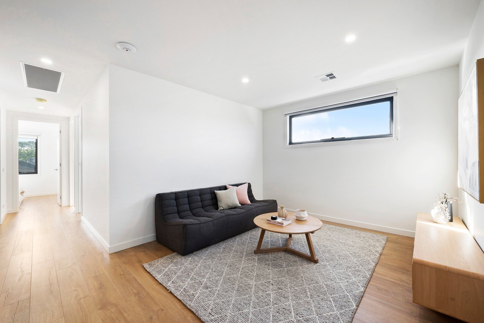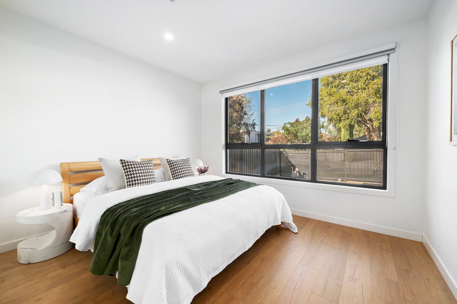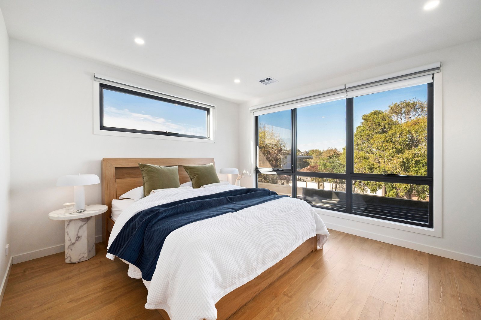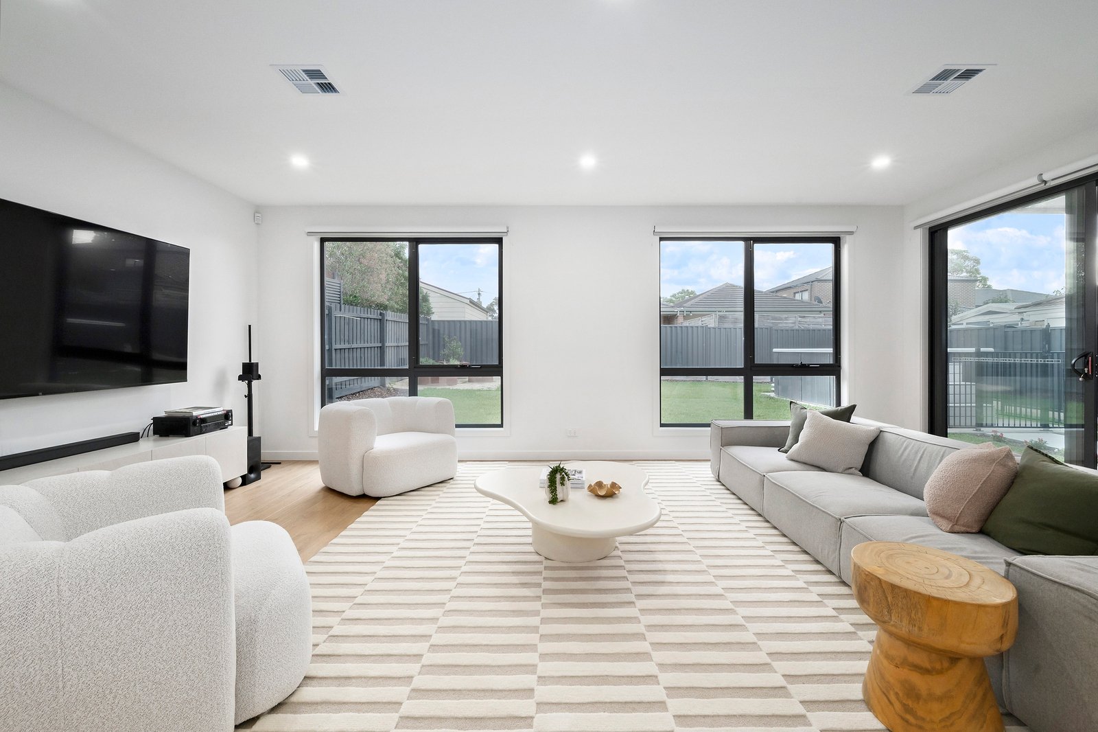 There is enough room for a huge couch, alongside a bright chef’s kitchen featuring crisp white 2pac soft close joinery and stone benchtops.