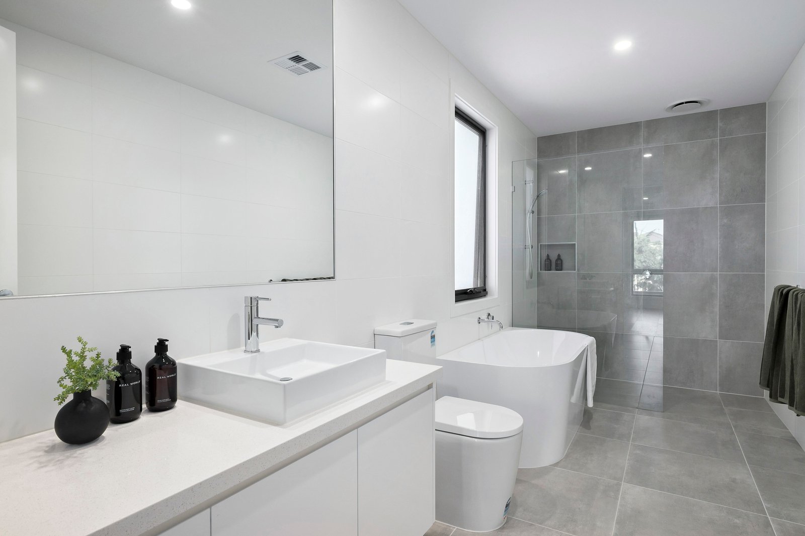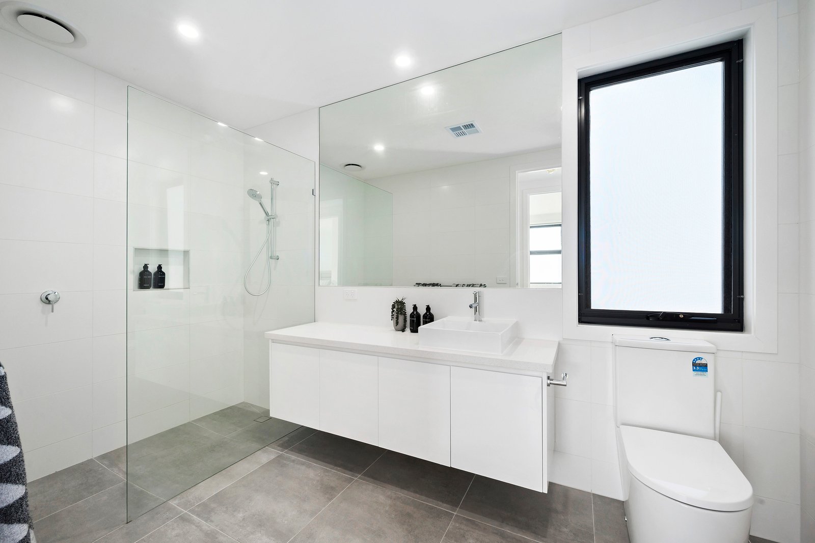 There is versatility of a ground floor main or guest bedroom with fully tiled bathroom, featuring stone topped vanity and frameless glass shower.