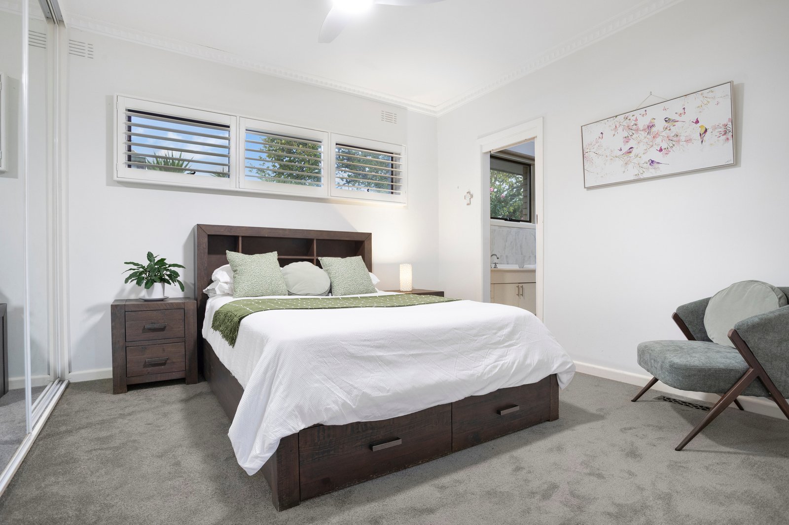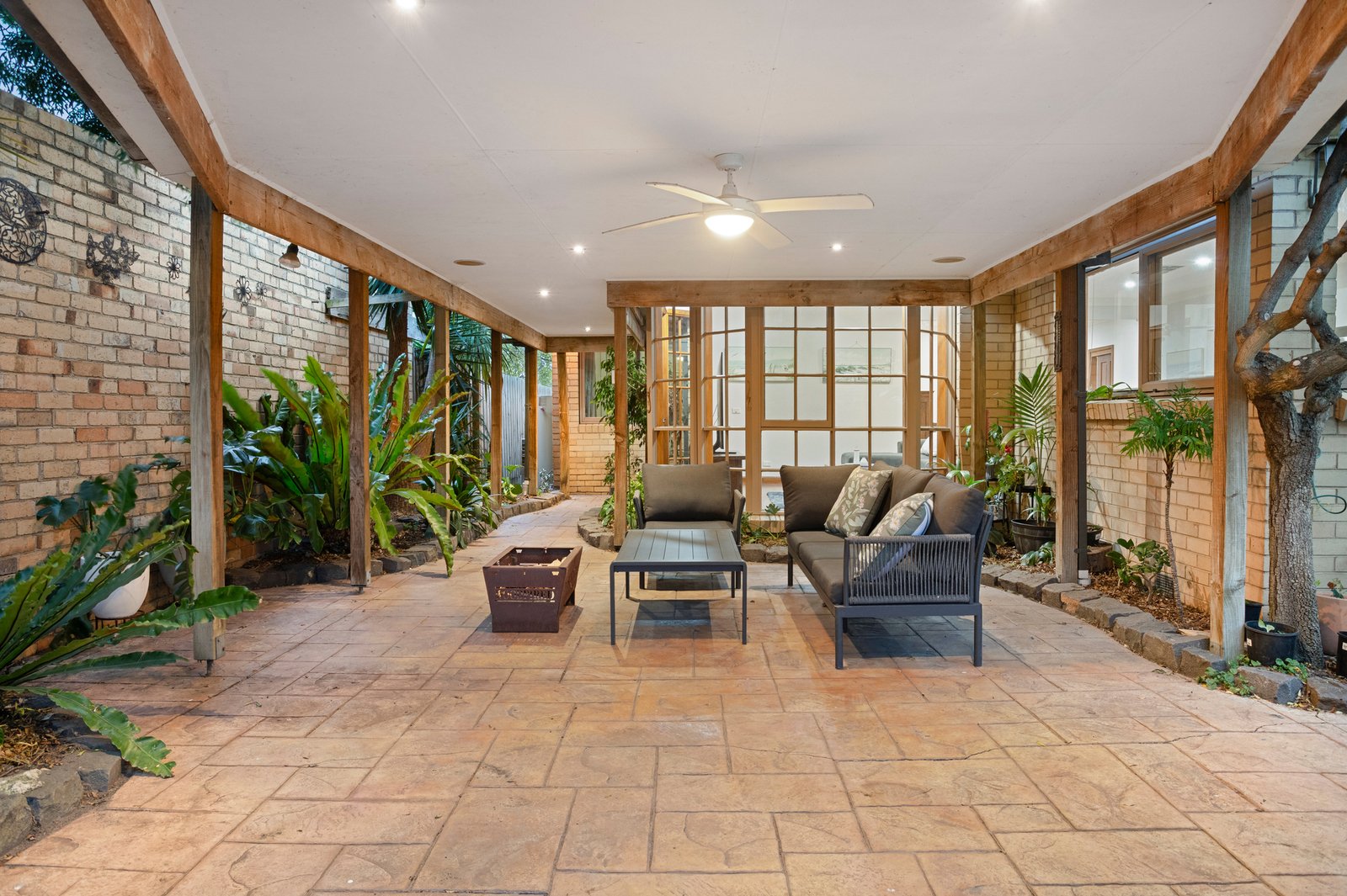 Further enhancing its family appeal, all bedrooms are well-proportioned and appointed with built-in robes and ceiling fans. The generous main suite features a stylish ensuite, while one of two peaceful garden-view bedrooms offers flexibility as a home office or music room. A newly updated main bathroom, illuminated by a soaring skylight, showcases a porcelain vanity, a tiled shower niche and a designer freestanding bath.
