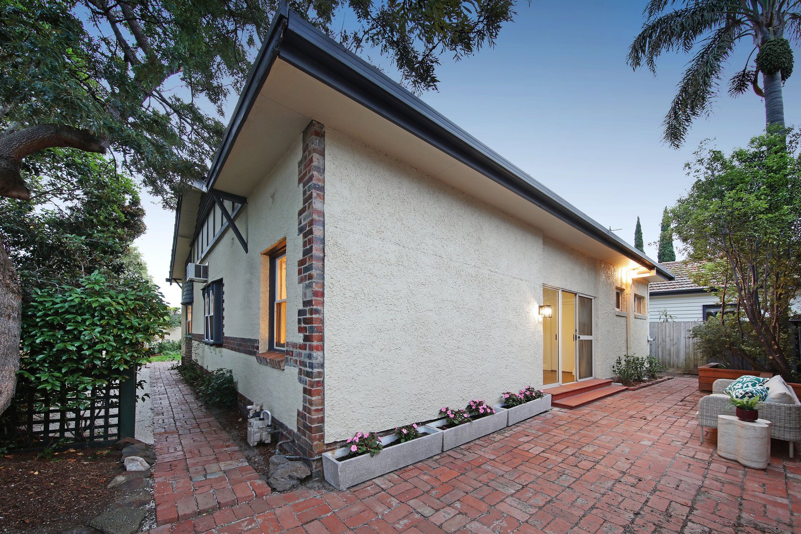 Framed by established greenery and thoughtfully paved for low-maintenance living, the outdoor spaces offer a serene, sun-filled setting for entertaining or relaxing, enhanced by a fully automated sprinkler system ensuring the gardens remain lush and green year-round with minimal upkeep.