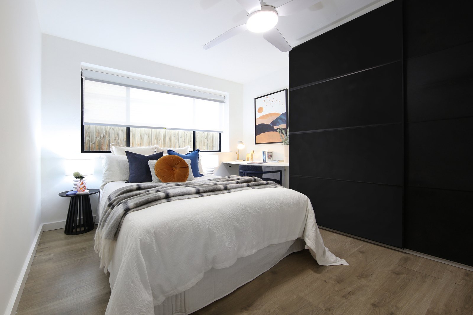 But it's not just about great space here; this great value unit showcases a value-added finish featuring a gas-appointed European gas-cooker and compact wine-fridge for the fresh, bright all-white kitchen, designer finishes including a separate WC for the artisan-tiled designer bathroom, and fitted robes plus a feature home-office station for the bedrooms.
