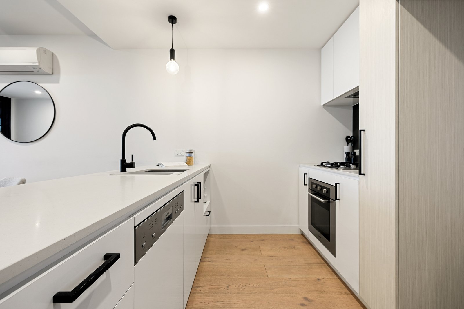 Designed for effortless modern living, the home offers two generous bedrooms, both fitted with built-in robes, including a well-appointed master with private ensuite. A sleek stone kitchen with gas cooking, dishwasher and ample storage anchors the open-plan living and dining domain, seamlessly connecting to a sunlit balcony—ideal for relaxing or entertaining.