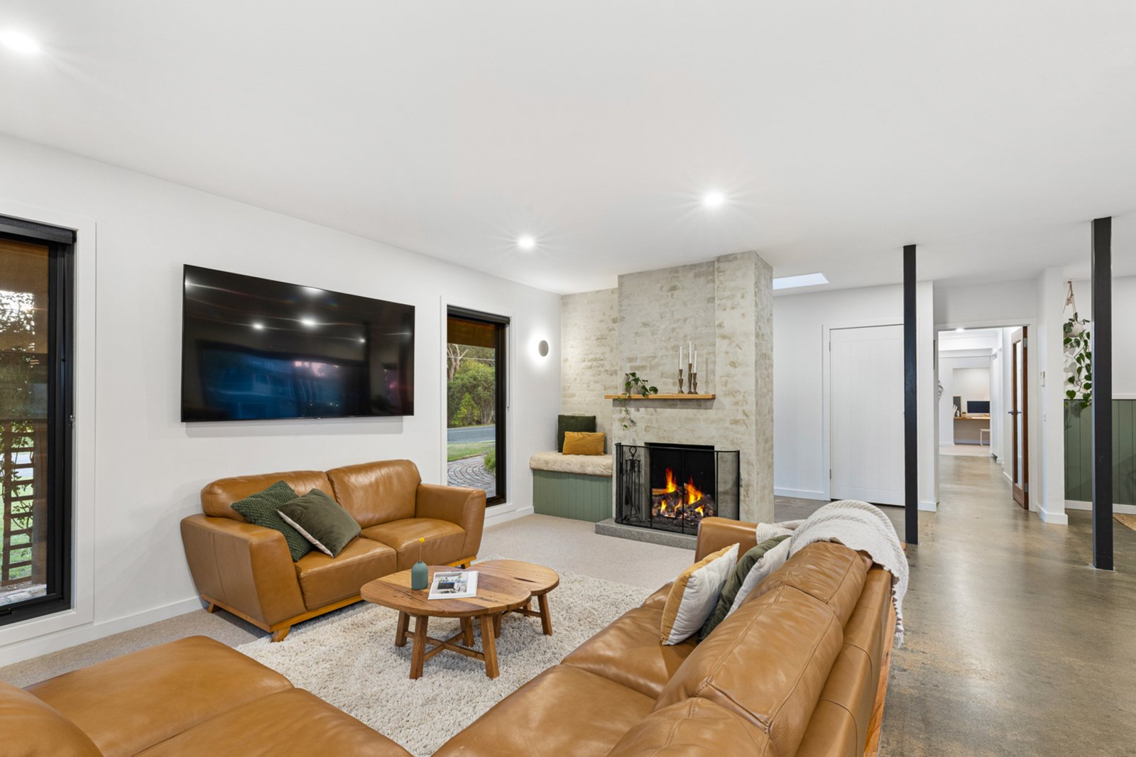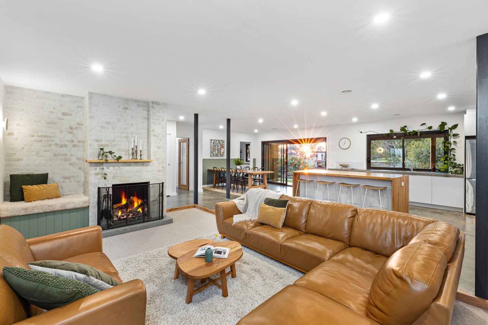 The open-plan kitchen, dining, and living area is the heart of the home, featuring polished concrete flooring and an impressive kitchen complete with quality 900mm induction cooking appliances, dishwasher, timber and concrete benchtops, and a walk-in pantry. Double-glazed, commercial-grade windows and doors enhance both energy efficiency and aesthetic appeal. Comfort is assured with gas central heating throughout most of the home, along with a welcoming open fireplace in the lounge.