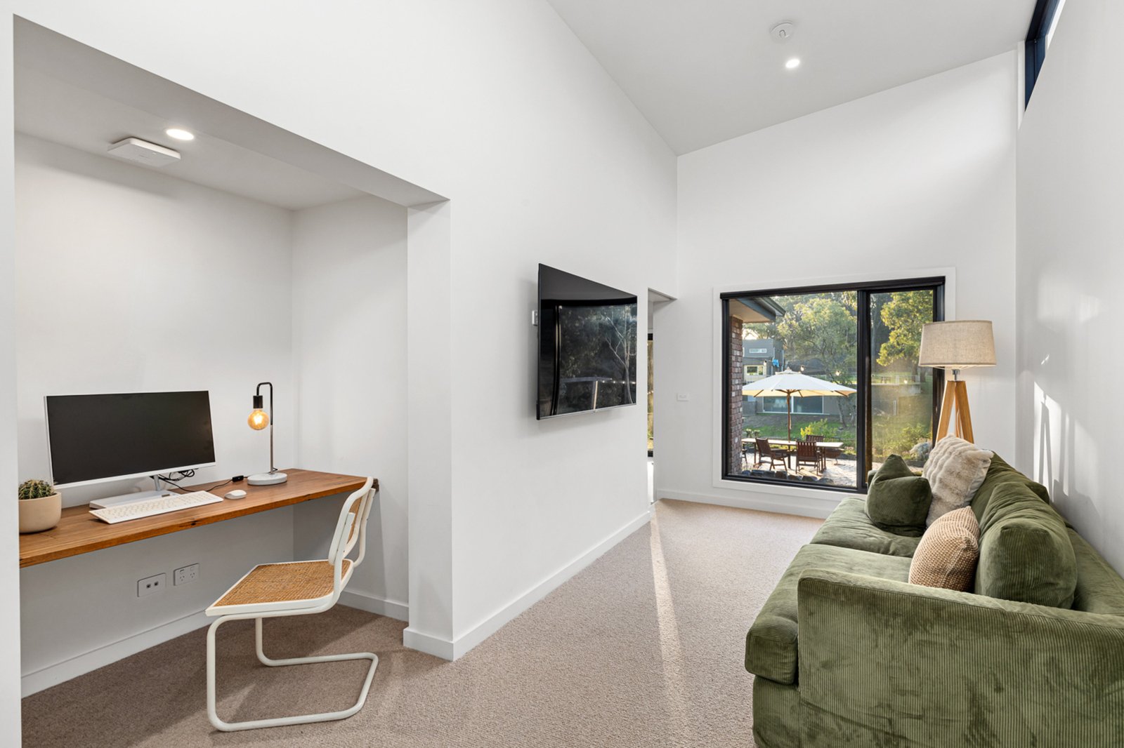 Accommodation comprises four bedrooms in total, three of which are serviced by a full family bathroom and separate powder room. In addition, the spacious master suite includes a ceiling fan, walk-through robe, and a well-appointed ensuite featuring shower, vanity, WC, and both floor and towel rail heating. Adjoining is a versatile parents’ retreat with study nook, split-system heating and cooling, and ducted vacuuming throughout the home for added convenience.