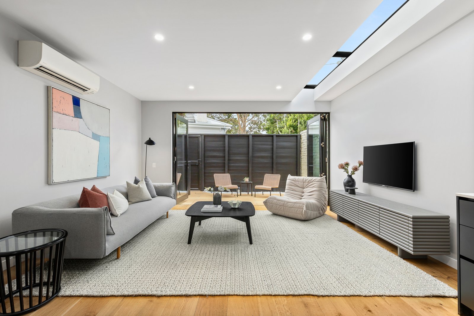 Classic hallmarks, including soaring ceilings, an arched hallway and generous scale, harmonise with bold architectural design that enhances light and openness. At the rear, a sun-filled living domain unfolds to a private north-facing courtyard with an urban backdrop, creating a low-maintenance retreat of exceptional style and convenience.