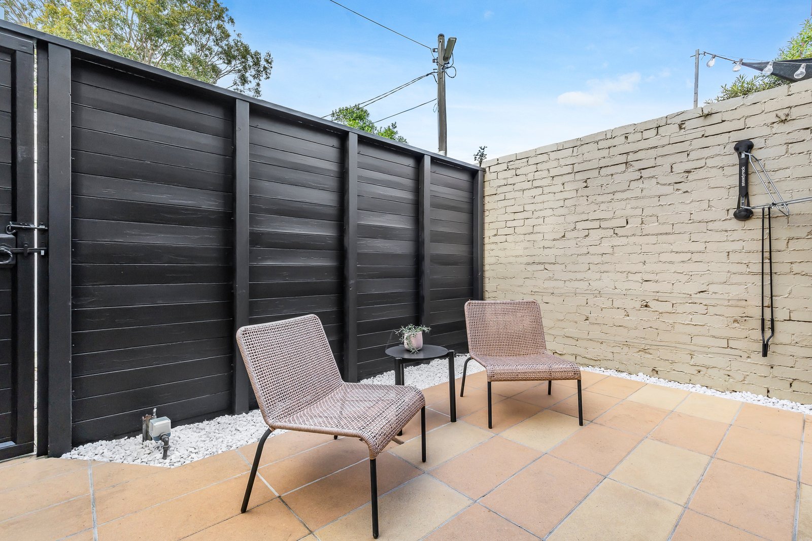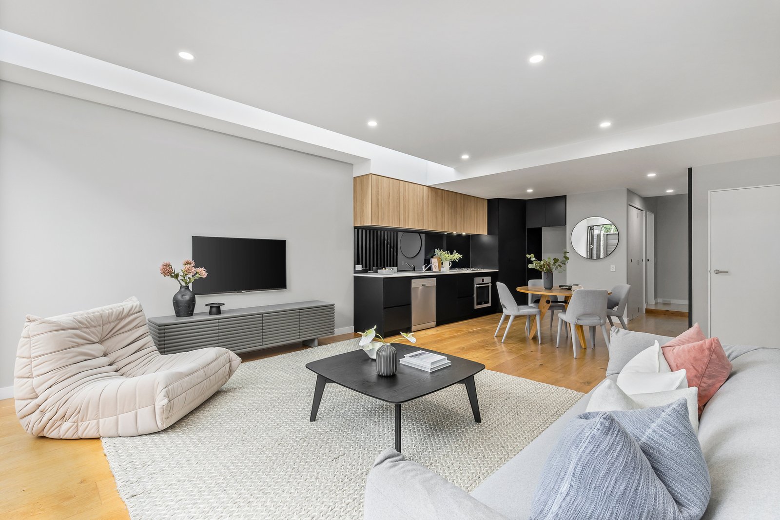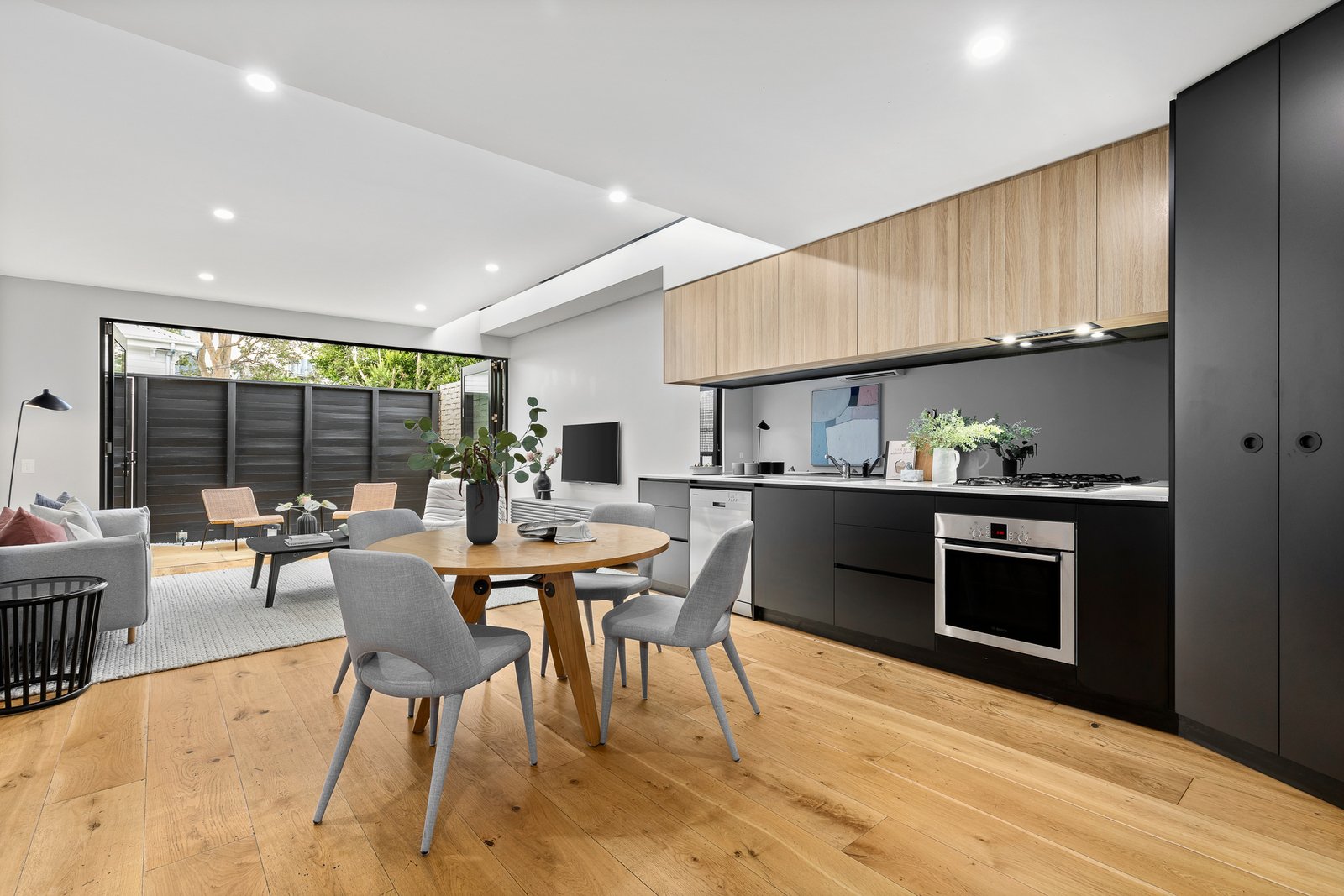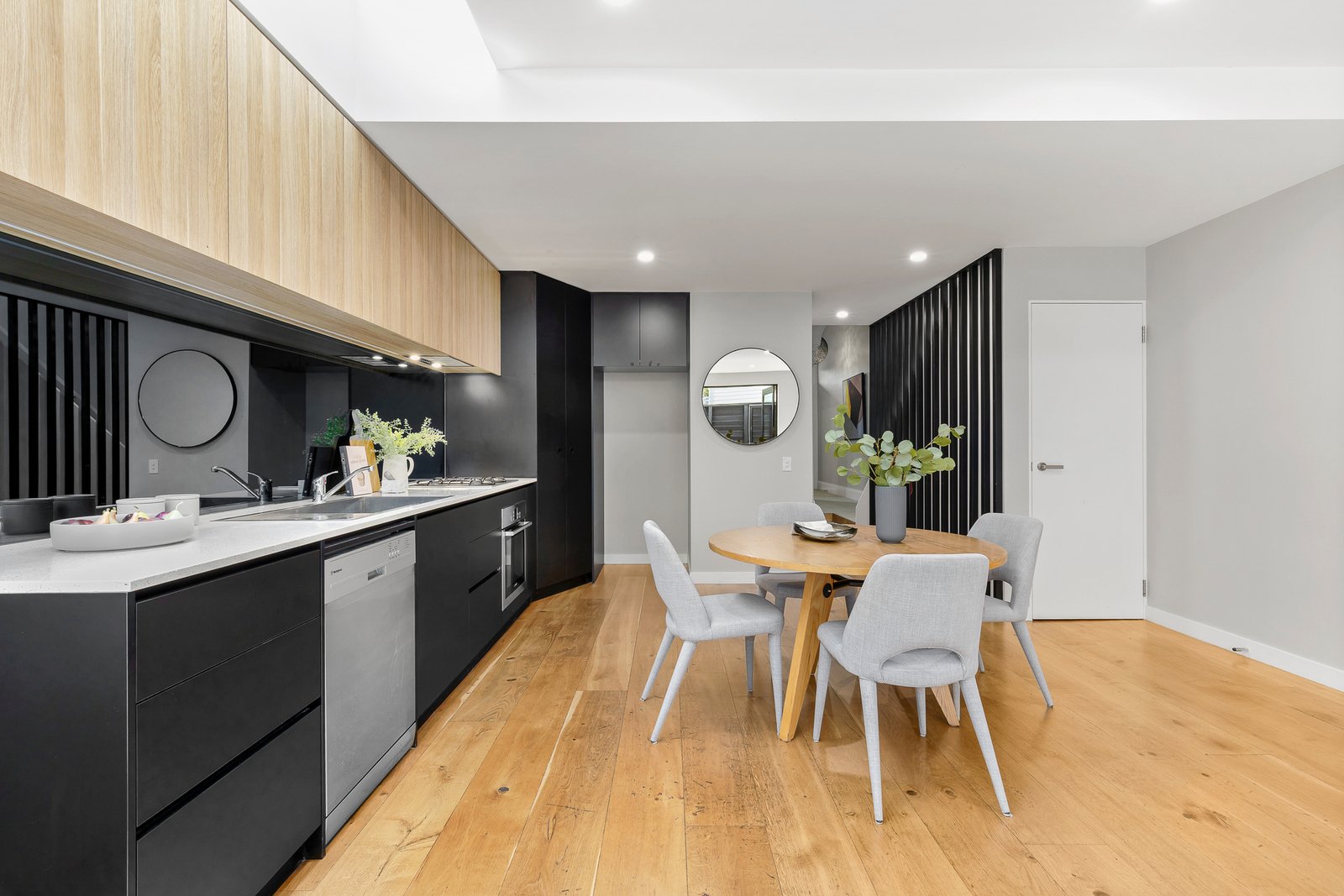 Wide-board oak flooring and timber accents bring warmth and texture to the living zone, while a sleek stone kitchen makes a striking statement in both form and function. Appointed with a smoked mirror splashback, stainless steel appliances and bold black cabinetry, it’s designed for everyday living and entertaining ease. Tall bi-fold doors extend the space outdoors to the paved and securely fenced, al fresco courtyard with rear lane access.