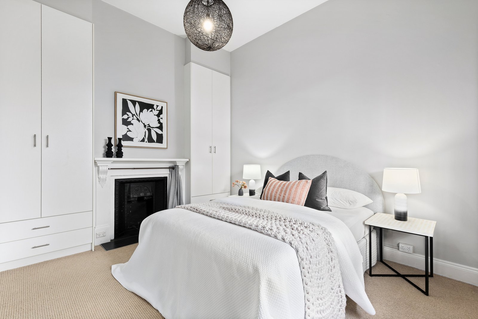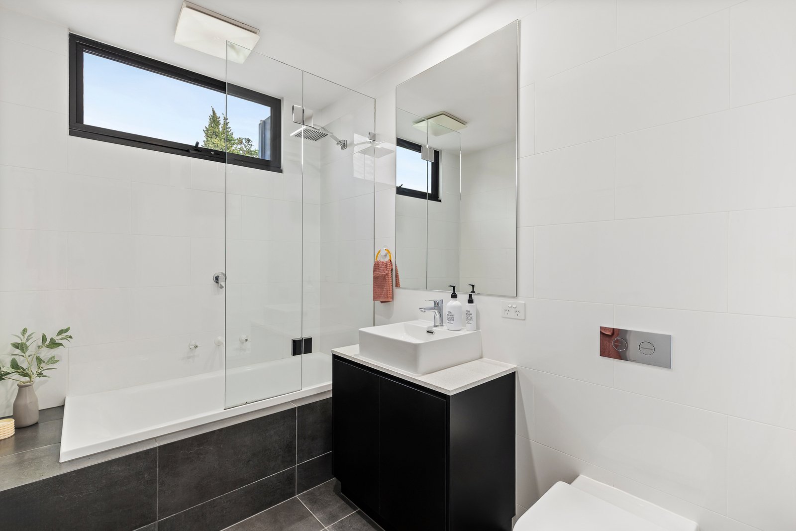 Accommodation is both flexible and inviting, with a ground-floor bedroom featuring twin robes and an open fireplace (ornamental), serviced by a stylish designer bathroom. Above, a skylit staircase leads to two generously proportioned bedrooms and a fully tiled bathroom, where a floating stone vanity, rain shower and deep bathtub deliver a luxe, spa-like finish.