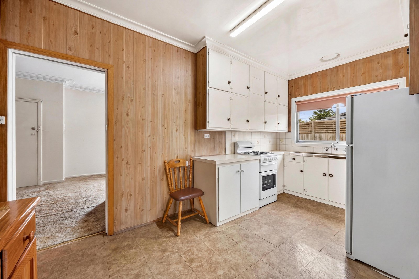 Set behind established gardens, the mid-century façade is welcoming in appeal. Entry into the main living area reveals charming original features including ornate cornice, a brick mantel, built-in bookshelves and timber wall panels, with north facing windows allowing warm natural light to flow within. The adjoining kitchen and meals area retains its retro style cabinetry with a 600mm oven and cooktop. To the rear, a versatile room with built-in cabinetry serves as a dining room or additional living area with a view to the backyard. Comprising three generous bedrooms, two include built-in robes, serviced by a central family bathroom, with a separate wc and laundry at the rear.