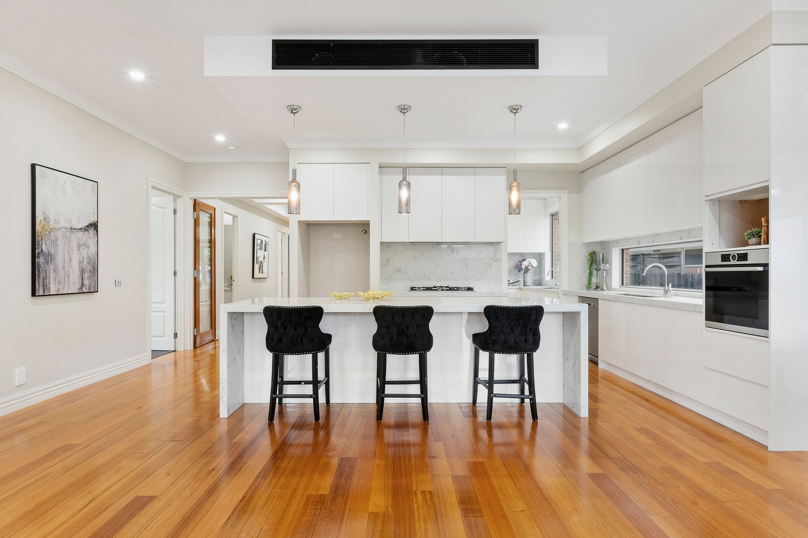 At the heart of the home, the gourmet kitchen is beautifully appointed with stone benchtops, premium Bosch appliances and soft-close cabinetry, complemented by a large butler’s pantry/second kitchen with walk-in pantry—perfectly catering to the needs of the modern family and avid entertainer.
