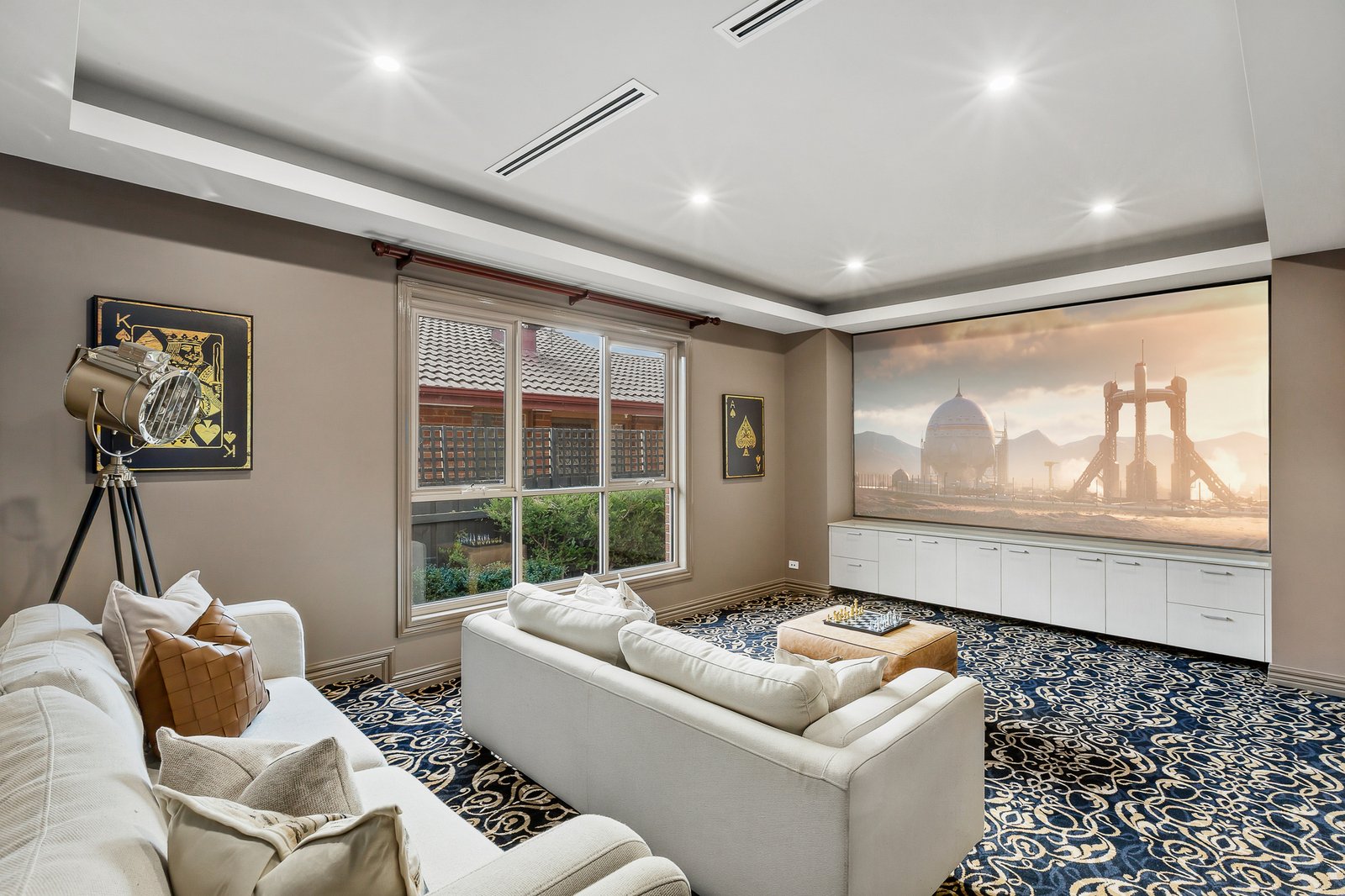 Upstairs, a private retreat provides an additional living space ideal for relaxation, while the lower ground level features a dedicated theatre room accompanied by an adjoining guest bedroom—perfect for extended family, guests, or potential self-contained living.