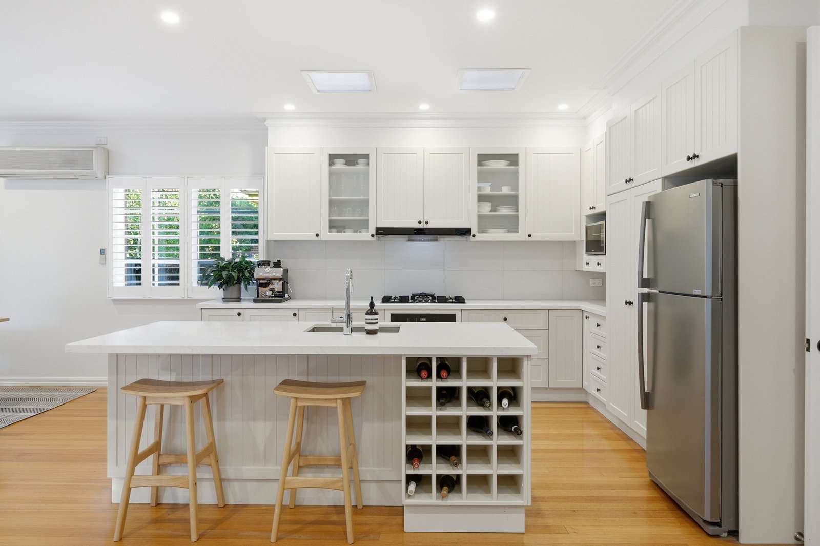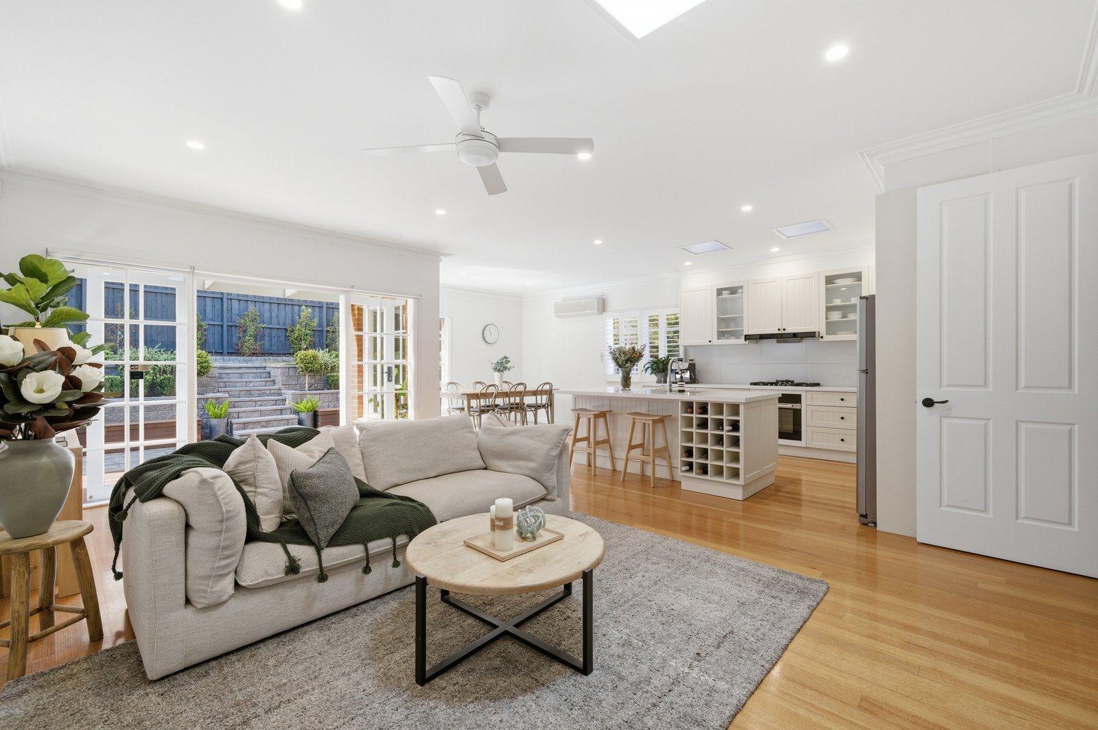 Inside, two distinct living zones provide flexibility, with a stunning formal room and a spacious rear living and dining domain enhanced by skylights and polished timber floors. The skylit kitchen is a standout, featuring a striking stone island with built-in wine rack, premium Miele appliances including a 900mm cooktop and ample pantry storage. French doors open to an entertaining deck and fully landscaped backyard with stone paving, built-in timber seating and lush lawns.