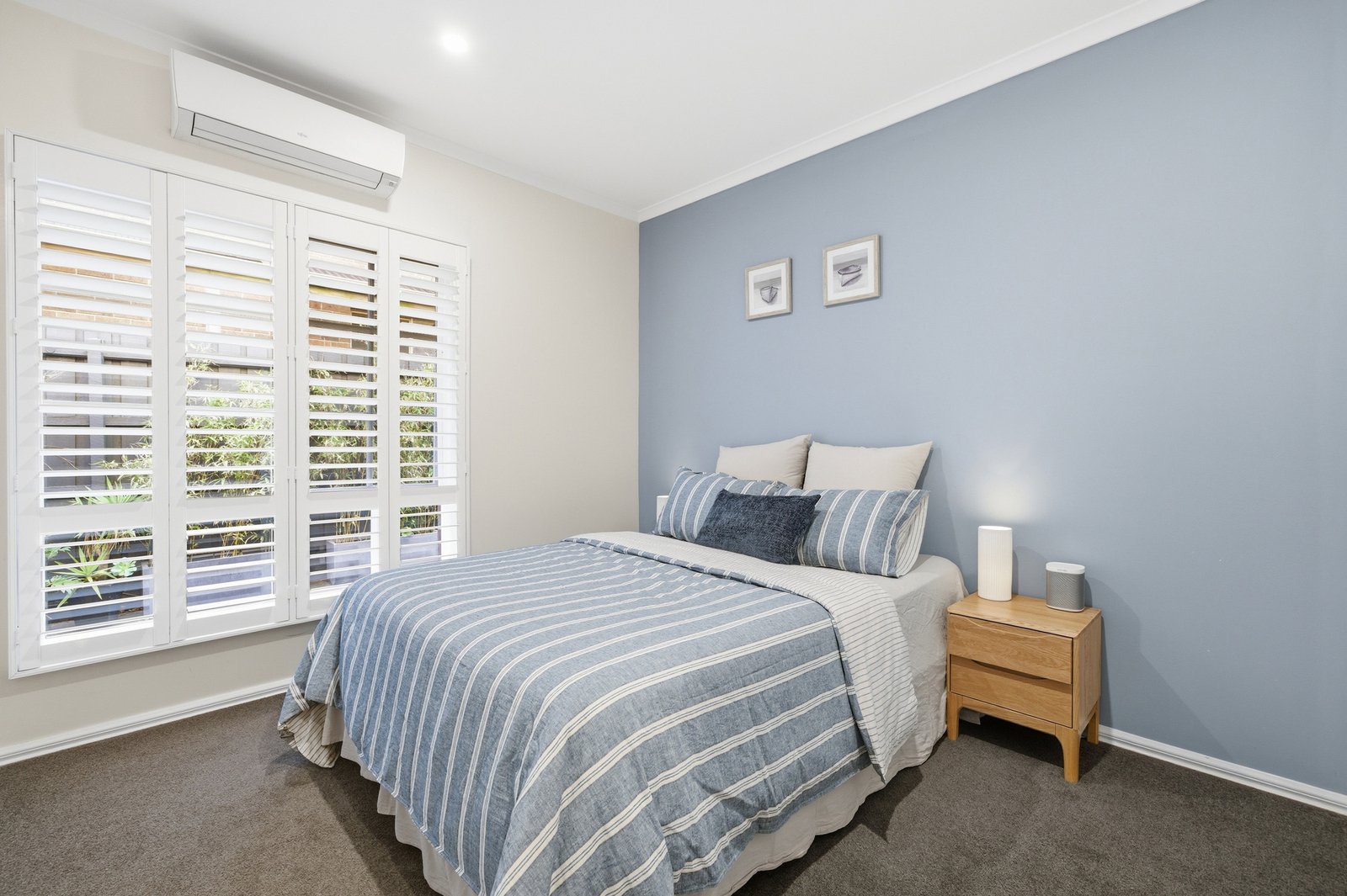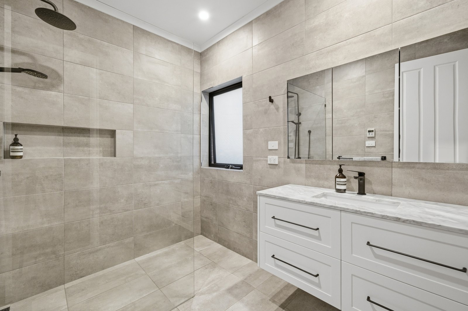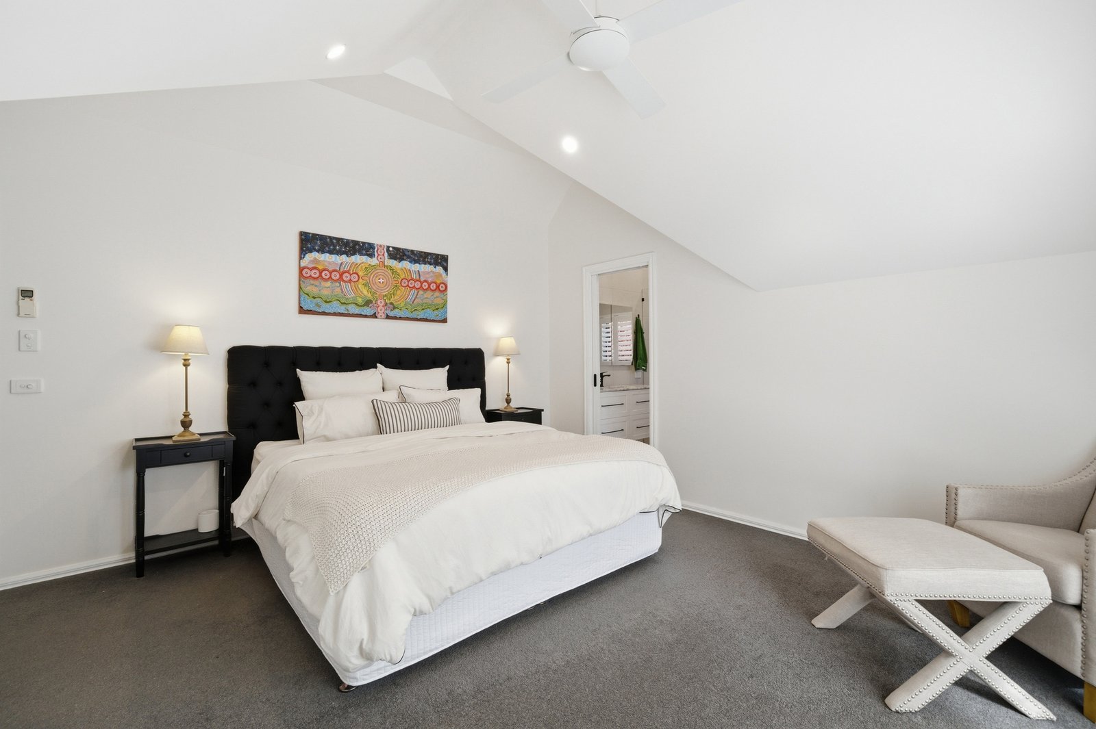 Accommodation includes three robed bedrooms downstairs, serviced by a fully tiled bathroom with black tapware and stone vanity. Upstairs, a private retreat spans the entire level, complete with a generous bedroom, walk-in robe, ensuite, home office and dual attic storage.