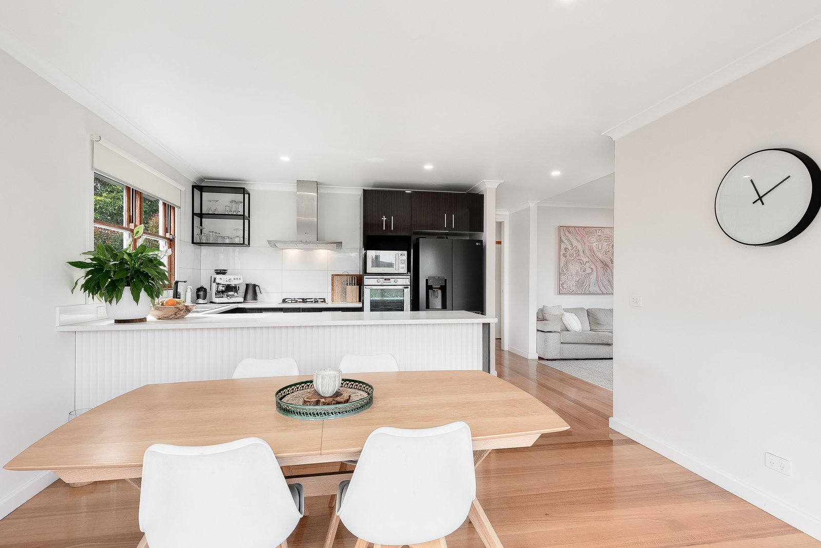 The rear of the home transitions to an open plan kitchen, dining and living area, offering an inviting space for everyday living and easy entertaining. The stylish kitchen features quality Neff cooking appliances including a 600mm oven, gas cooktop and rangehood, dishwasher, contemporary cabinetry and ample bench space. Well-positioned to overlook the dining space and adjoining alfresco, entertainers will love the layout of this home.