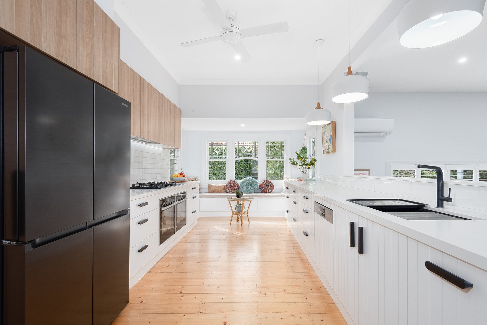 Warm and inviting interiors unfold across multiple living zones, offering the ideal balance of connection and privacy for family living. At the centre, the well-appointed kitchen features a gas cooktop, two premium NEFF ovens, and excellent storage, all positioned to overlook the main living area and backyard, keeping everyday living both practical and connected.