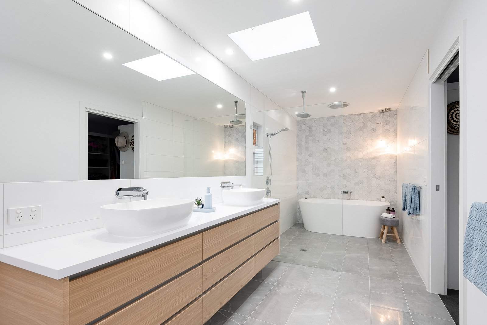 Upstairs, a private parents’ retreat offers a spacious bedroom with a large walk-in robe and a stylish ensuite featuring marble finishes and a bathtub. This level also includes a third living area, dedicated study space, and additional storage, all complemented by double-glazed windows for enhanced comfort and quiet. A north-facing balcony captures natural light while showcasing elevated views across Geelong and out to the ocean, creating a truly special space to unwind.