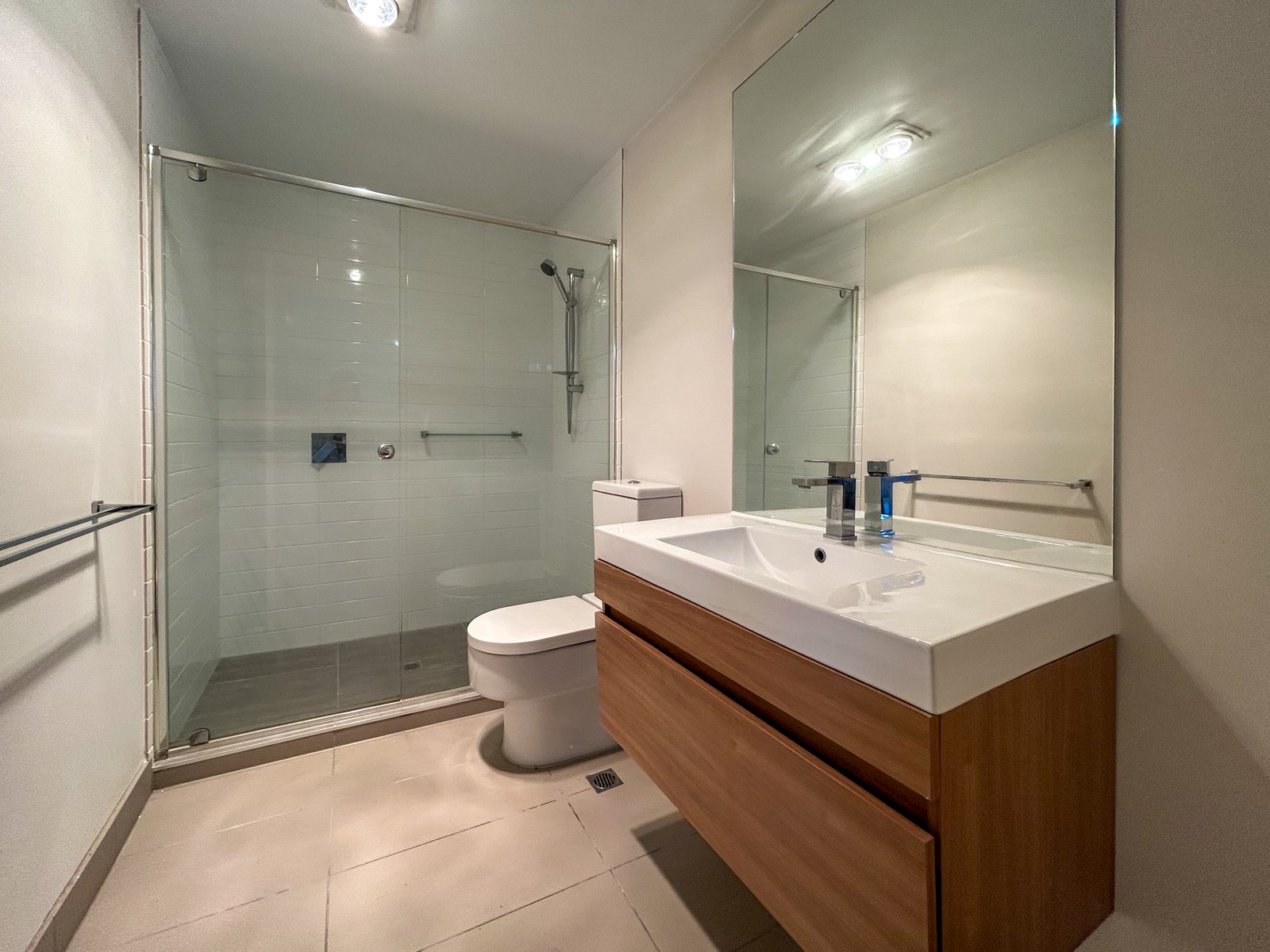 • Modern central bathroom with oversized shower and sleek vanity