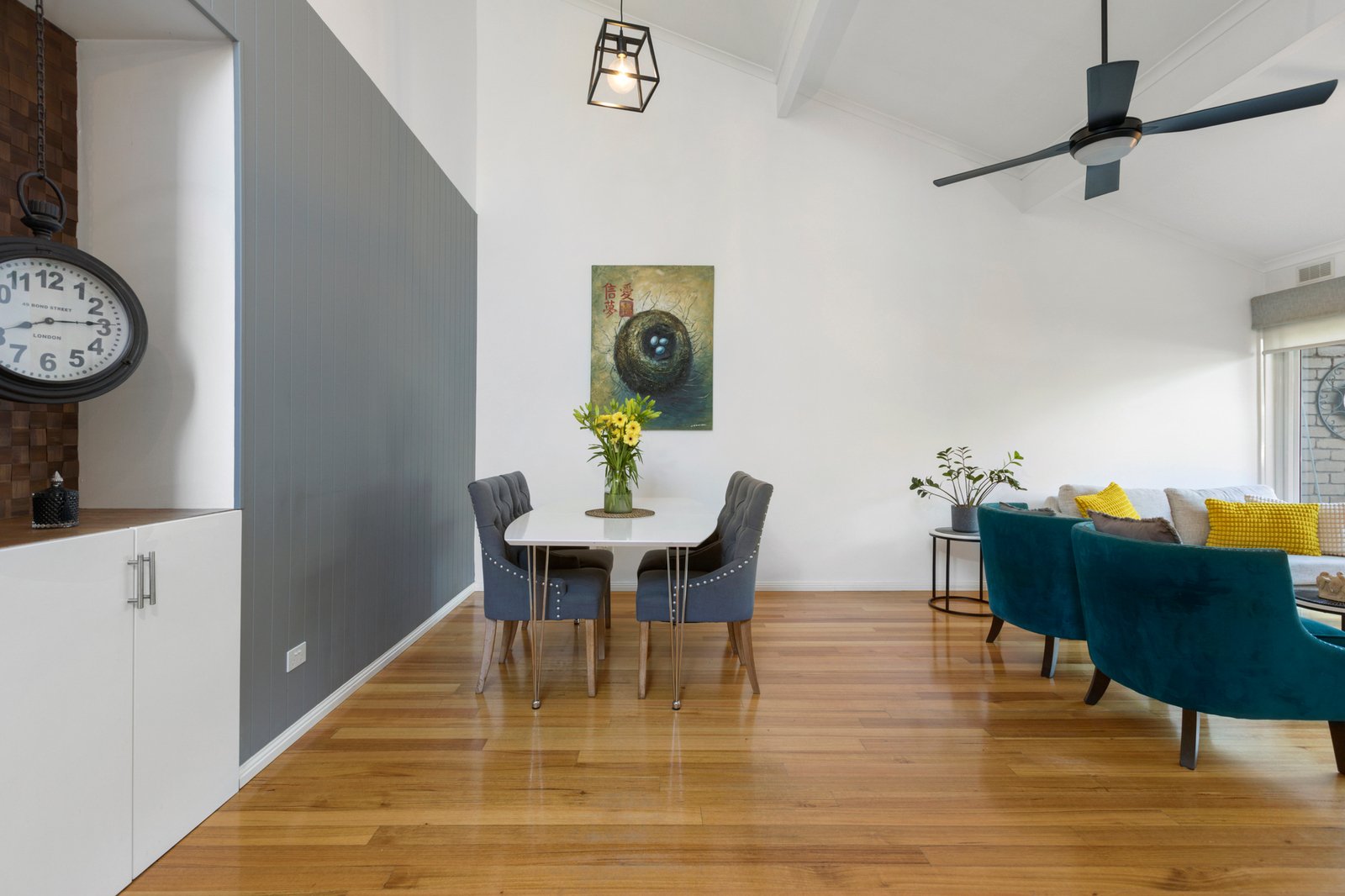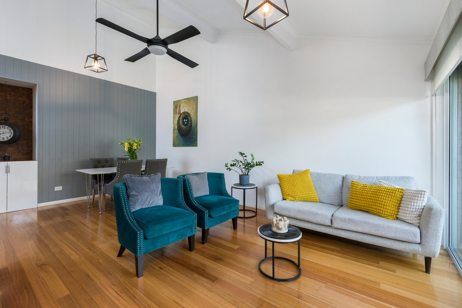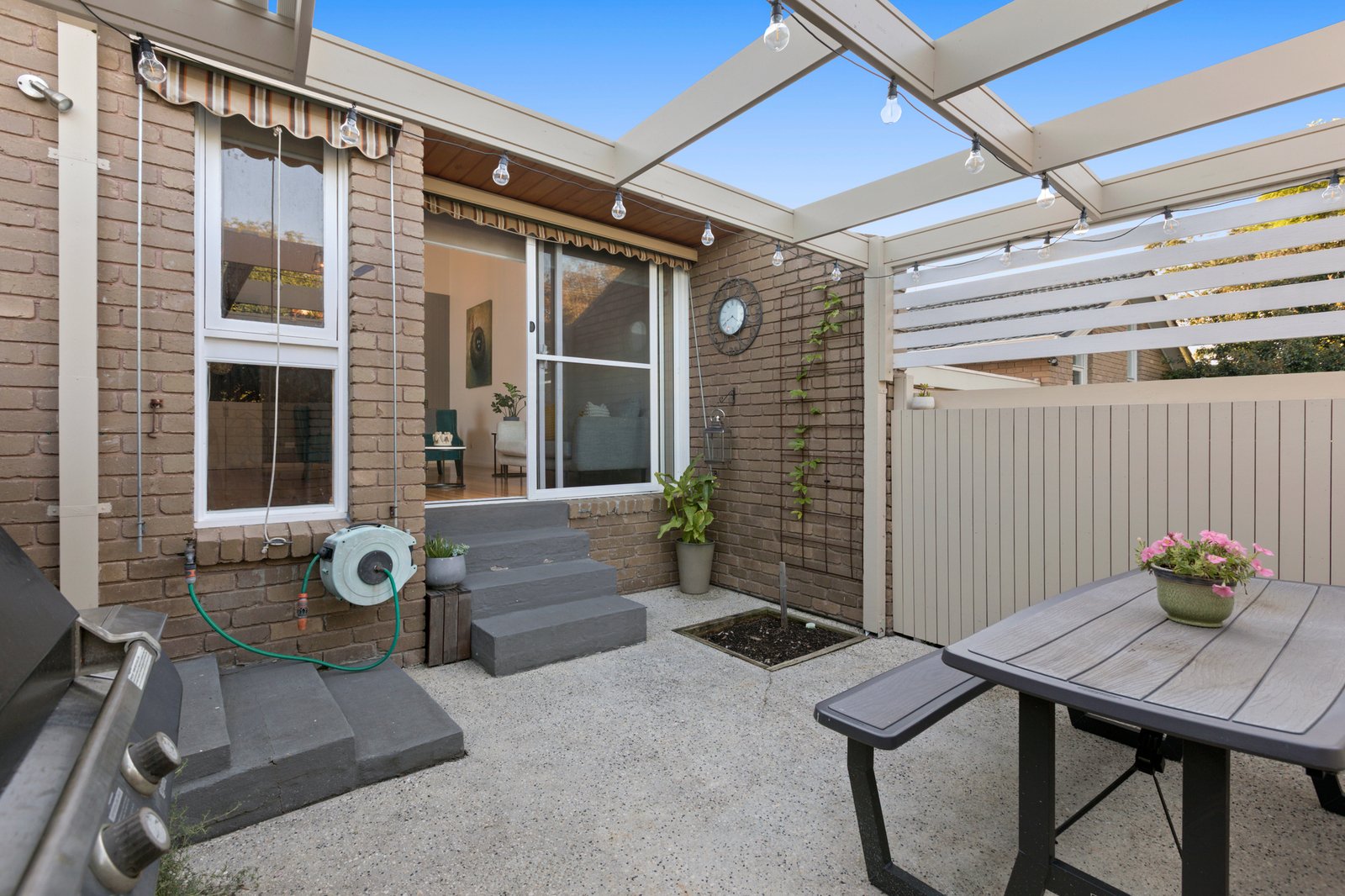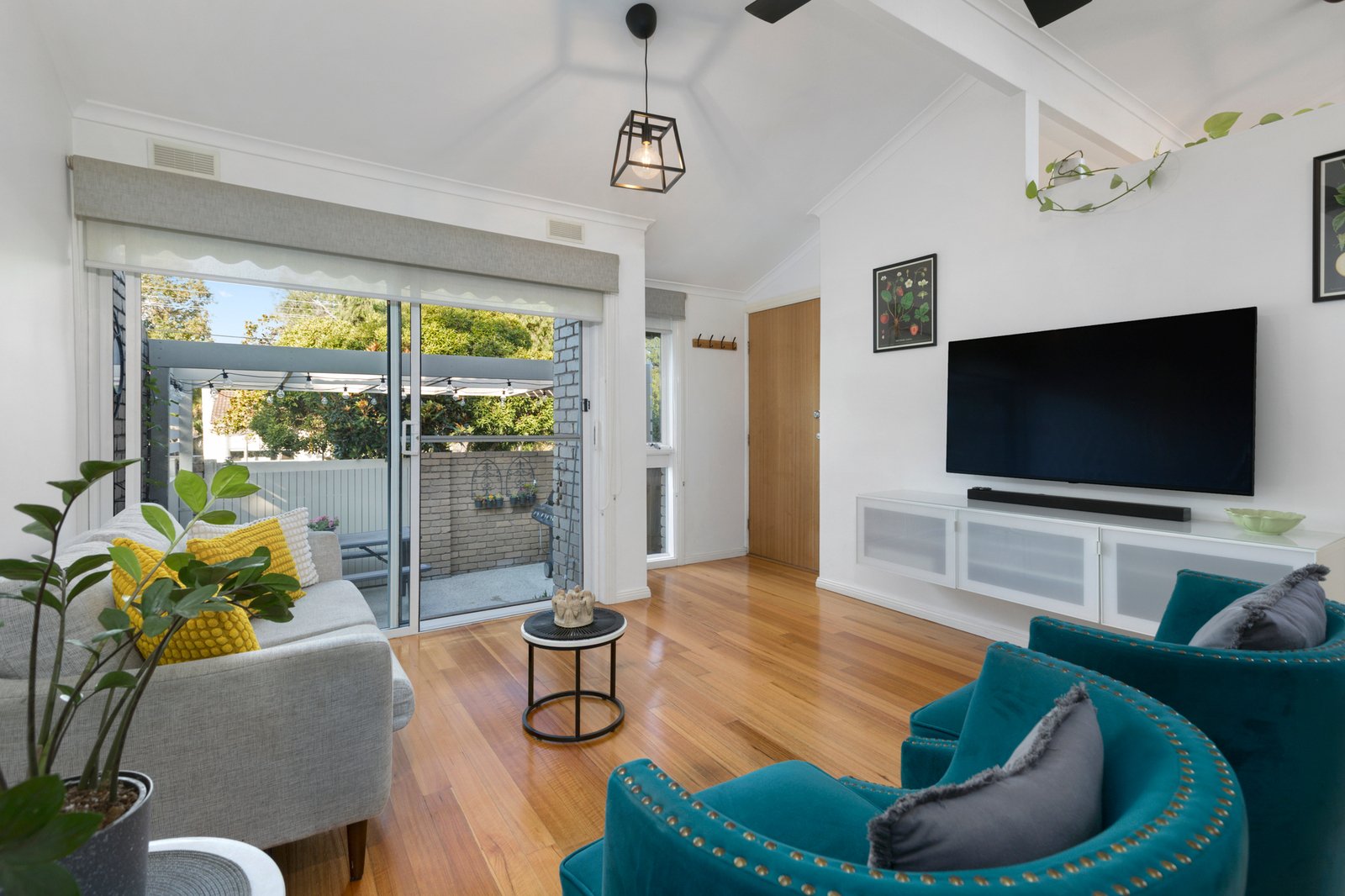 Enriched by warm hardwood floors and crowned by soaring raked ceilings enhancing the sense of light and space, the accommodation comprises a generous lounge and dining zone that wraps around to a contemporary Caesarstone kitchen with quality Bosch and Ilve appliances. Extending the living space, the private alfresco courtyard has mains gas plumbed ready for your BBQ, while out the back there is a secure yard & lawn.