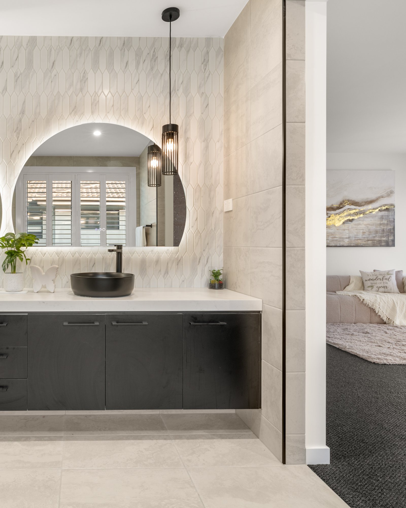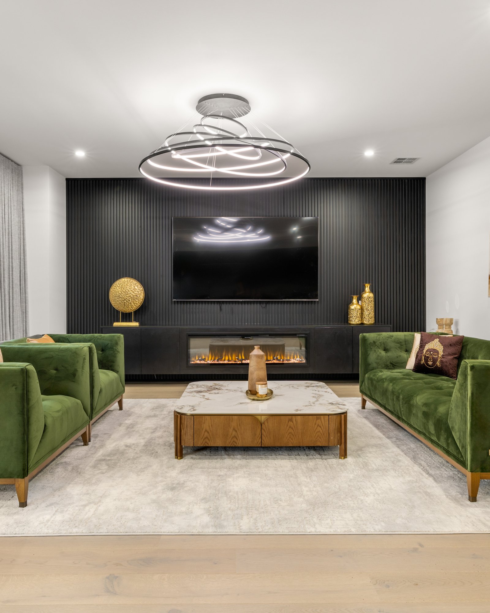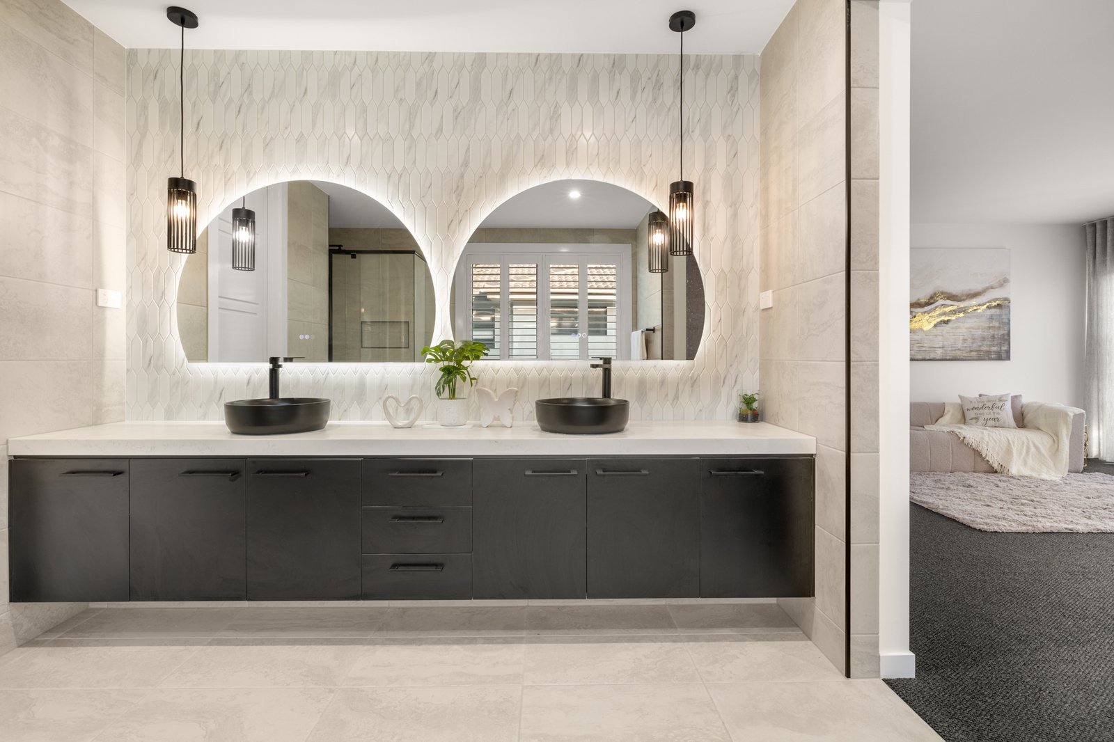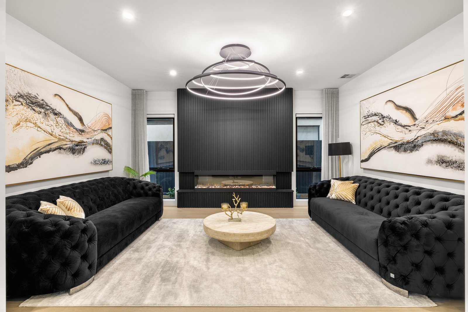 Showcasing a 5 Star fit-out featuring premium Oak floors, loop-pile carpets and premium stone benchtops, the home offers opulent extras including sheer curtains (plus block-outs to cocoon the media-lounge), app-controlled motorised blinds, floor-to-ceiling bathroom tiling and a wide-span decorative fireplace for each main living zones. Even the lighting is optioned up with a range of warm and cool schemes and LED features - extending from bathroom mirrors, to under-step strip-lighting for a grand entry!