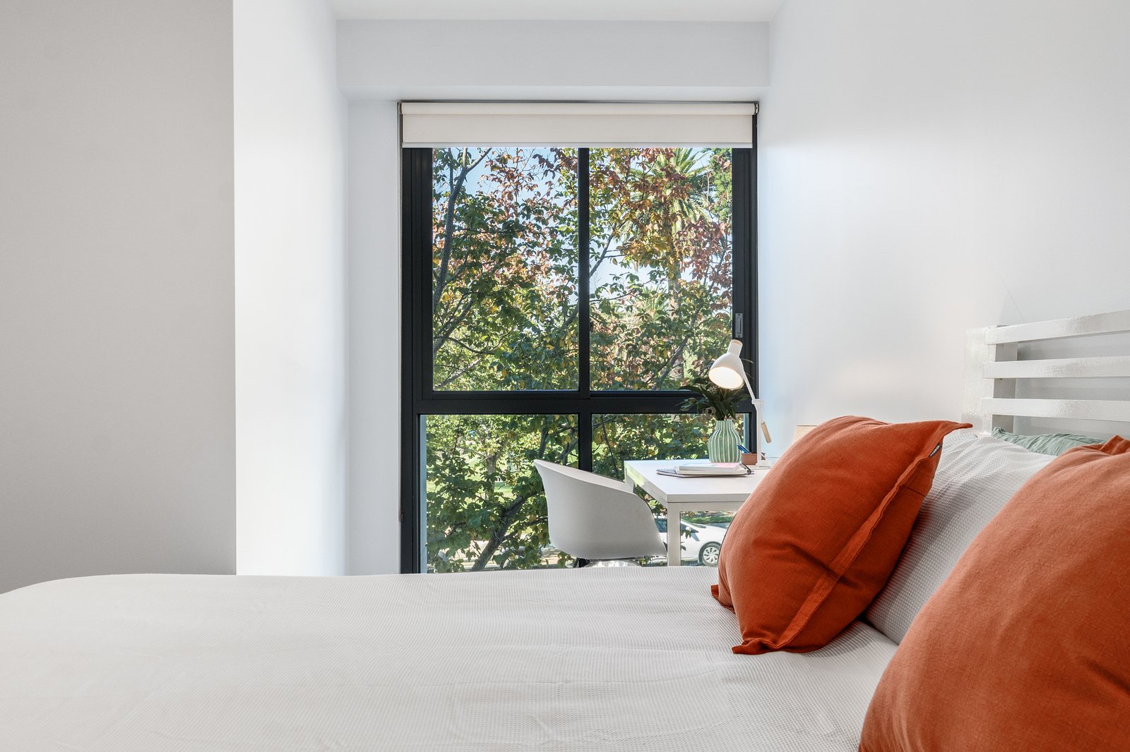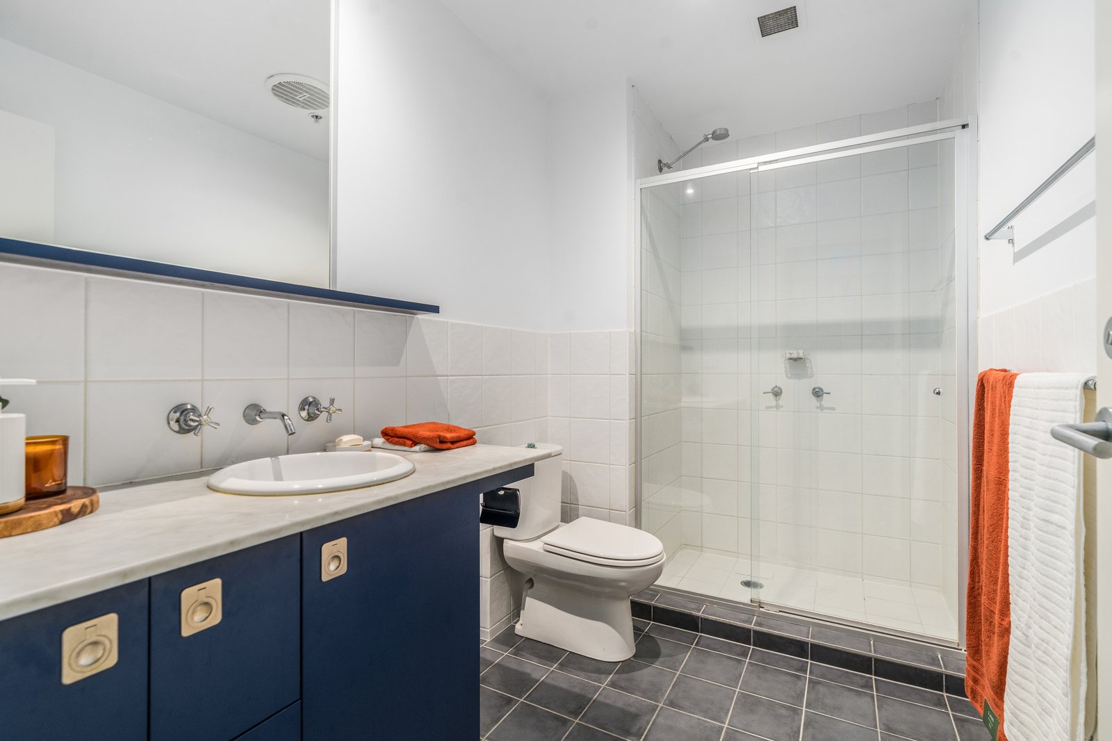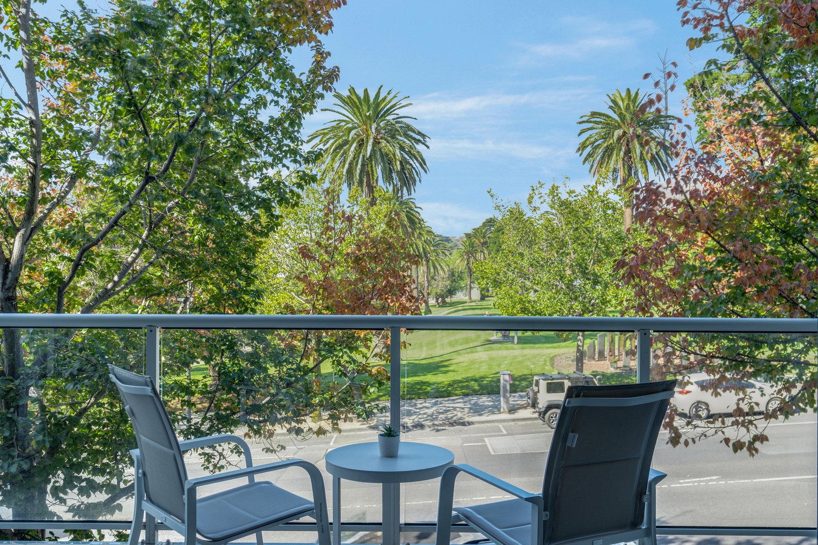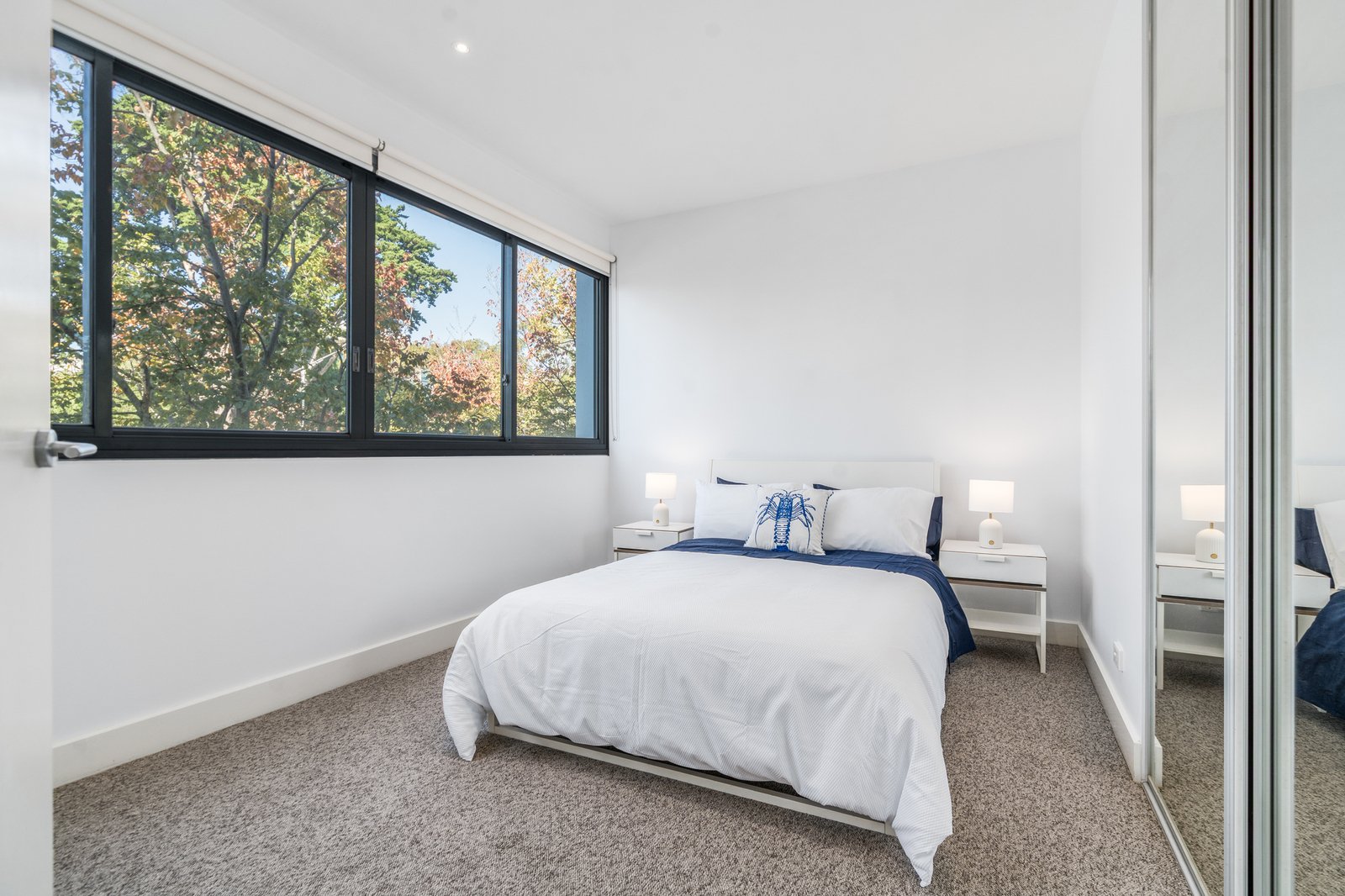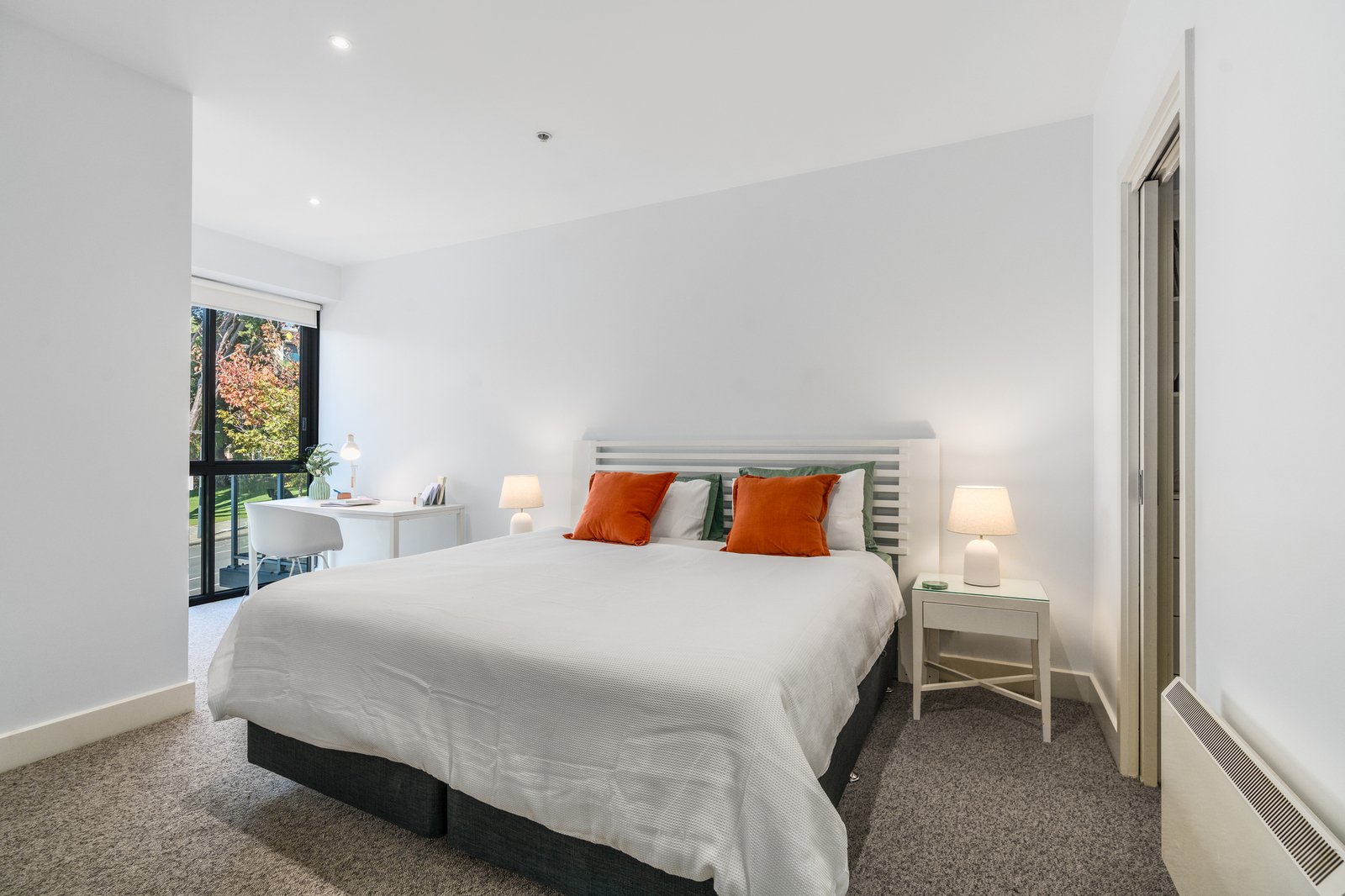 The spacious main bedroom includes a study nook with a view, walk-in robes and a tastefully presented ensuite with marble-topped vanity. Bedroom two includes built-in robes, serviced by a central bathroom with shower over bath, continuing in quality finishes.