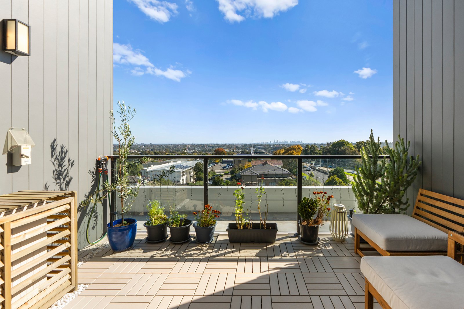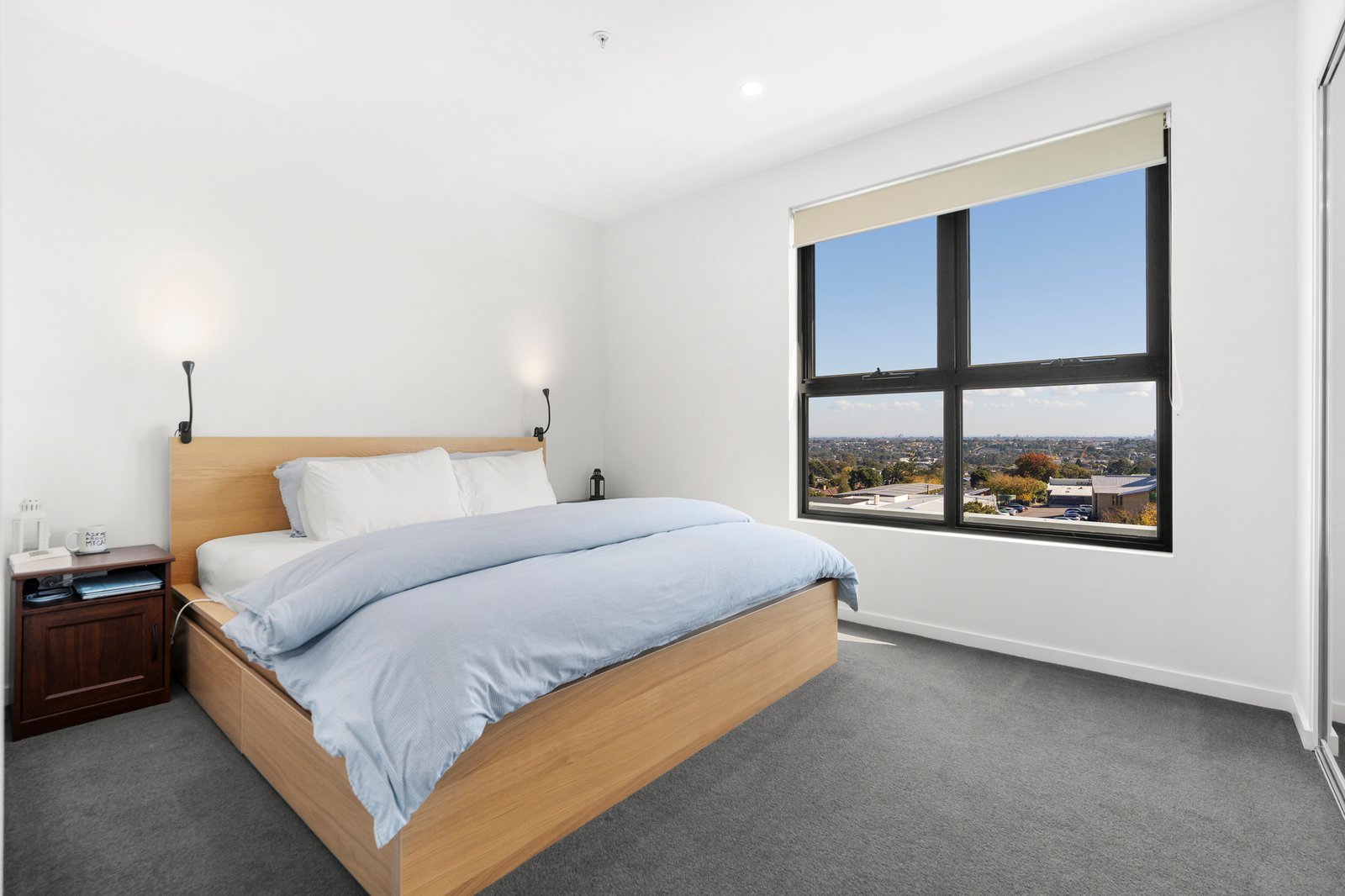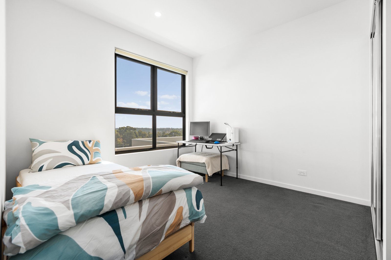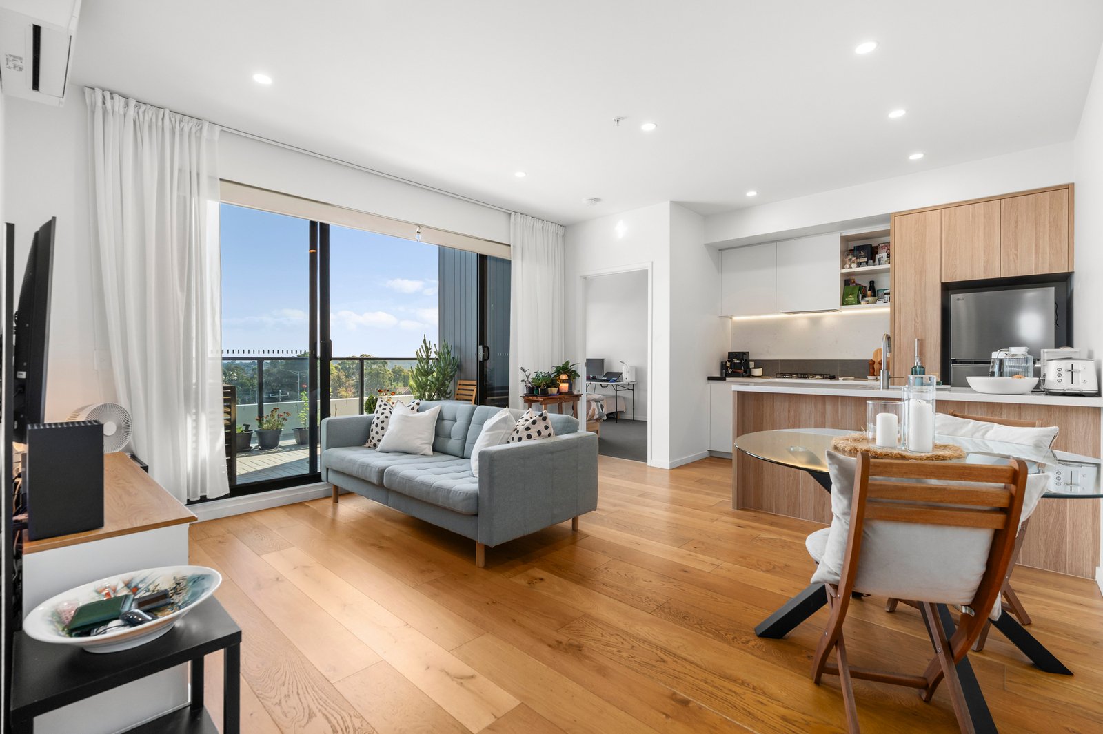 The stone-finished kitchen is both stylish and functional, featuring soft-closing cabinetry, a breakfast bar, and a full suite of high-performance Bosch appliances, including an integrated dishwasher. A generous study zone caters perfectly to working from home, while the spacious open-plan living and dining area seamlessly extends to a partially sheltered terrace—ideal for relaxing or entertaining against a breathtaking backdrop of the CBD and Box Hill skyline.