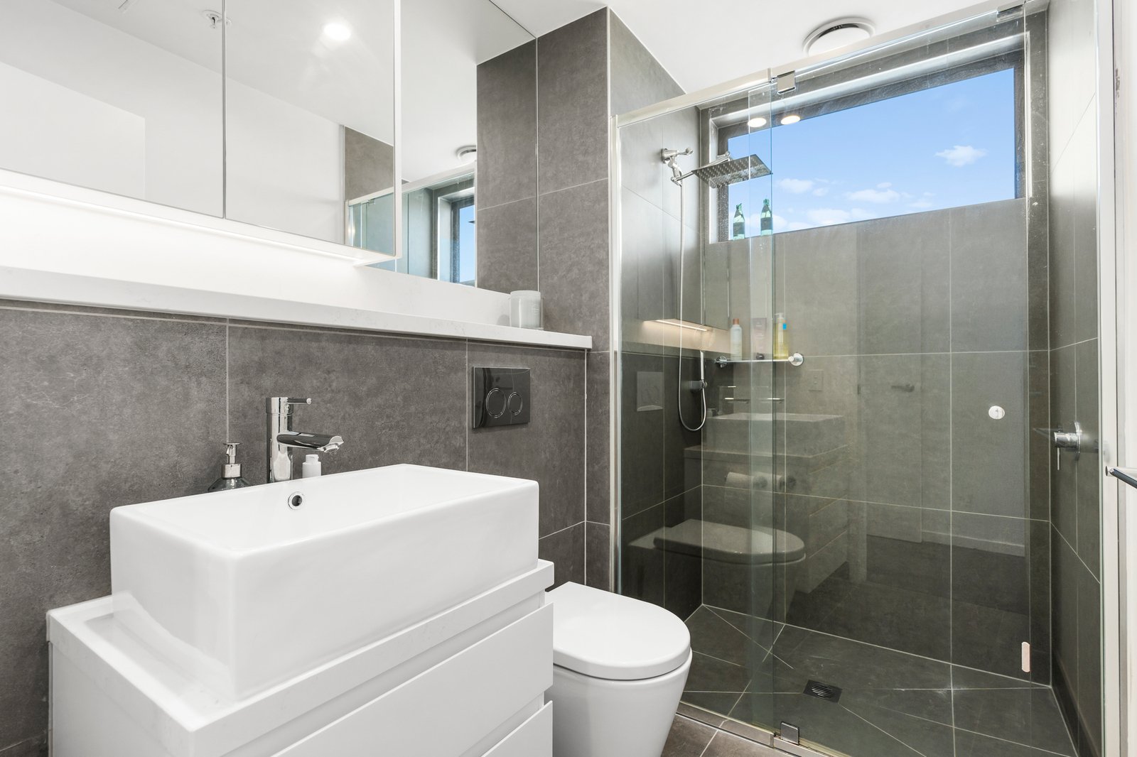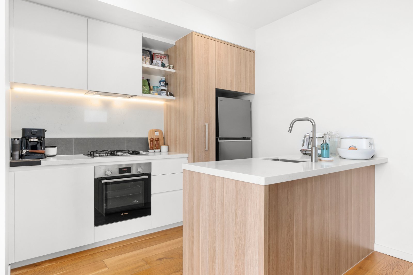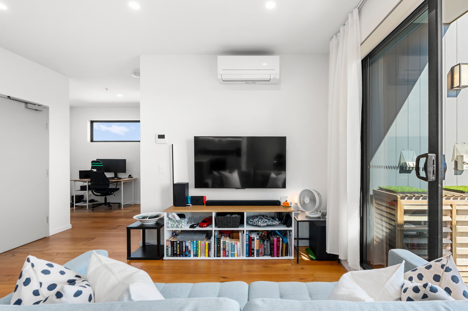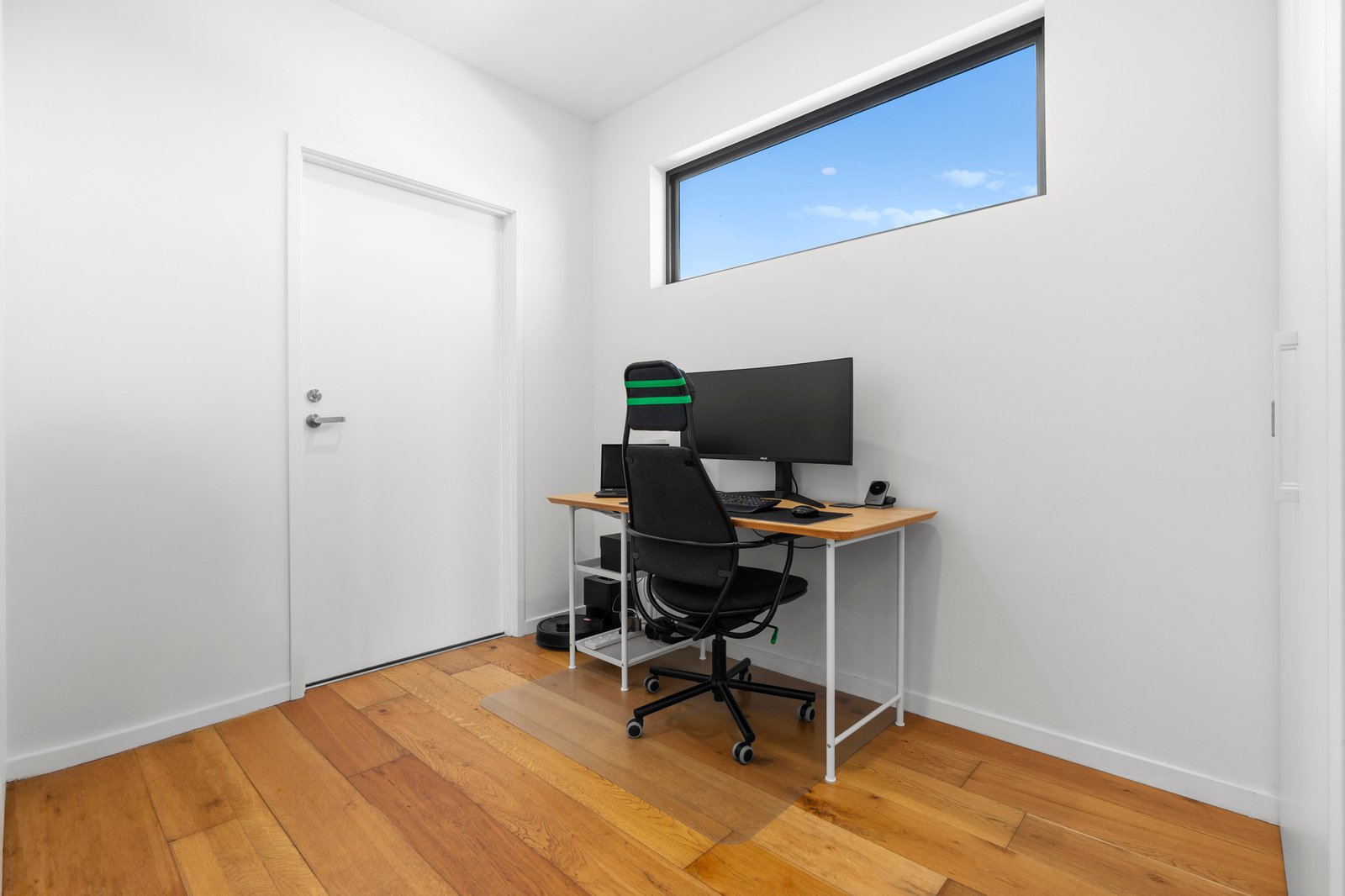 The stone-finished kitchen is both stylish and functional, featuring soft-closing cabinetry, a breakfast bar, and a full suite of high-performance Bosch appliances, including an integrated dishwasher. A generous study zone caters perfectly to working from home, while the spacious open-plan living and dining area seamlessly extends to a partially sheltered terrace—ideal for relaxing or entertaining against a breathtaking backdrop of the CBD and Box Hill skyline.