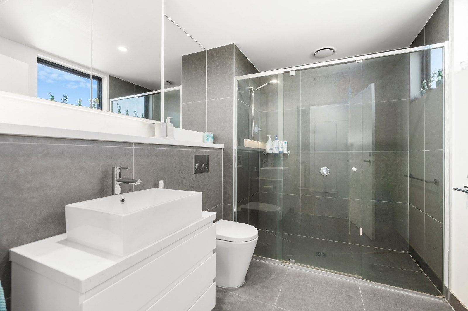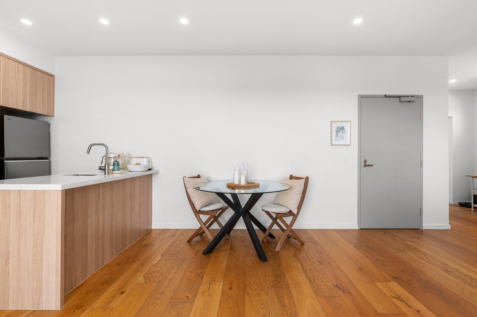Accommodation is thoughtfully designed, with two large, light-filled bedrooms fitted with mirrored built-in robes, including a main bedroom complete with a sleek ensuite. The fully tiled central bathroom showcases an oversized shower, concealed cistern, and mirrored cabinetry, complemented by a spacious Euro-style laundry.