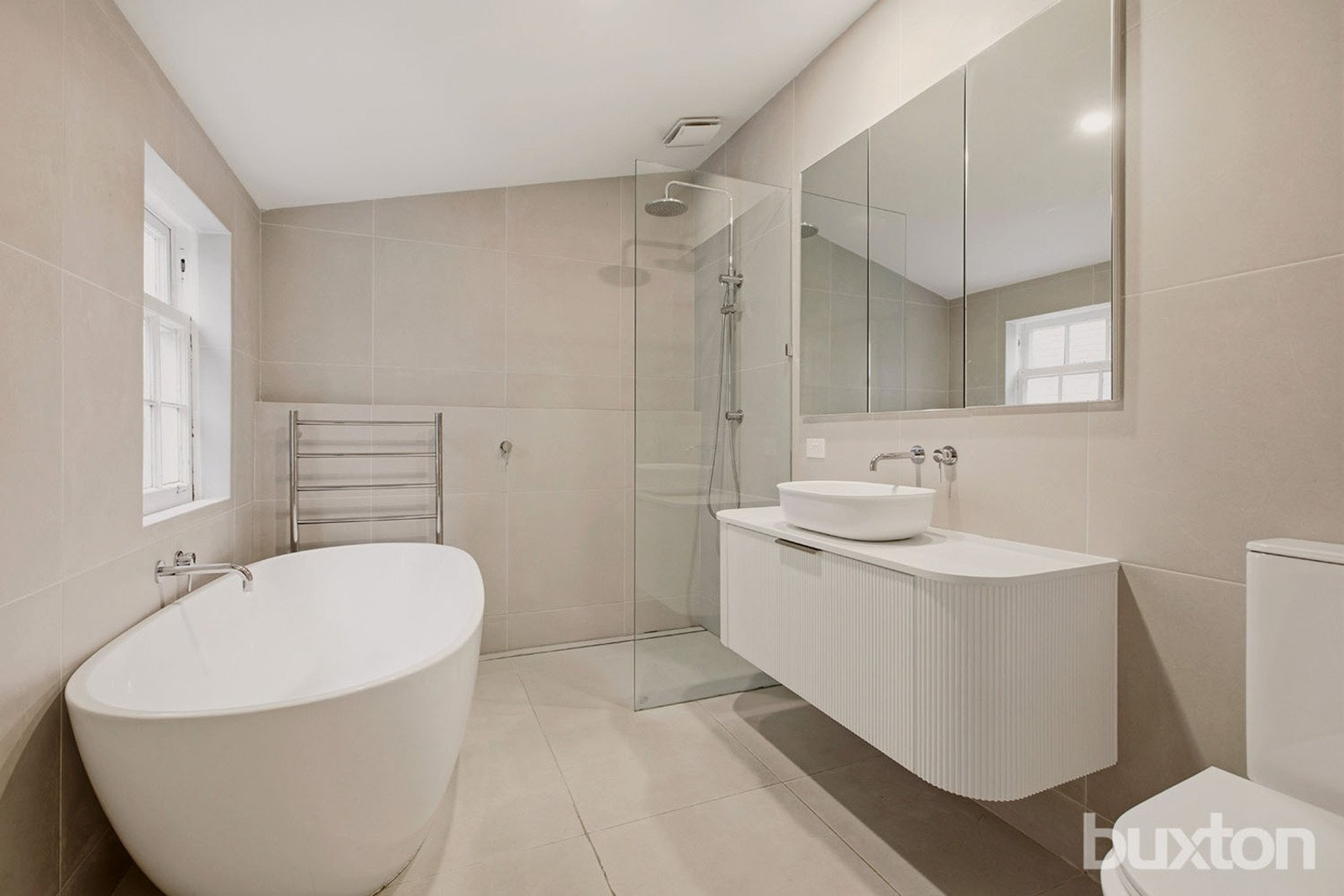 Both bedrooms are well-proportioned and filled with natural light, serviced by a modern bathroom complete with a freestanding bath and separate shower.