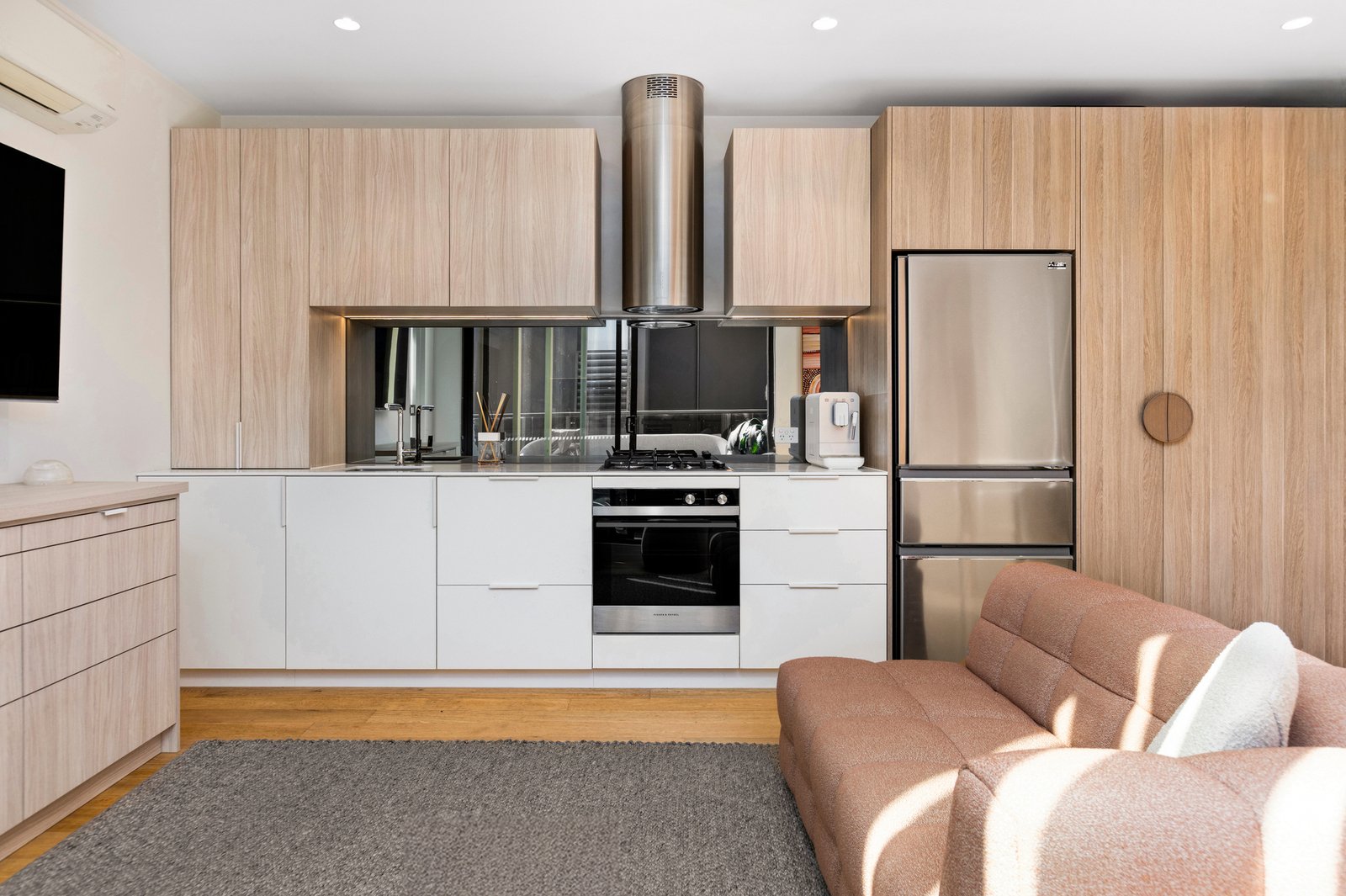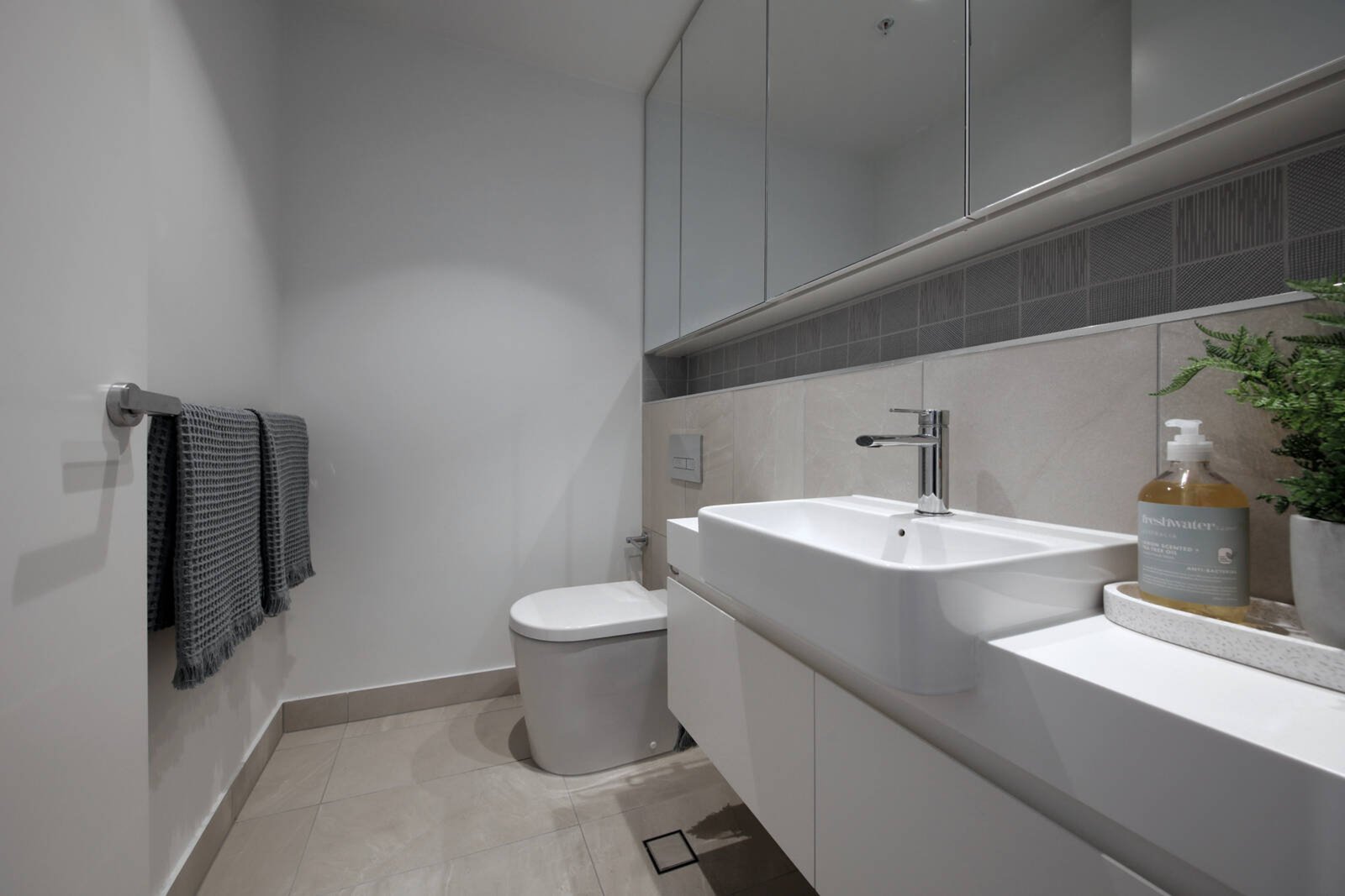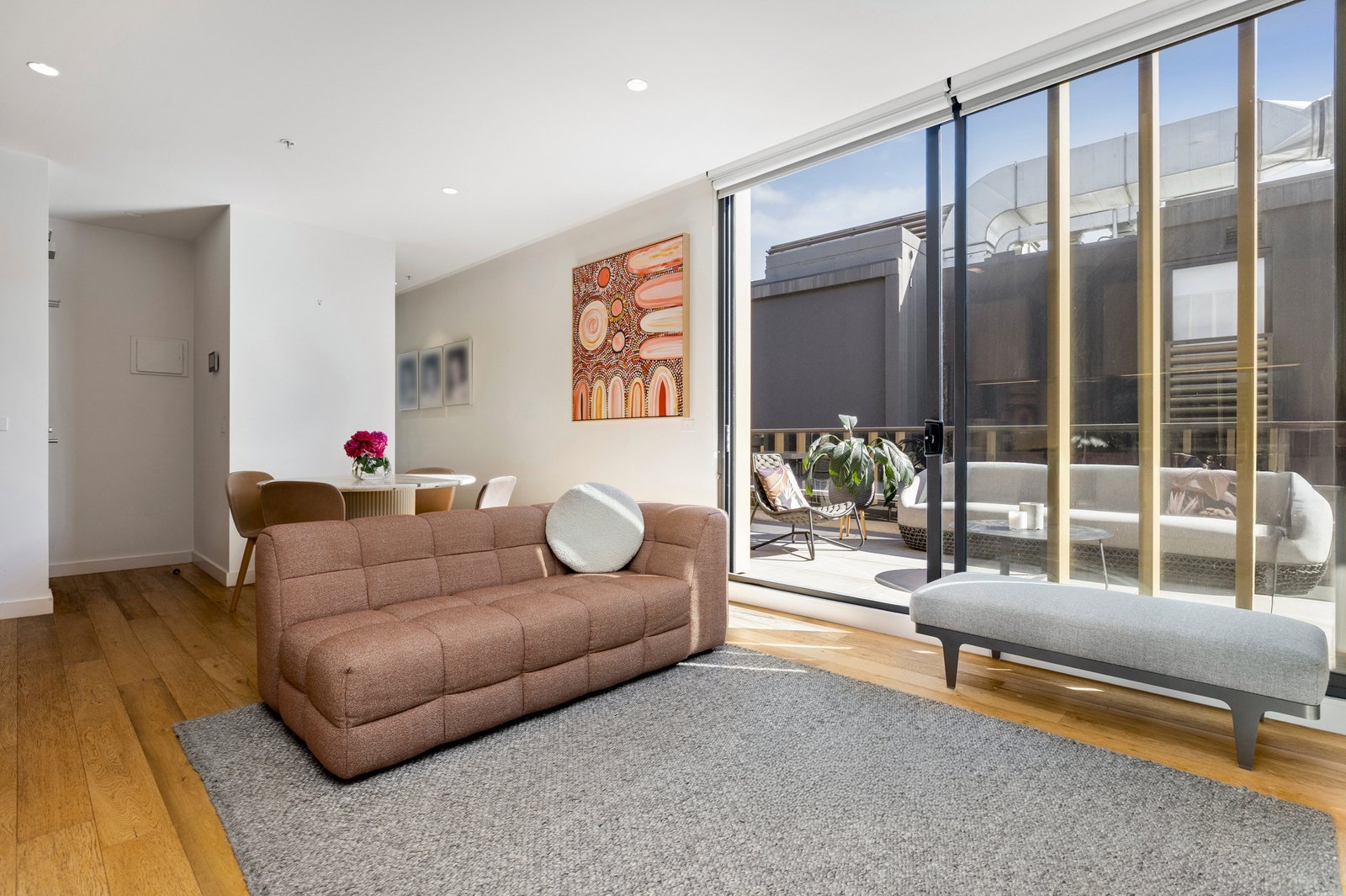 Floor-to-ceiling windows capture natural light throughout, while soft neutral tones add a sense of calm to open-plan living/dining, bespoke kitchen appointed with soft close cabinetry, stone surfaces and stainless steel appliances and glorious entertaining balcony.