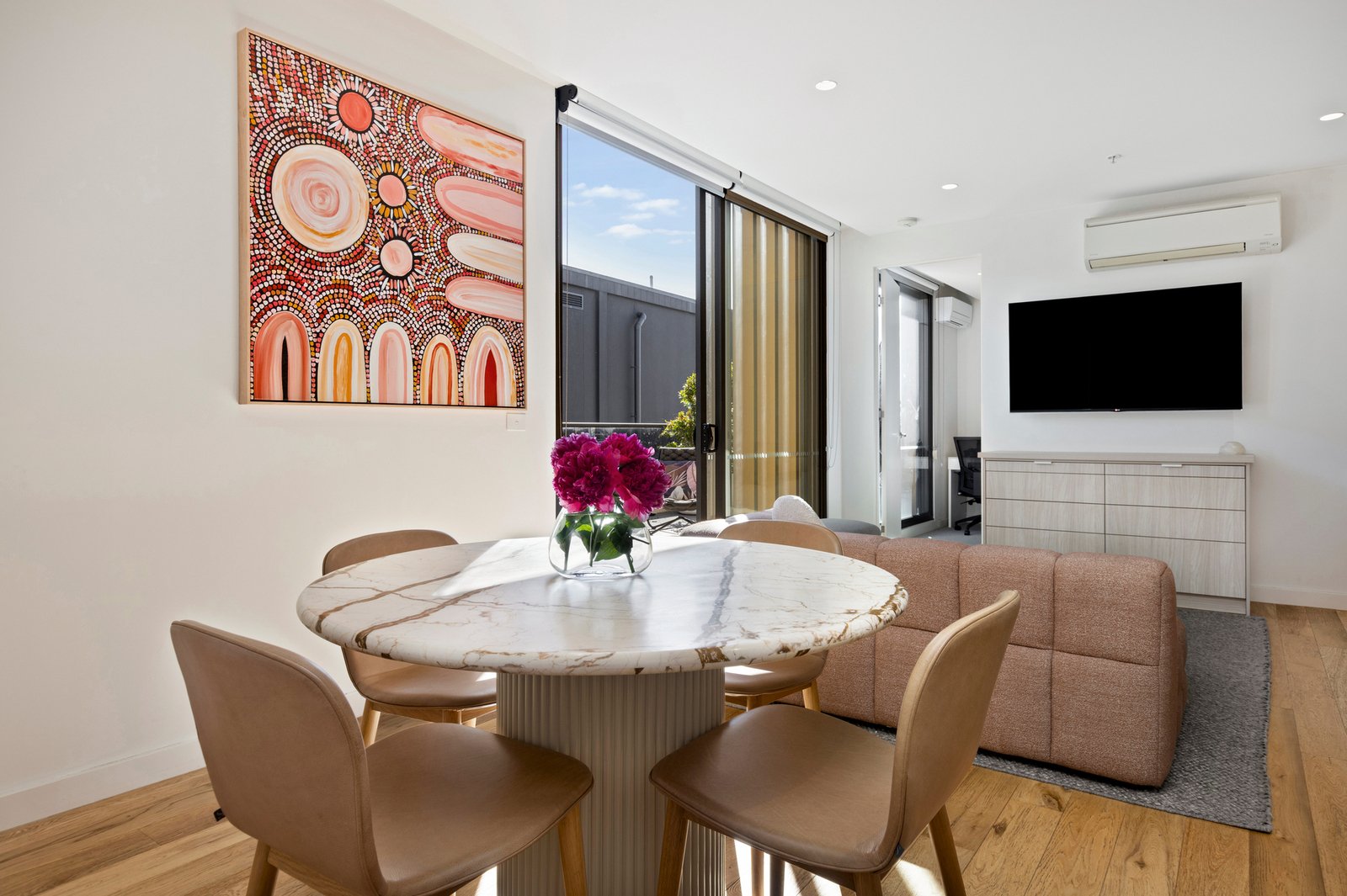 Floor-to-ceiling windows capture natural light throughout, while soft neutral tones add a sense...