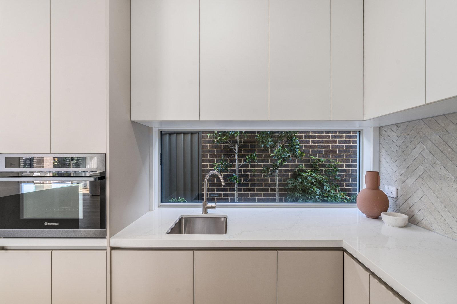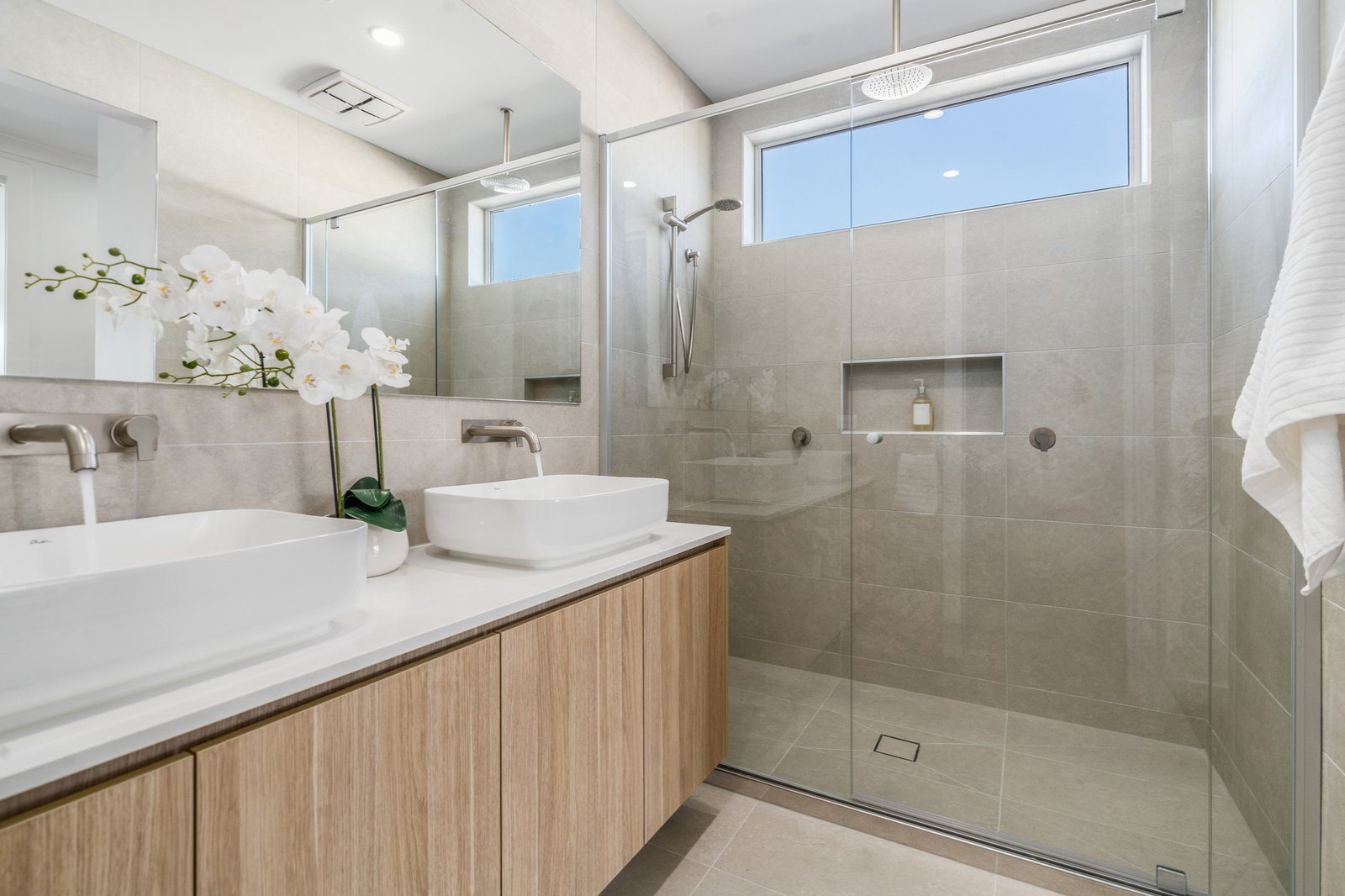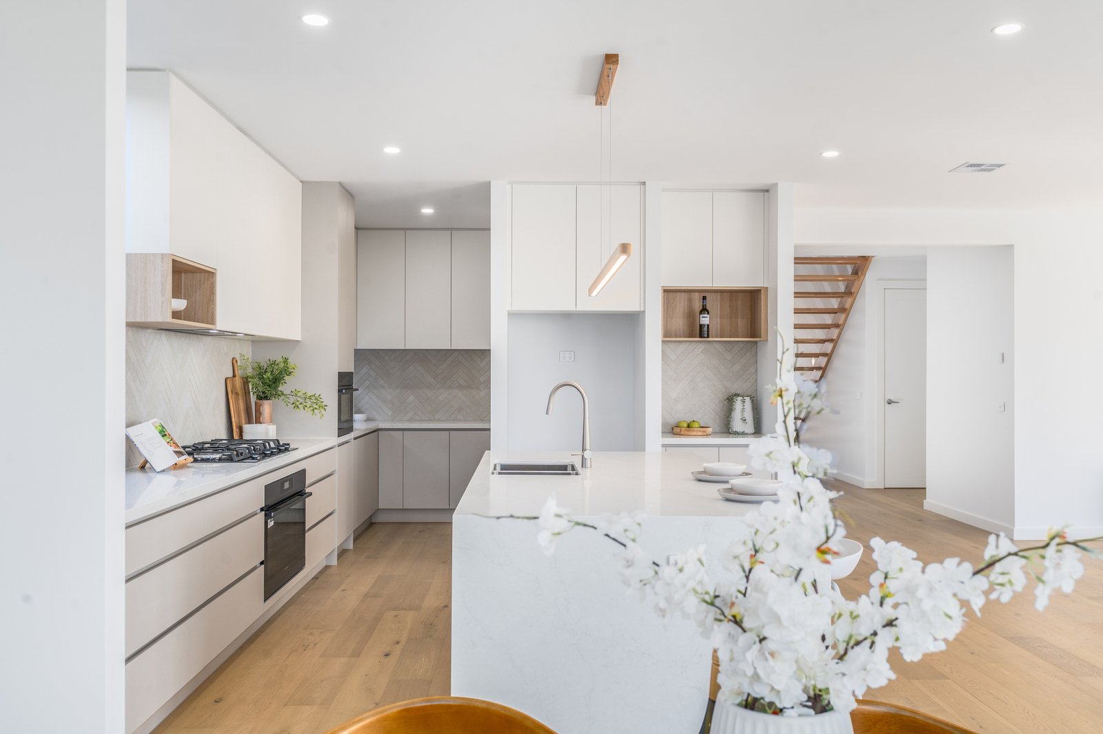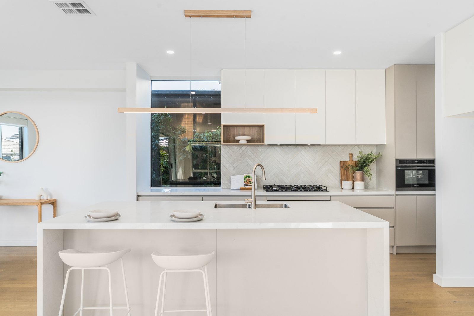 The heart of the home is a showstopping kitchen featuring premium 40mm Stone Ambassador Mirabella benchtops, undermount sinks, soft-close cabinetry, and high-end Westinghouse appliances including a 90cm pyrolytic oven and additional combi oven/microwave. The expansive open-plan living and dining area seamlessly connects to the alfresco via stacker doors, creating the perfect setting for effortless indoor-outdoor entertaining. Upstairs, an additional living retreat complements the generous accommodation, with oversized bedrooms featuring walk-in robes, while the rear bedroom and front balcony capture glimpses of the bay, adding a beautiful coastal touch. Luxurious bathrooms are finished with floor-to-ceiling tiles, dual showerheads with rain head features, and elegant brushed nickel fixtures throughout.