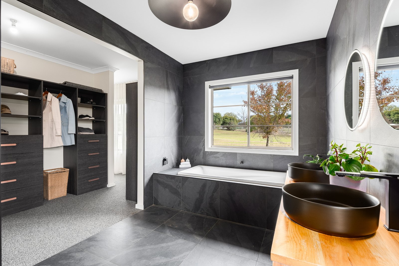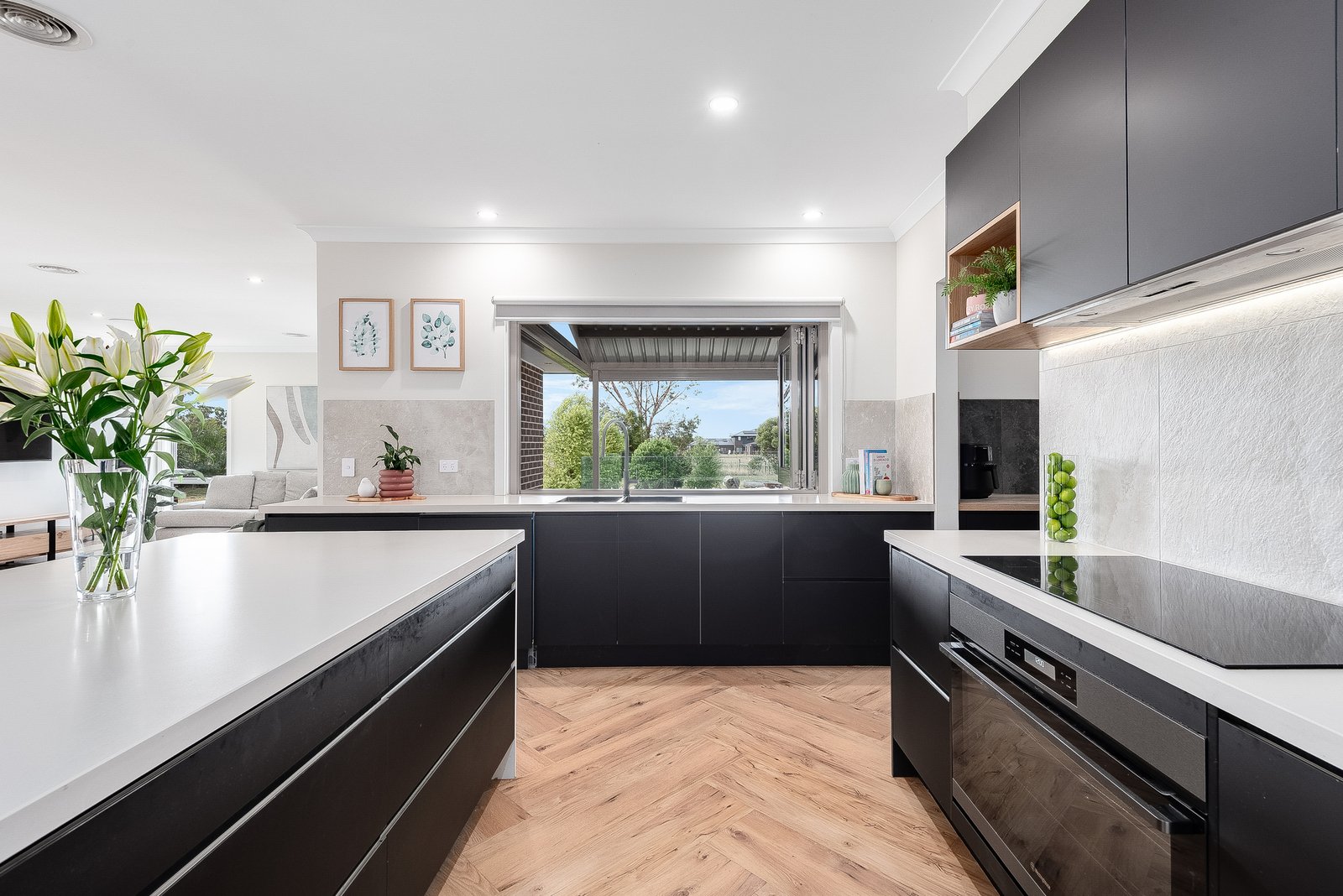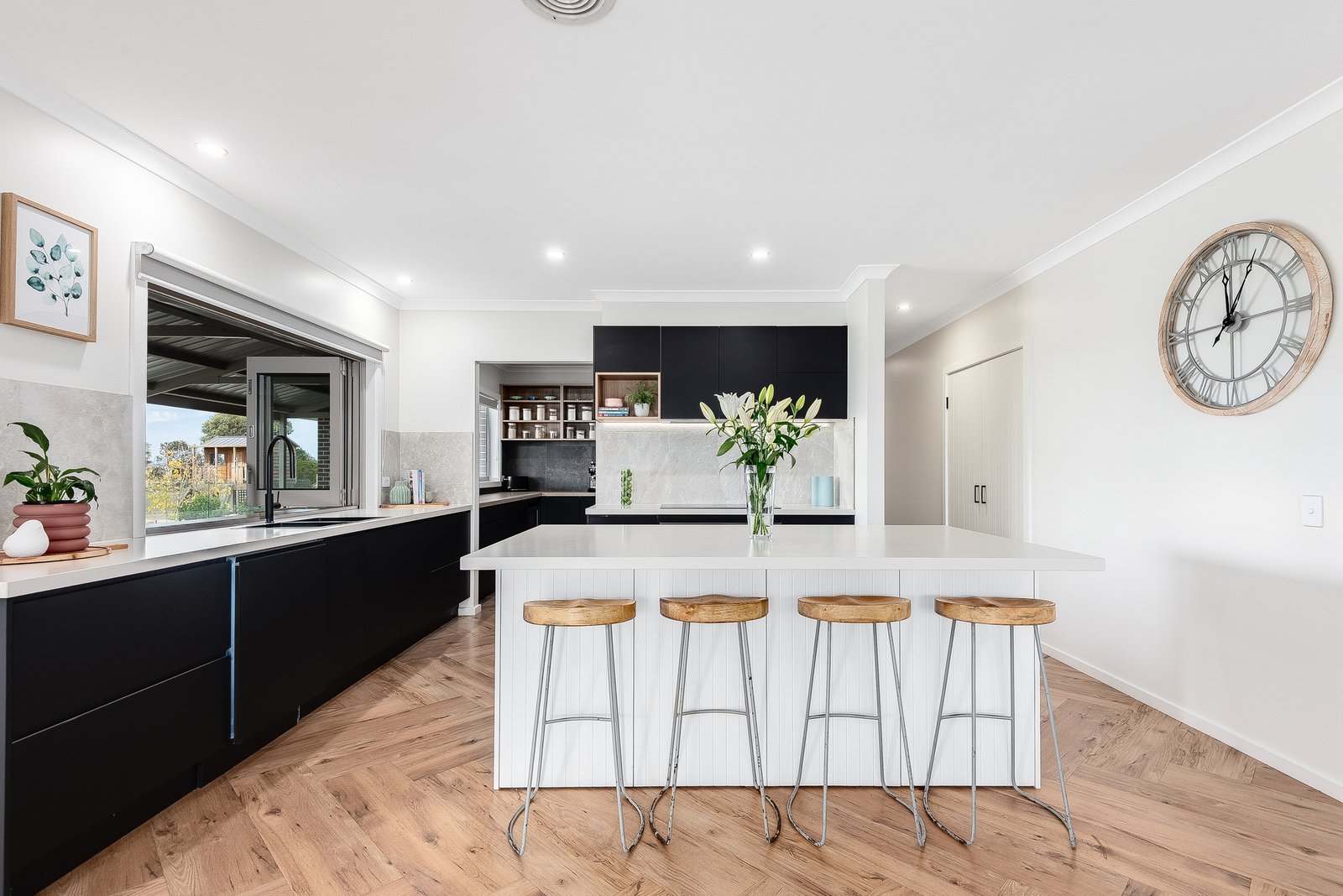 The formal lounge at the front of the home features a gas log fire and home theatre projector, offering an ambient space to retreat, watch a movie or send the kids to play. The main living area transitions to a light filled open plan kitchen, dining and living zone connecting with the alfresco for seamless indoor outdoor flow. A woodfire heater creates a cosy atmosphere, while large windows and glass sliders frame picturesque outlooks across the surrounding grounds. The stylish kitchen features stone benchtops, quality appliances including a 900mm Westinghouse oven, induction cooktop, integrated dishwasher, generous storage including a large butler’s pantry with second sink, and a bifold servery window to the alfresco for effortless entertaining.