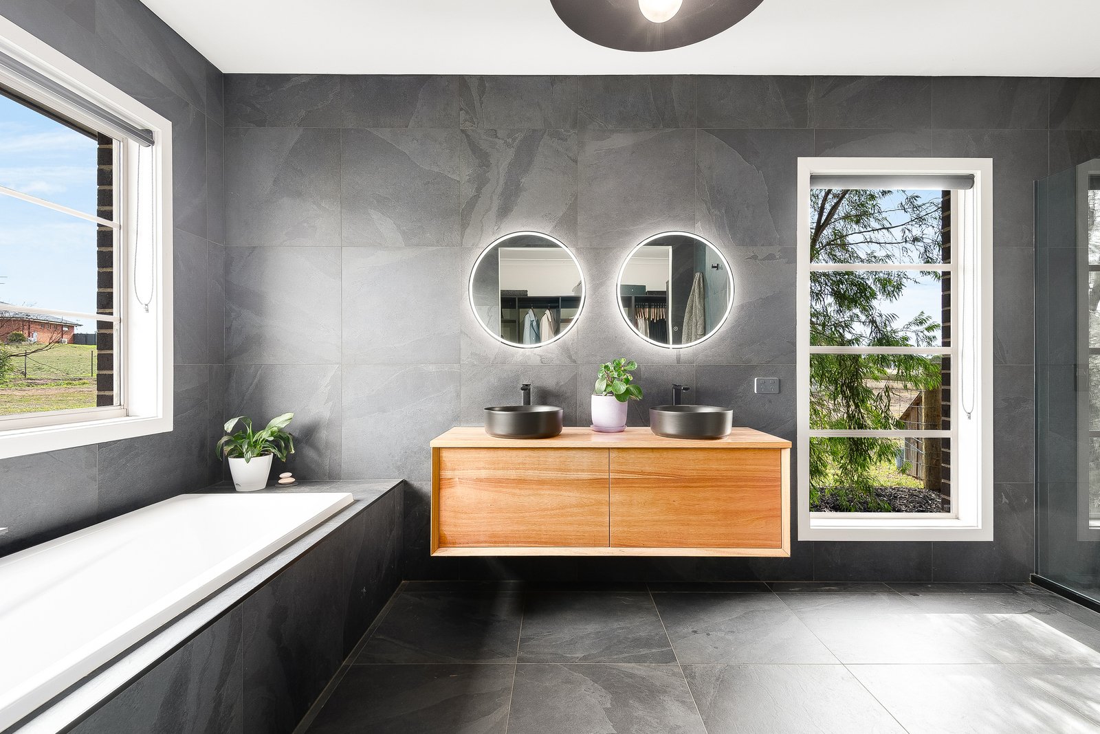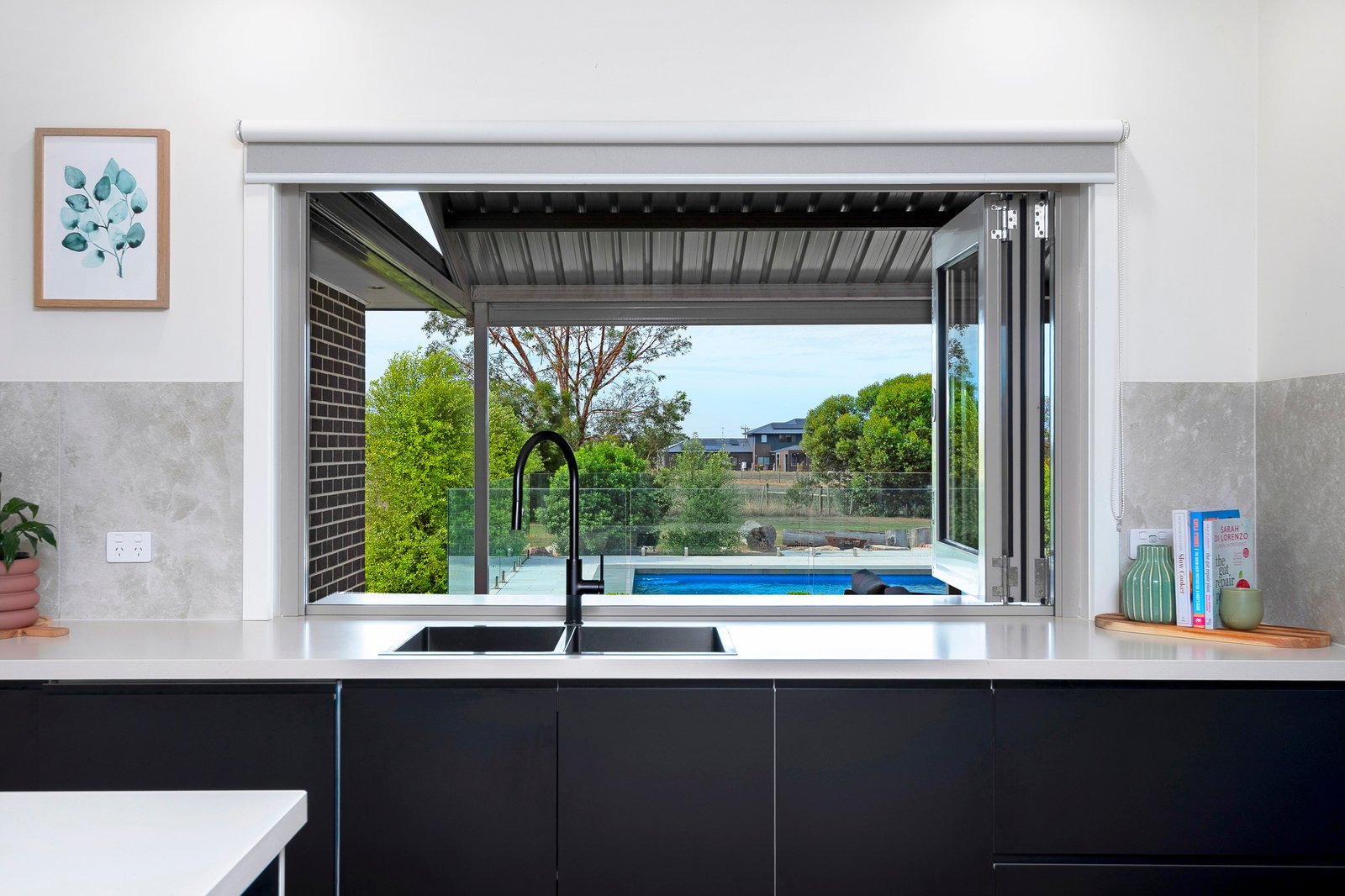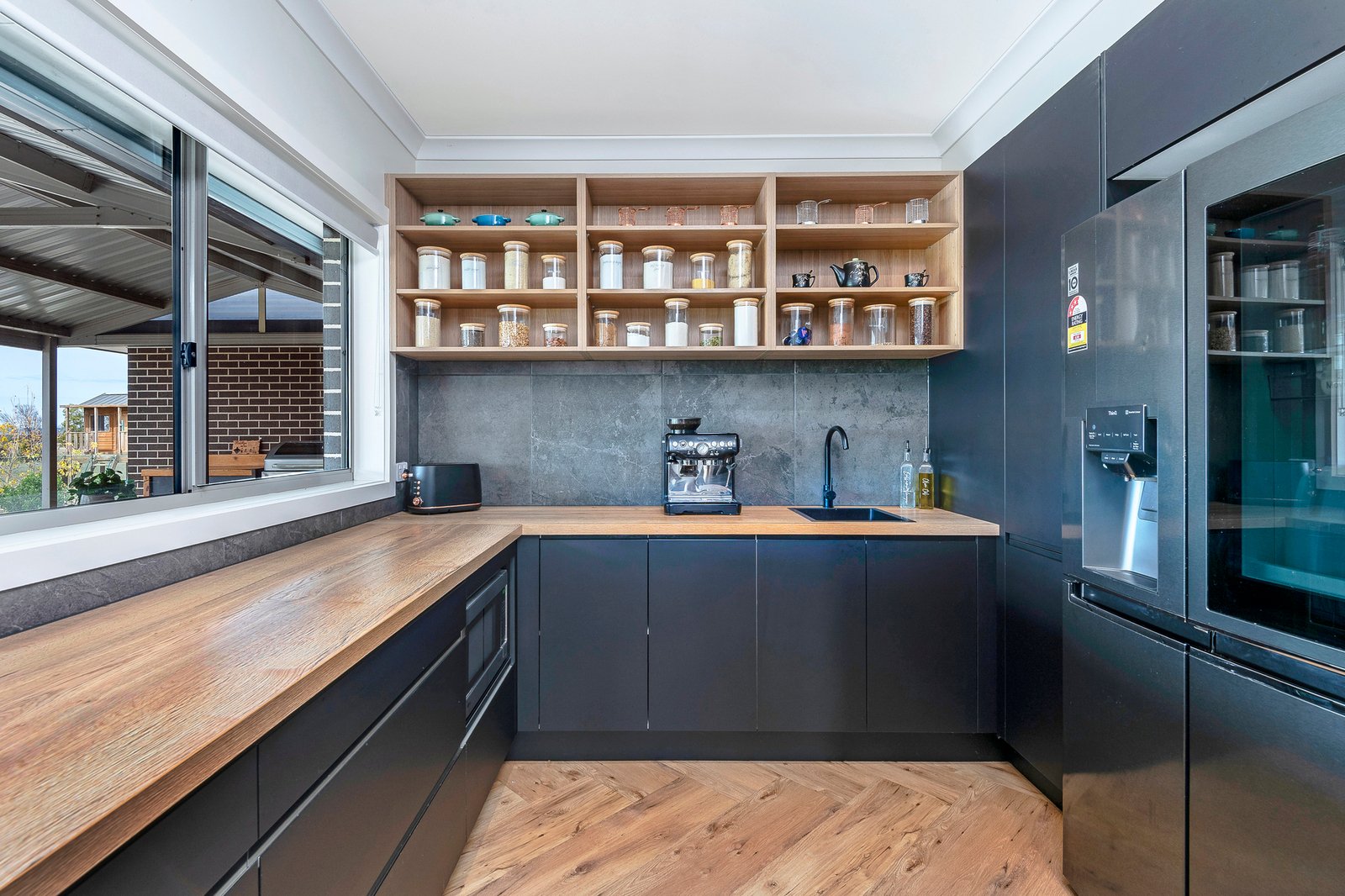 The formal lounge at the front of the home features a gas log fire and home theatre projector, offering an ambient space to retreat, watch a movie or send the kids to play. The main living area transitions to a light filled open plan kitchen, dining and living zone connecting with the alfresco for seamless indoor outdoor flow. A woodfire heater creates a cosy atmosphere, while large windows and glass sliders frame picturesque outlooks across the surrounding grounds. The stylish kitchen features stone benchtops, quality appliances including a 900mm Westinghouse oven, induction cooktop, integrated dishwasher, generous storage including a large butler’s pantry with second sink, and a bifold servery window to the alfresco for effortless entertaining.