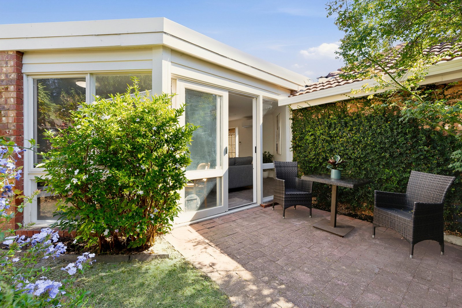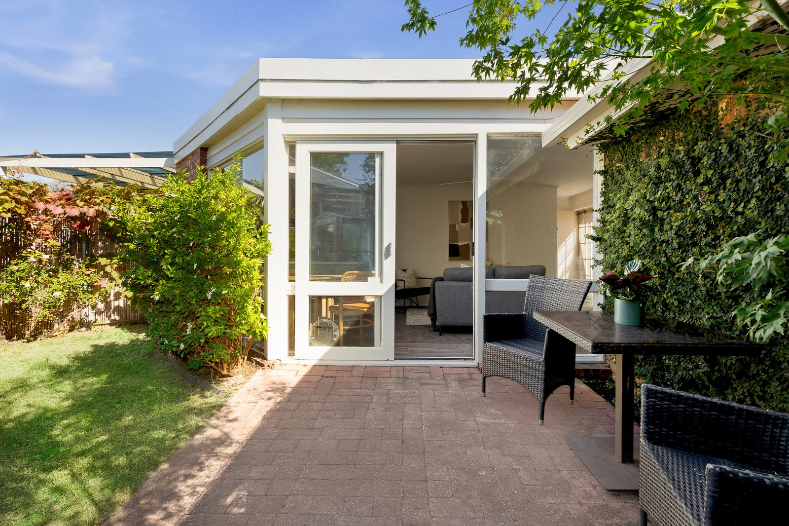 A wall of windows frames established greenery, while glass sliders extend the living space to an oversized courtyard, where paved and lawn areas offer a tranquil, sun-swept setting for entertaining or relaxation. Residents also enjoy access to a shared ‘community room’, featuring a glass-wrapped lounge, tea room, bathroom facilities and a leafy garden outlook.