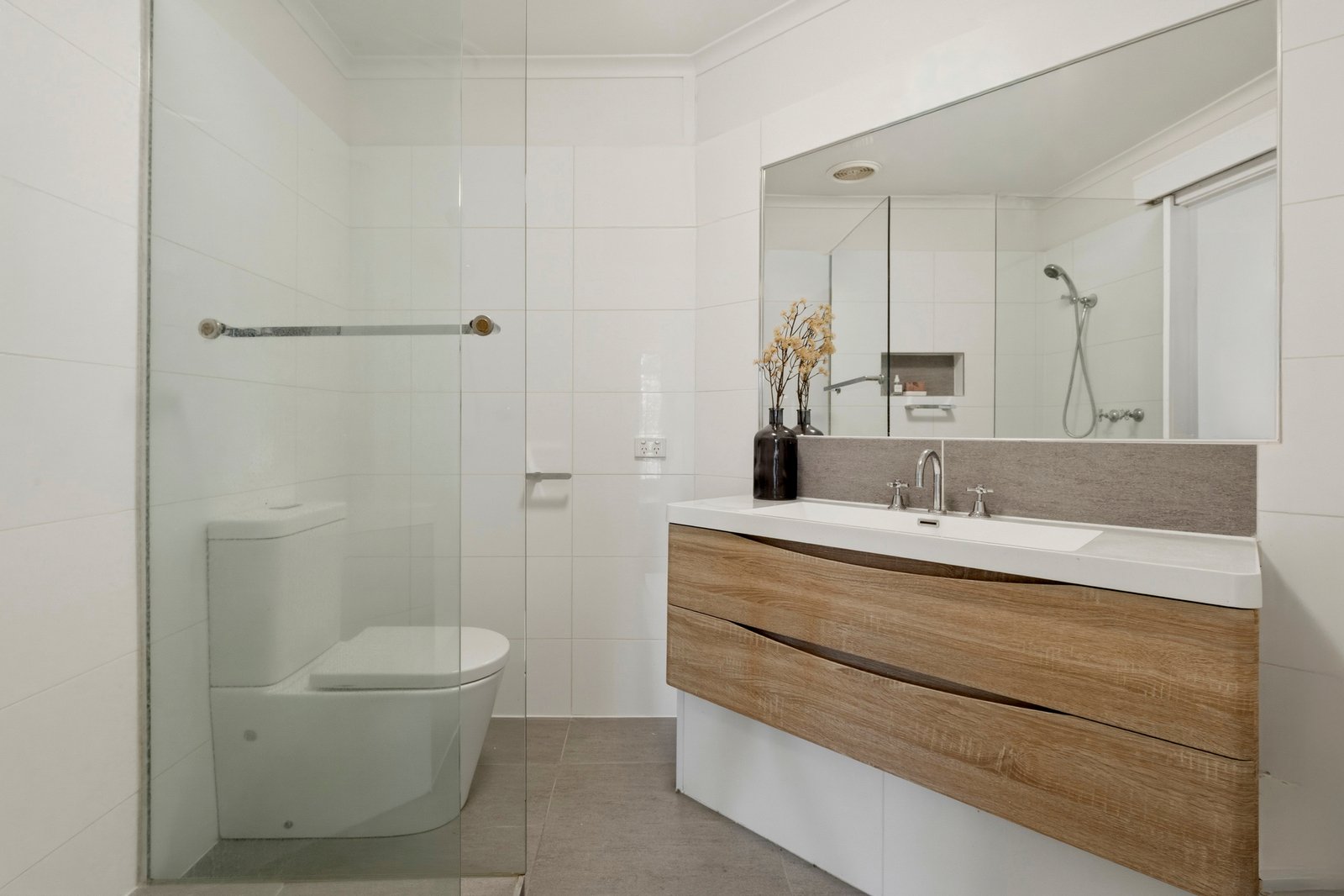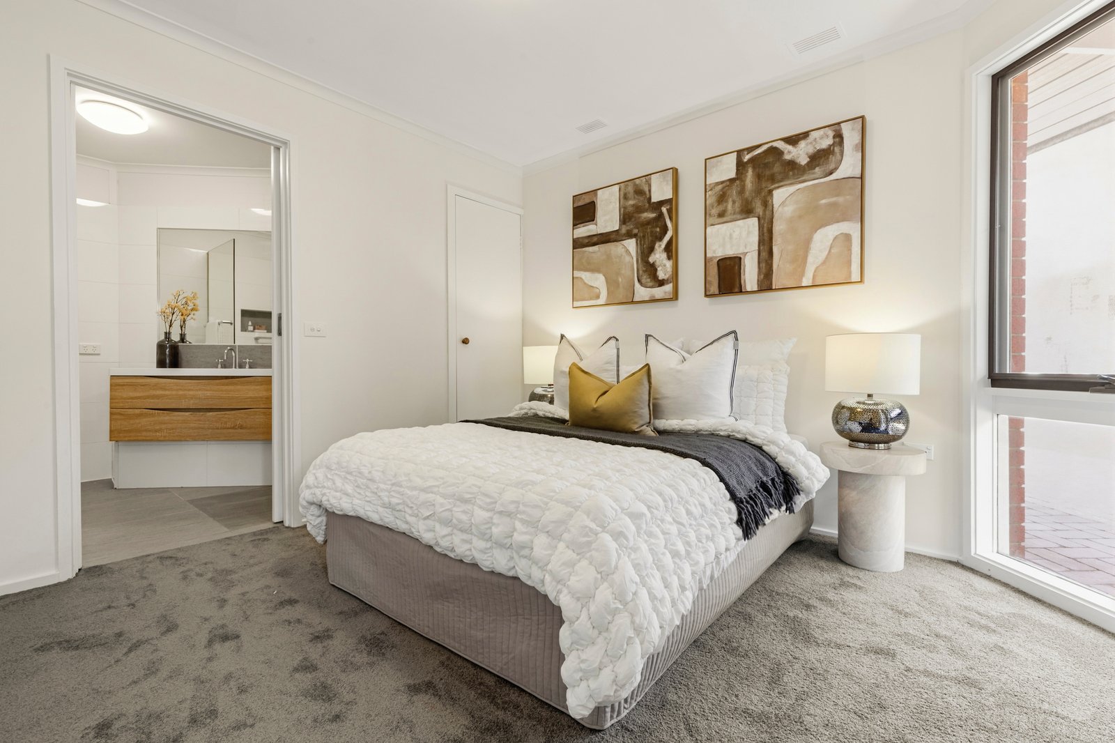 The generously proportioned bedroom includes extensive built-in robes and a pristine ensuite, complete with a porcelain vanity, frameless glass shower with a tiled storage niche, and integrated laundry taps. Freshly painted and enhanced by plush new carpet, split-system heating and cooling, and a ceiling fan, the home also includes off-street parking for added peace of mind.