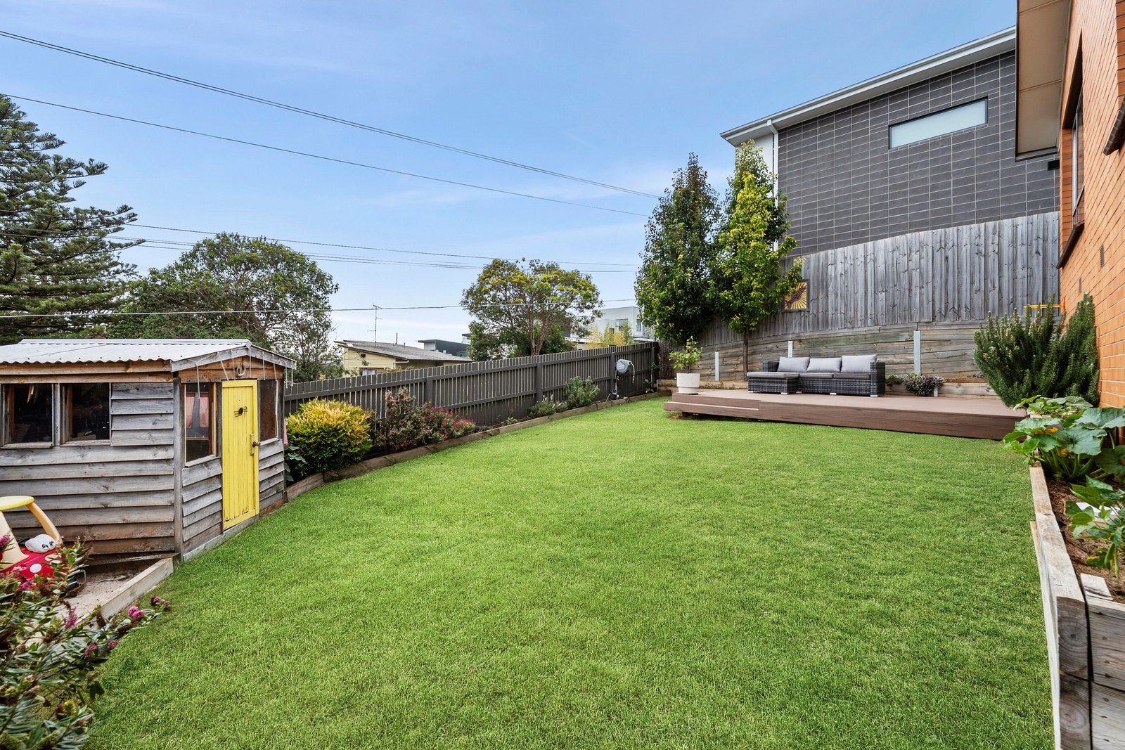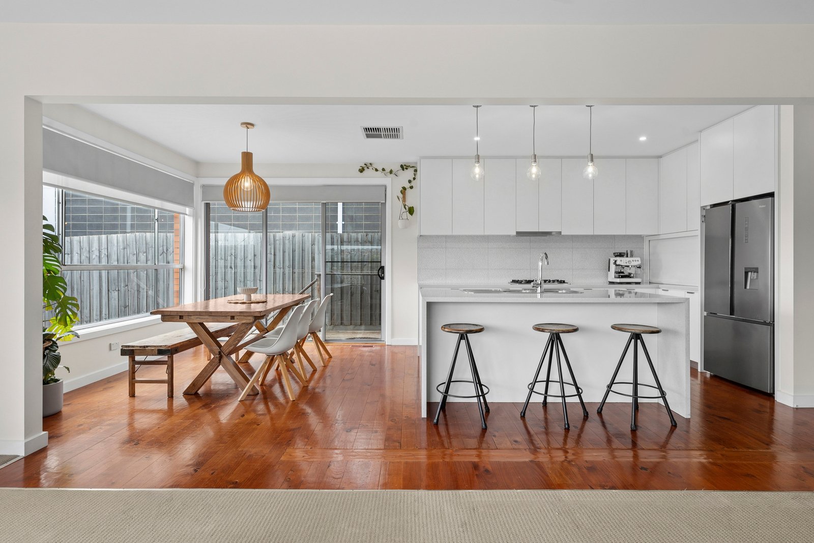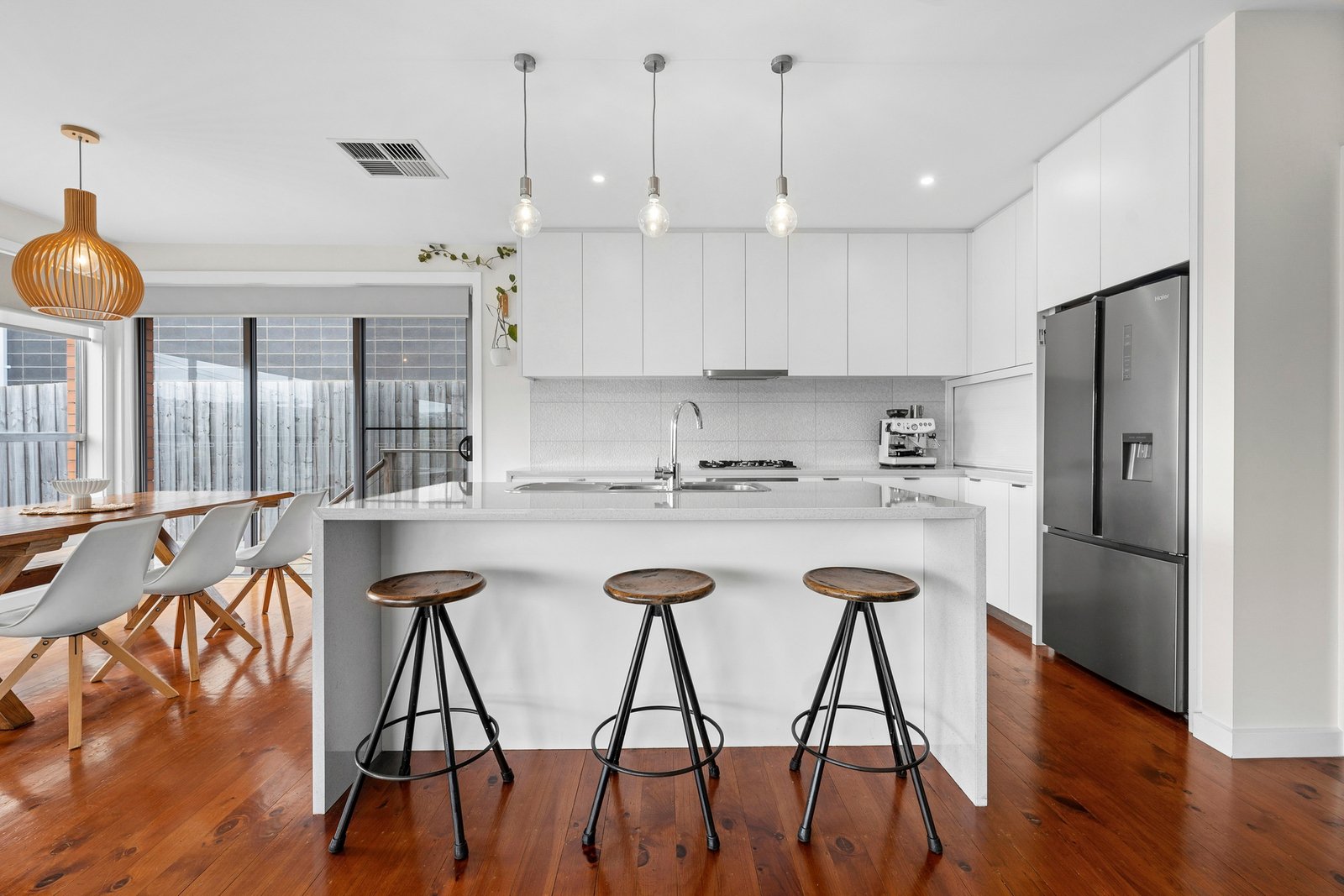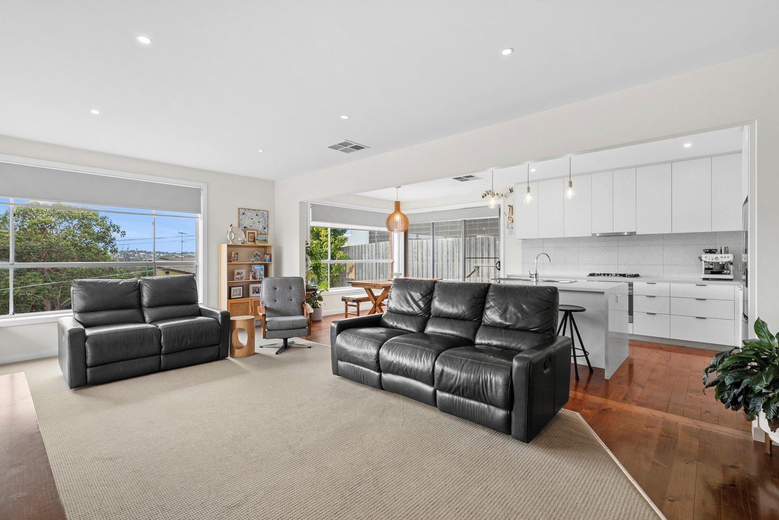 Set behind a high fence, the expansive front yard offers a private space to play, relax or entertain with a north facing sun deck, large lawn area and a cubby house for the kids. Entry to the home reveals a light-filled open plan kitchen, dining and living area set against a picturesque backdrop of views to the Highton Hills. The stylish kitchen features polished timber floors, a large island with waterfall benchtops, an Electrolux 600mm oven, gas cooktop, dishwasher, sleek cabinetry, elegant pendant lighting and generous storage including a walk-in pantry.