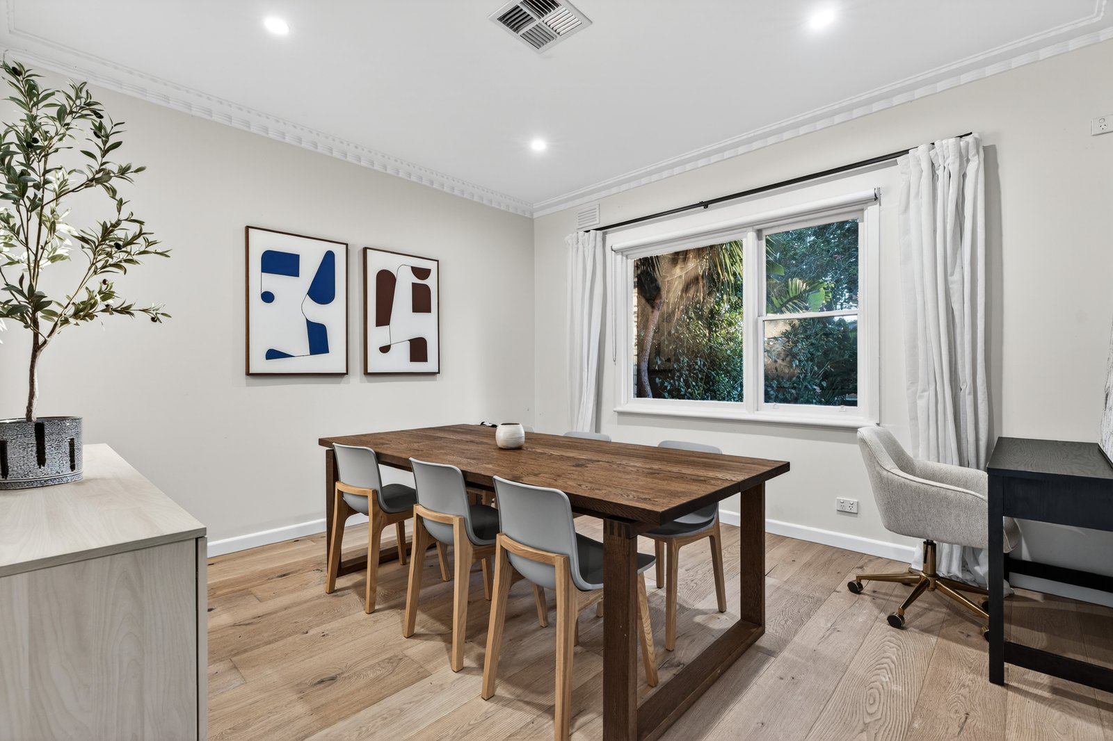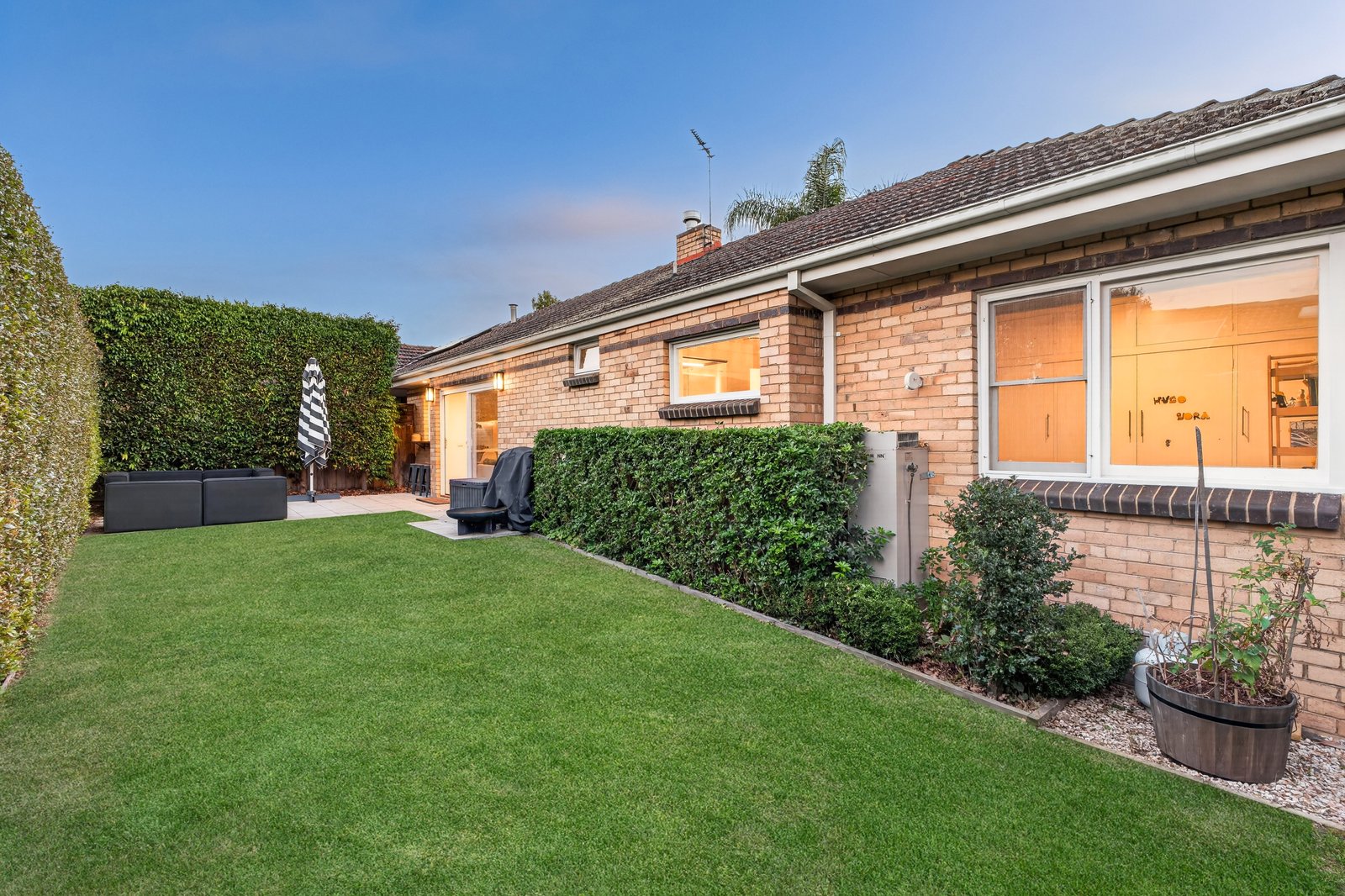 Timber floors add timeless appeal to spacious zoned interiors, with natural light flooding separate lounge (fireplace) and dining rooms. Enhancing a sense of space, the striking kitchen featuring Neff cooking appliances and Bosch semi-integrated dishwasher, complements an adjoining family/meals area, before unfolding outdoors to a huge full-width courtyard - privately screened by towering manicured hedges, creating a peaceful environment for entertaining.
