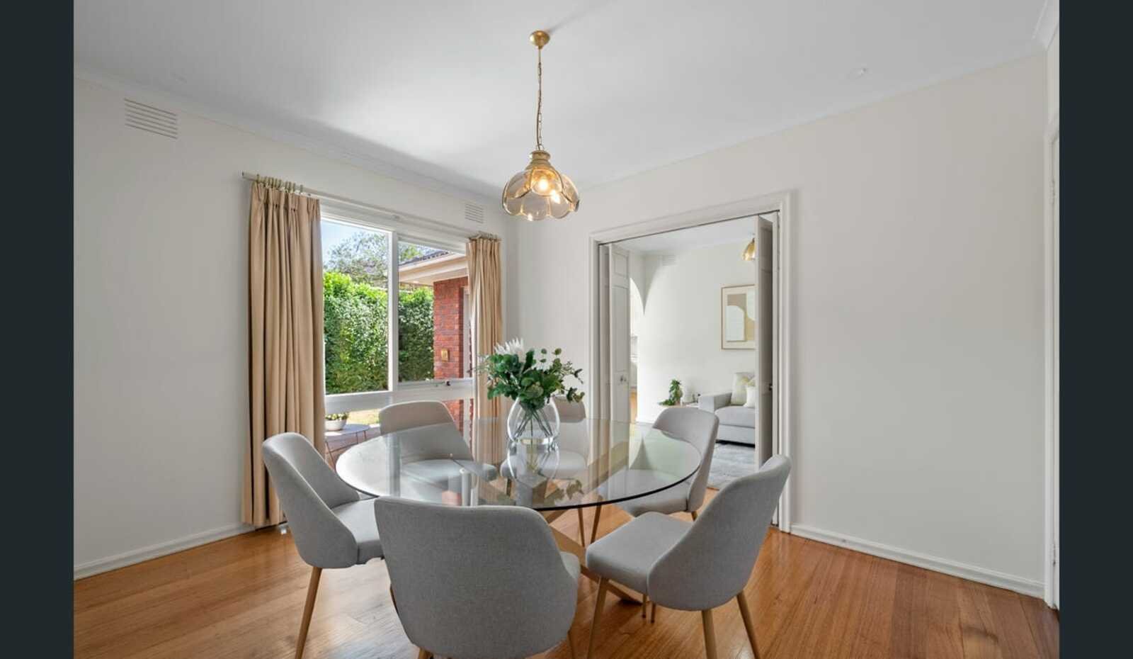 Timber floors introduce the entrance hall, leading to a sun-filled north-facing living room at the front of the home, where leafy...
