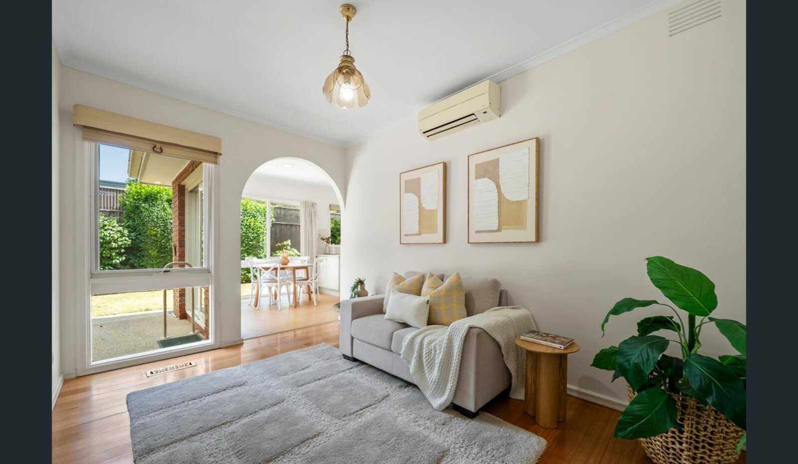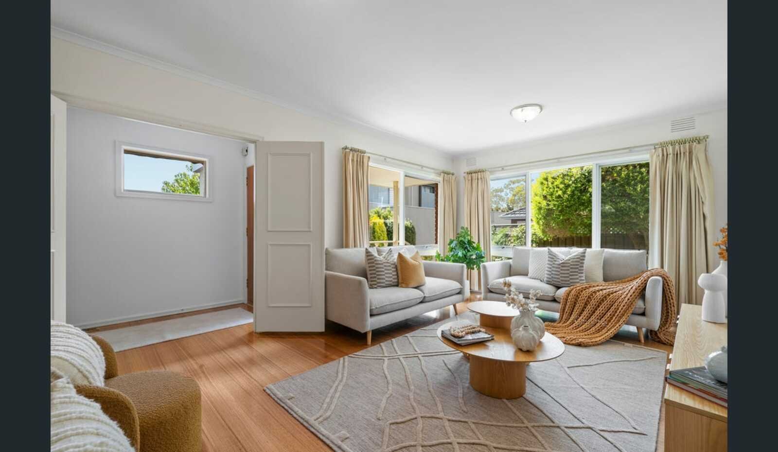 Timber floors introduce the entrance hall, leading to a sun-filled north-facing living room at the front of the home, where leafy outlooks create a relaxed and welcoming feel.