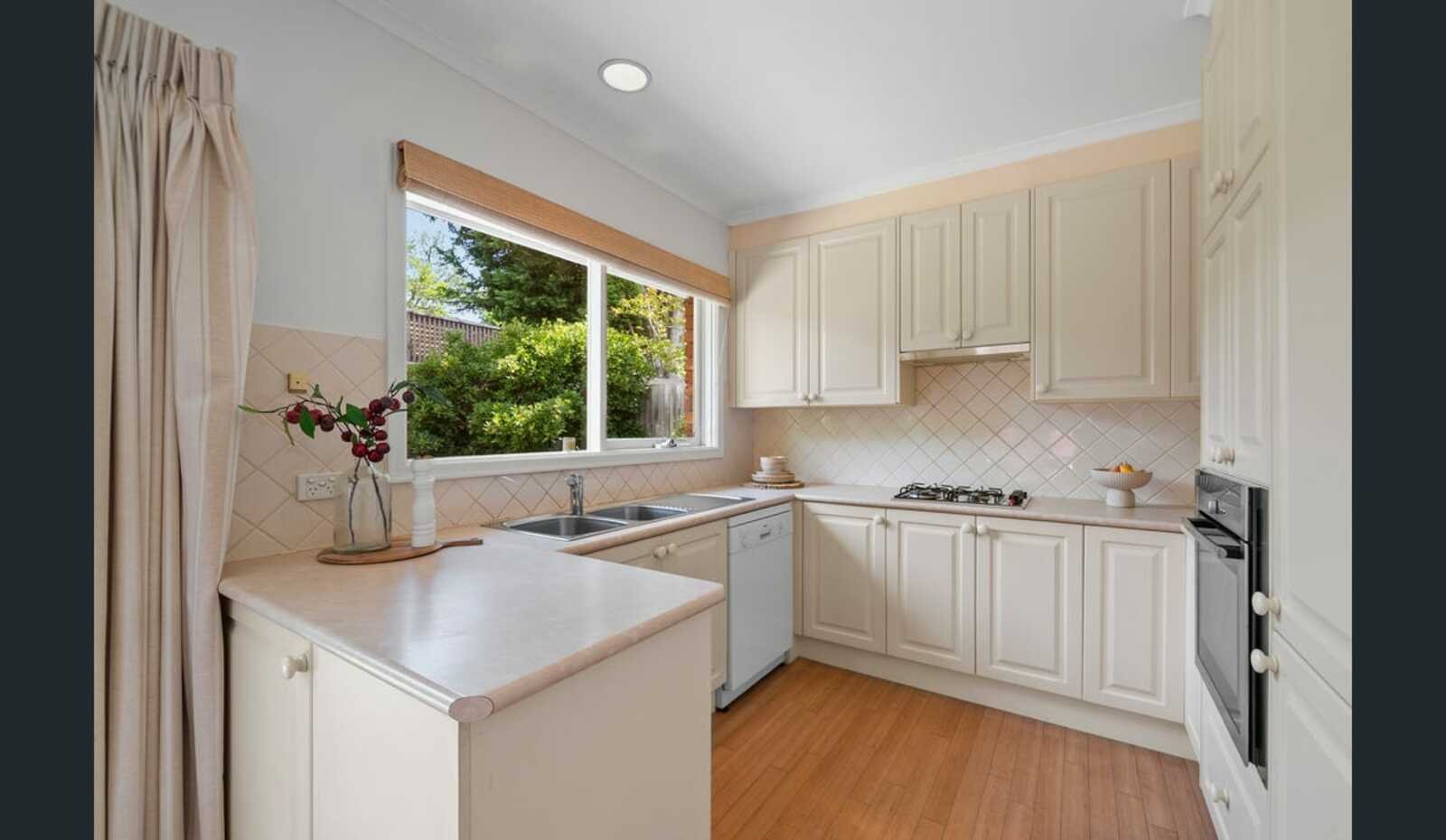 Beyond, a meals area precedes the stylish kitchen equipped with stainless steel appliances, a Bosch dishwasher and good storage. Glass sliders extend to an al fresco terrace framed by lush established greenery - a relaxed setting for outdoor dining and relaxation.