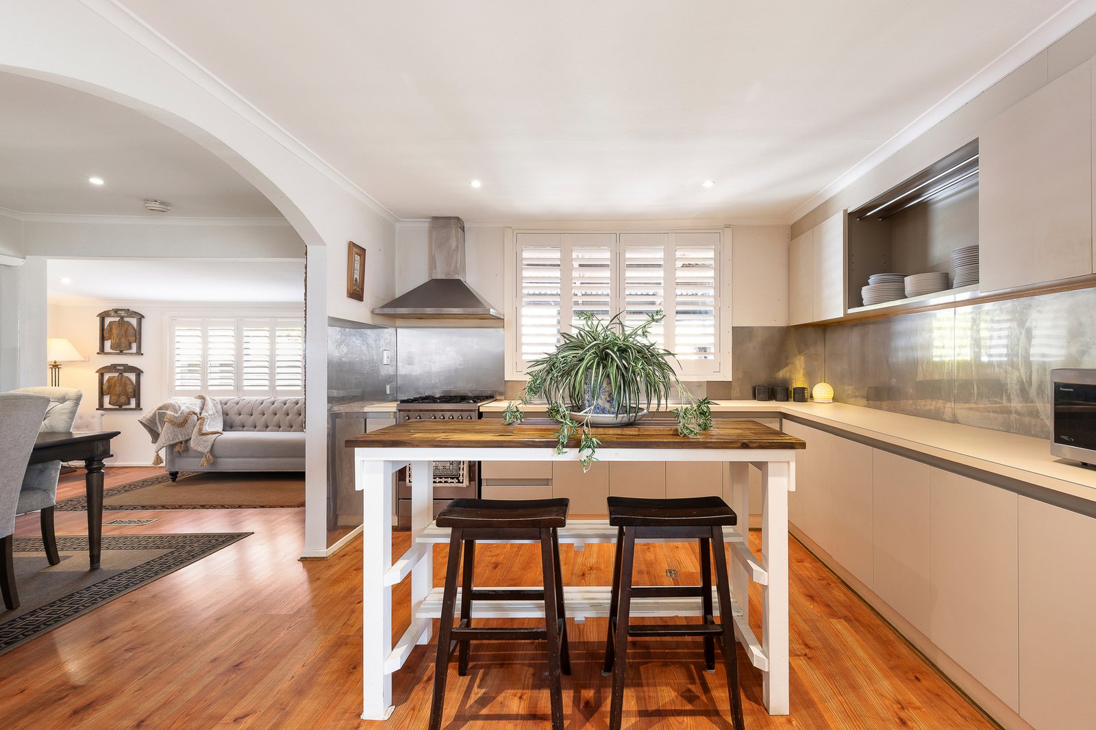 Soaring 3.36m ceilings extend through to the living domain, complete with a tiled open fireplace, creating a warm and welcoming family hub. An open-plan kitchen is truly the heart of the home with its wraparound benchtops, Smeg stove and delightful garden window. The adjoining dining zone is equally spacious, while a former sunroom offers a tranquil sitting area or ideal work-from-home space.