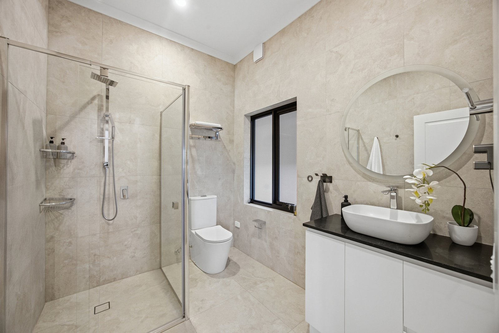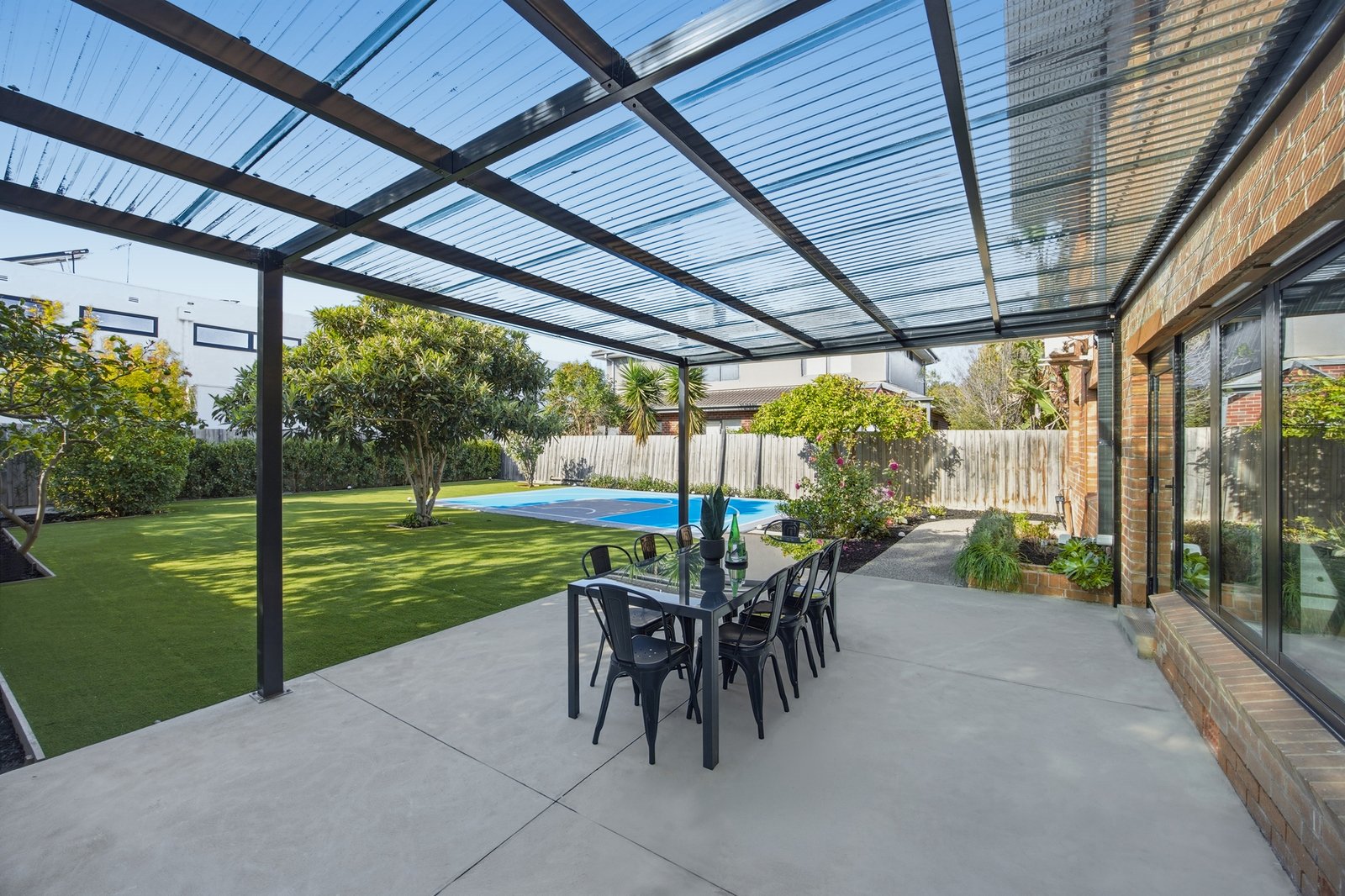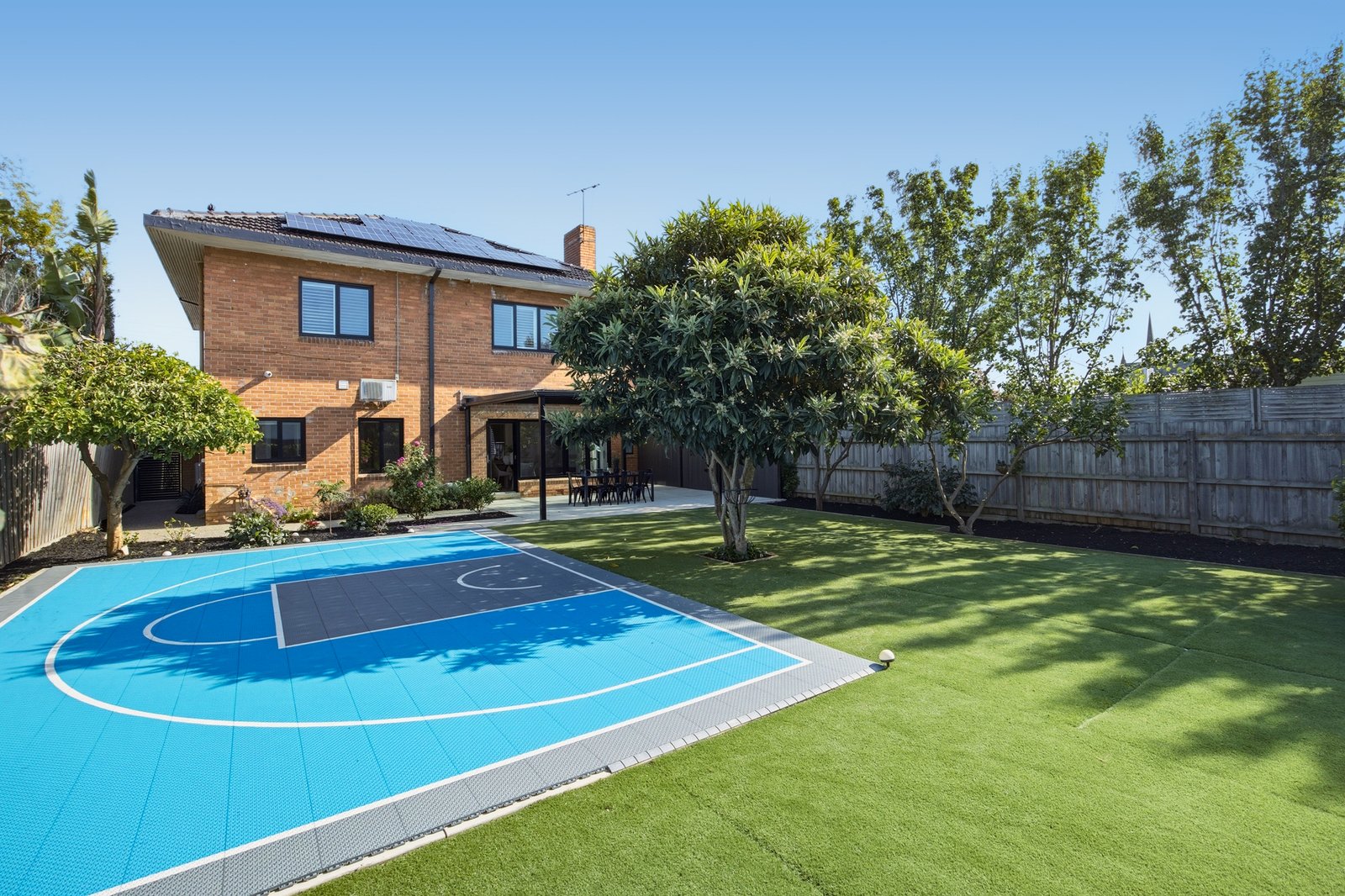 Appointed with an eye to quality with reverse-cycle air-conditioning enhanced by a wide-format faux-fireplace and double-glazing, there’s video-intercom entry enhanced by an alarm system, and an abundance of gated parking plus a secure garage. Landscaped for low-maintenance with extensive exposed aggregate paving, mow-free lawns and a kids’ paradise backyard with basketball key-court, there are great outdoors upstairs too – with a first-floor terrace stepping out see to sunsets and city-sparkle over the treetops.