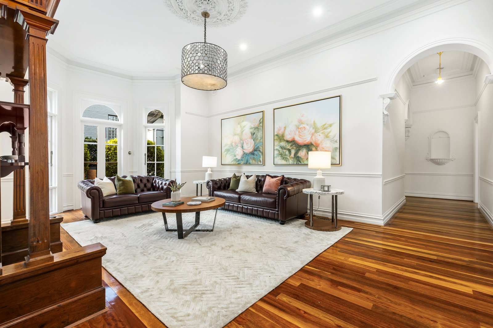 Beneath a soaring turret, an ornate parquetry-adorned entrance introduces the breathtaking original quarters, where proportion and craftsmanship immediately impress. A palatial parents’ retreat, complete with a bay window seat, extensive built-in storage and a dual-vanity ensuite, is accompanied by a nursery or fifth bedroom. A wide corbel-arched hallway reveals an expansive formal lounge centred around an ornamental tiled fireplace and bay window, alongside an elegant formal dining room or music salon.