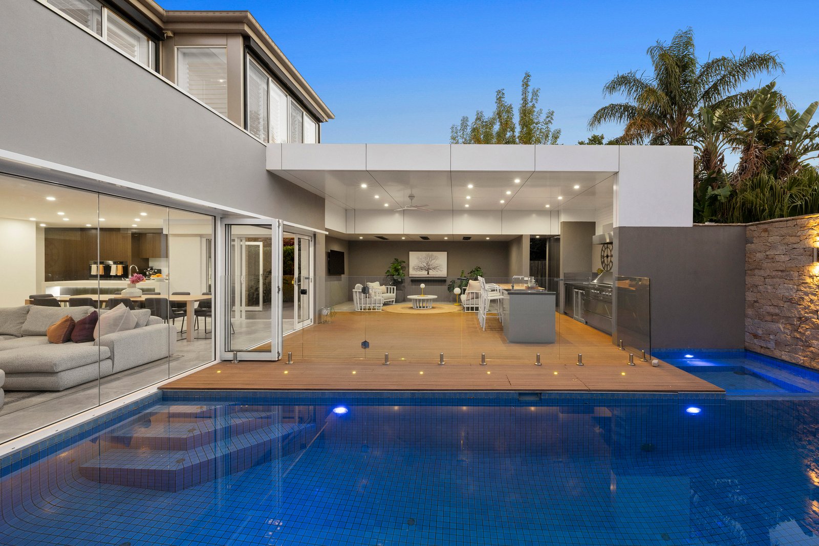 Just metres from the secondary college and Sandringham East Primary School, and surrounded by parks and reserves, the home immediately impresses with its scale and quality. Upon entry, high ceilings and a wide entrance hall draw the eye past a floating staircase and vast open plan interiors to the sparkling pool & spa beyond.