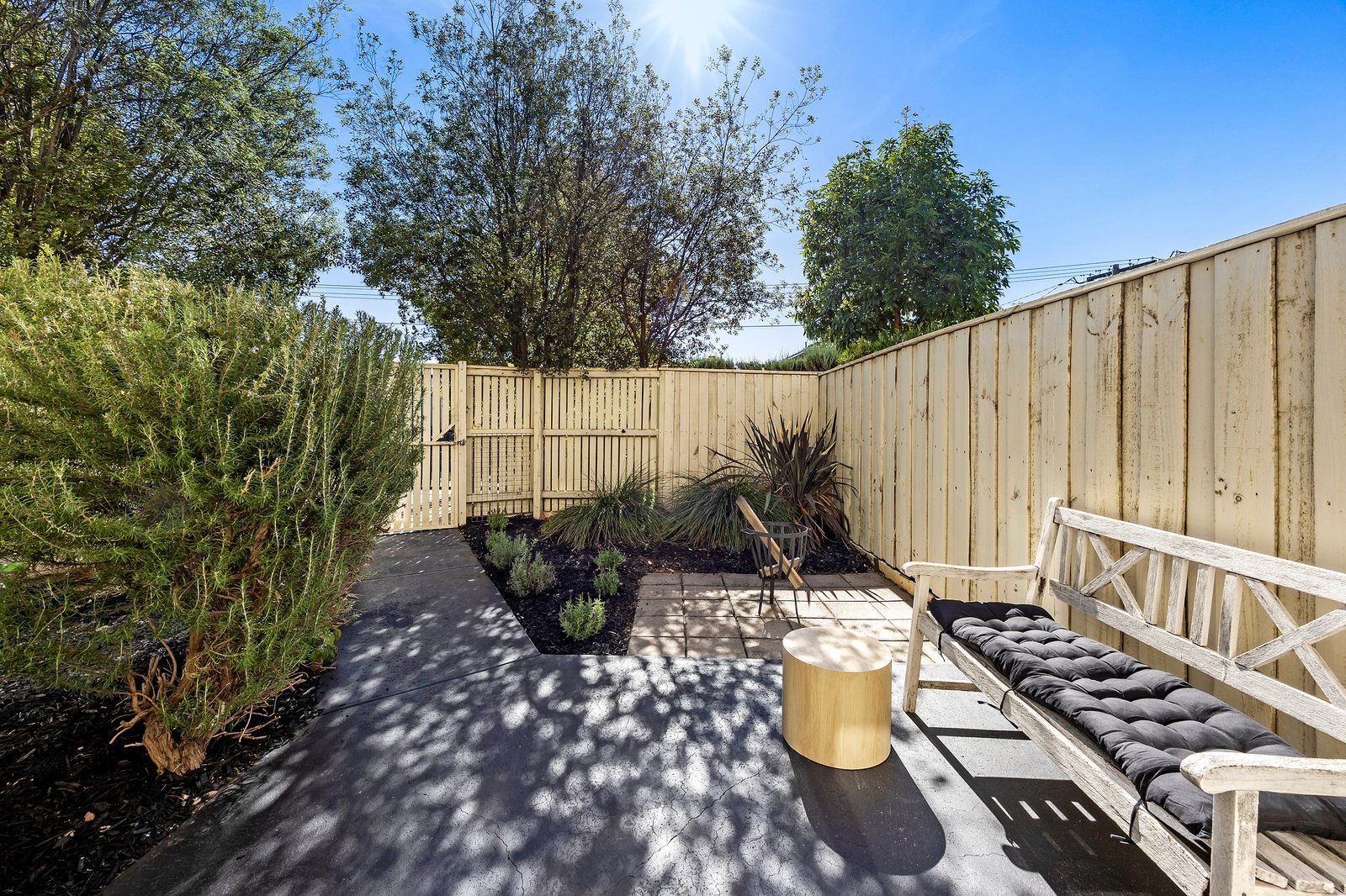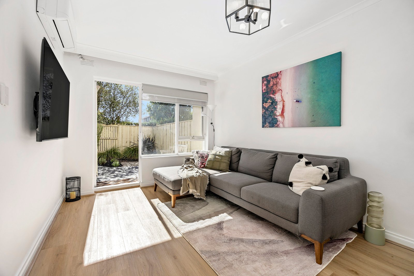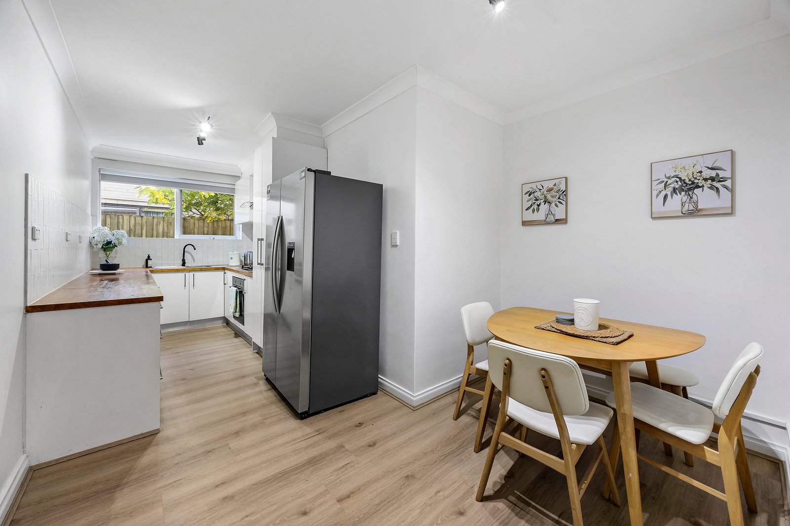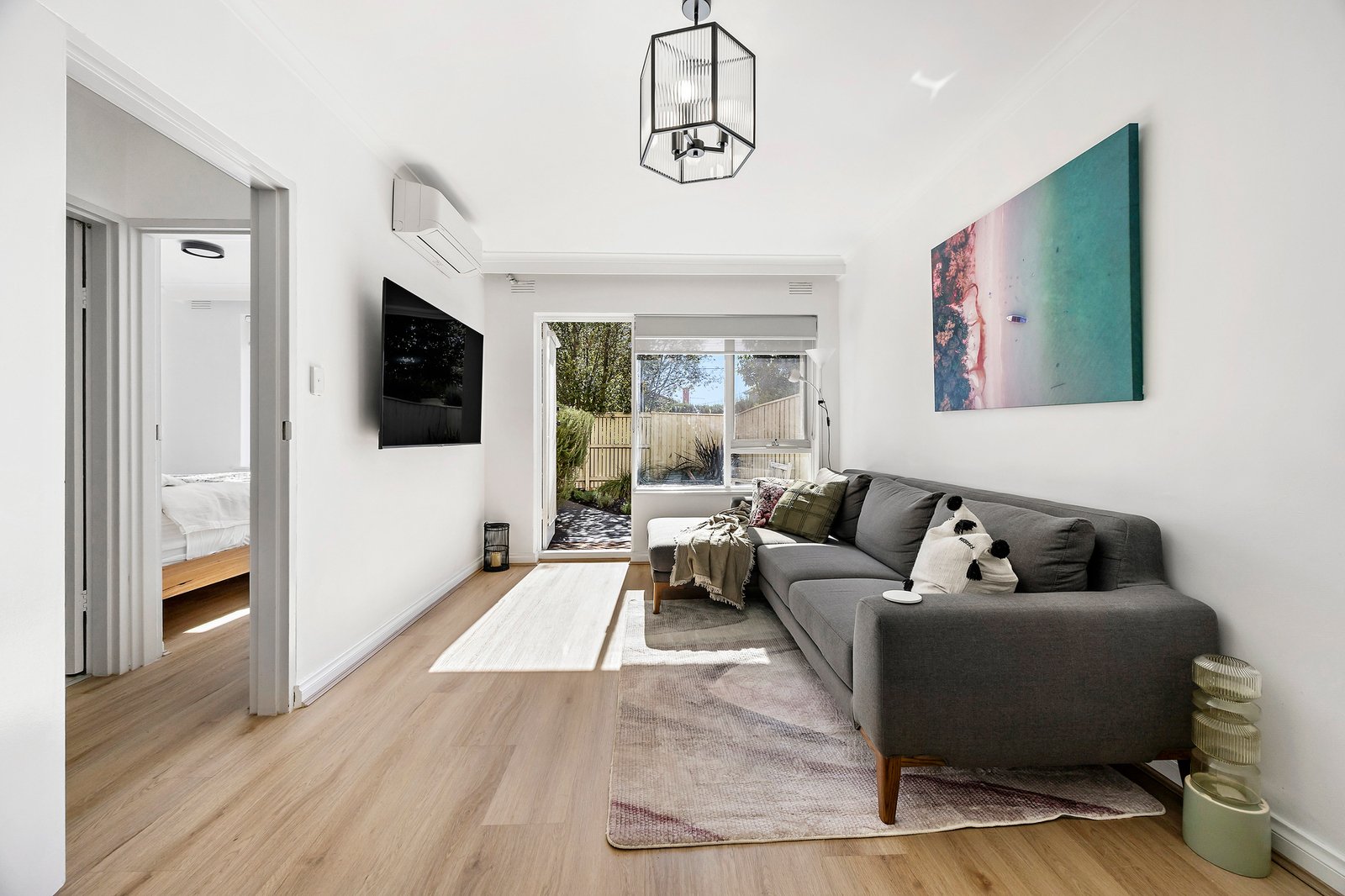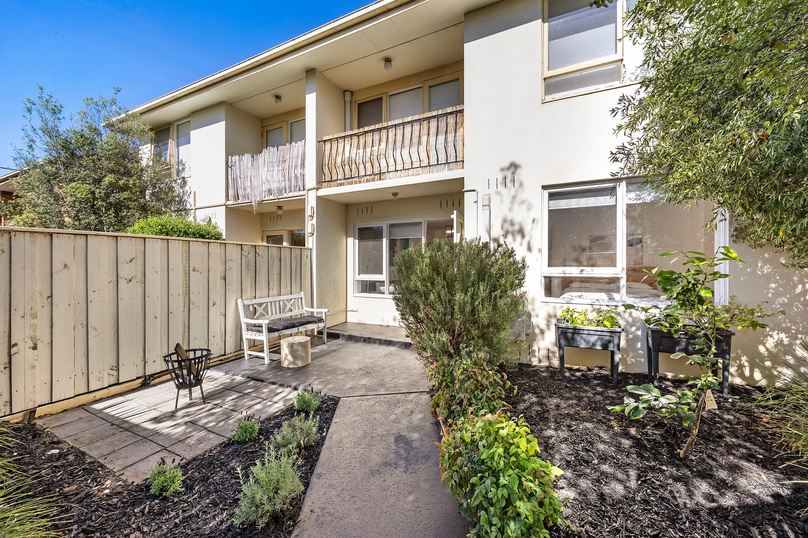 A light-filled, north-facing living area flows through to a separate meals space and well-appointed kitchen, creating a comfortable and practical everyday layout. Both bedrooms feature built-in robes and are serviced by a sleek central bathroom. A split system provides efficient heating and cooling, ensuring year-round comfort.