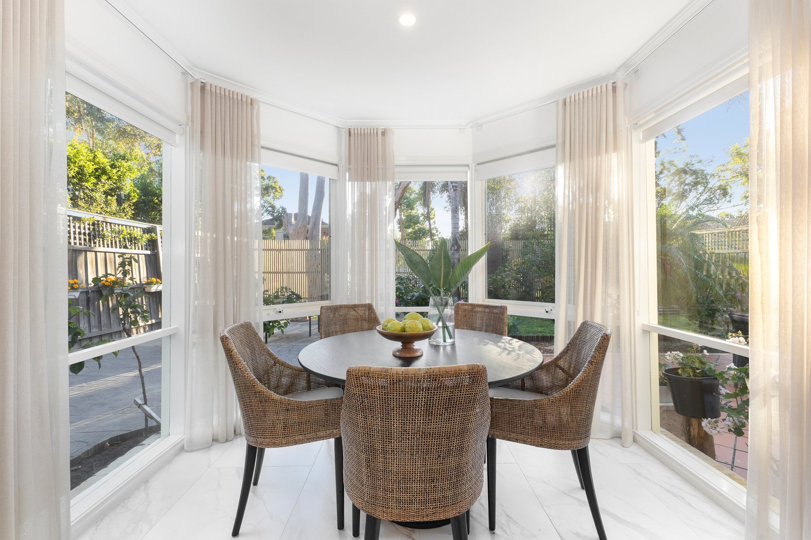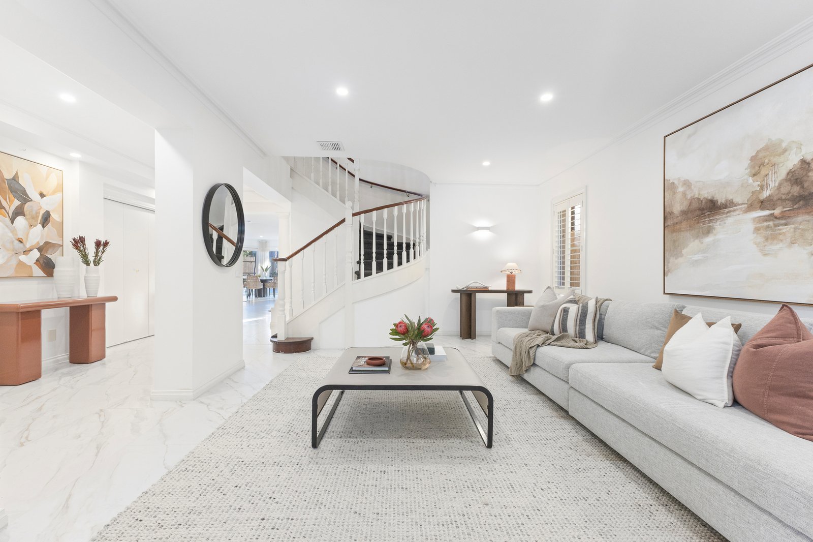 A soaring atrium introduces a vast, open-plan layout, where a spacious formal lounge enjoys a leafy outlook across the largely low-maintenance rose garden. A grand dining room sets the scene for refined occasions, while the fully appointed Miele kitchen caters to everyday ease. Across the rear, an elegant curved bay window frames a light-filled sitting area, alongside the granite kitchen and relaxed family zone, warmed by a gas log fire and bathed in afternoon sun.
